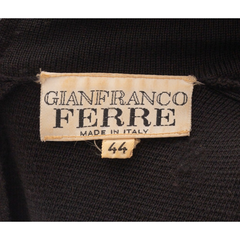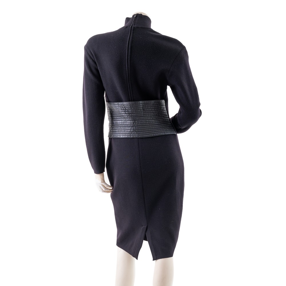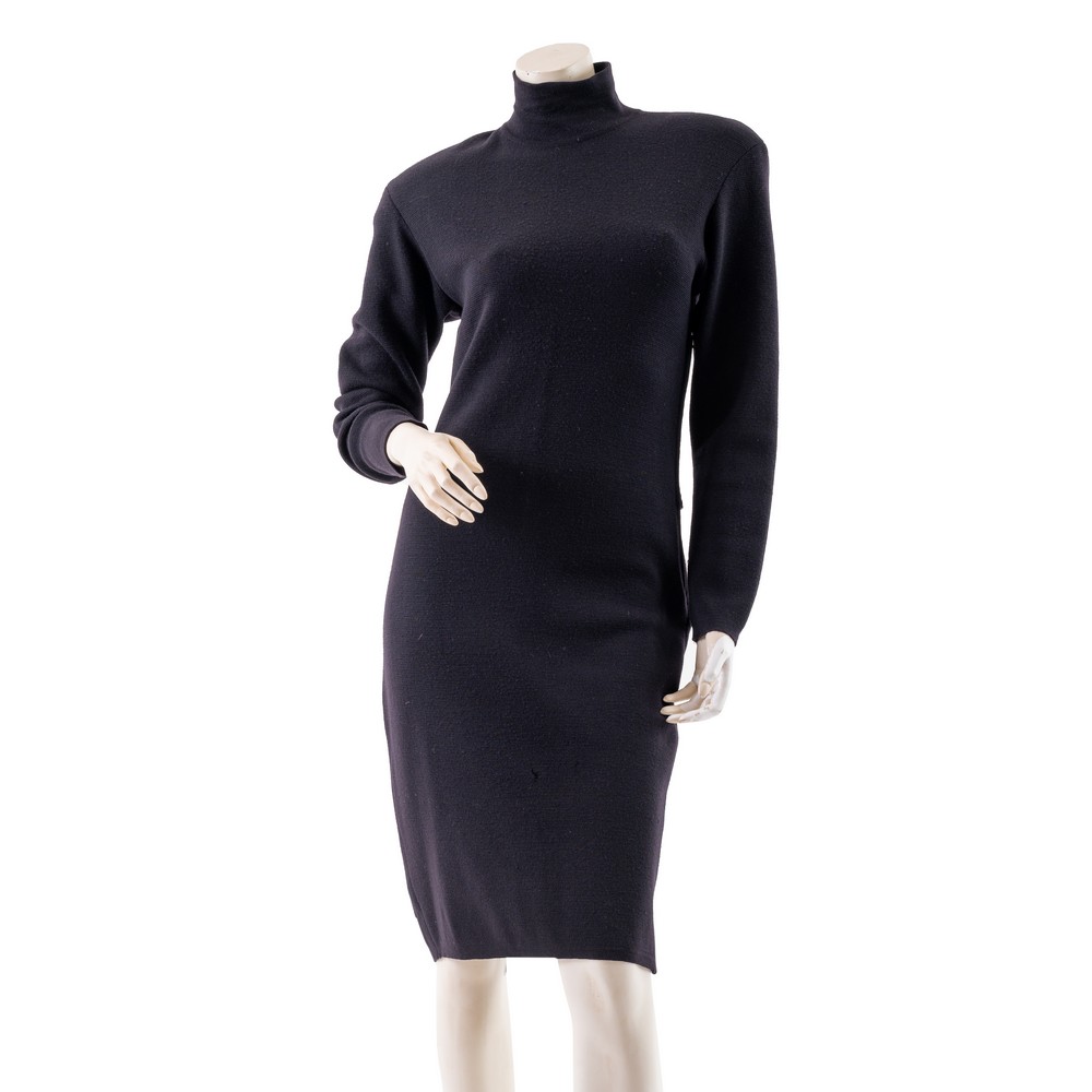 Abito in lana nera a collo alto e manica lunga, fascia posteriore sulla schiena. Etichetta di produzione. Taglia M.