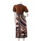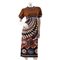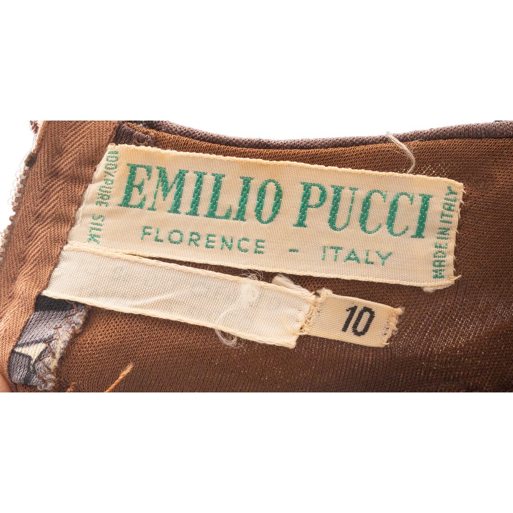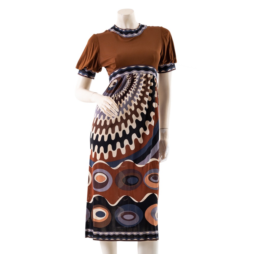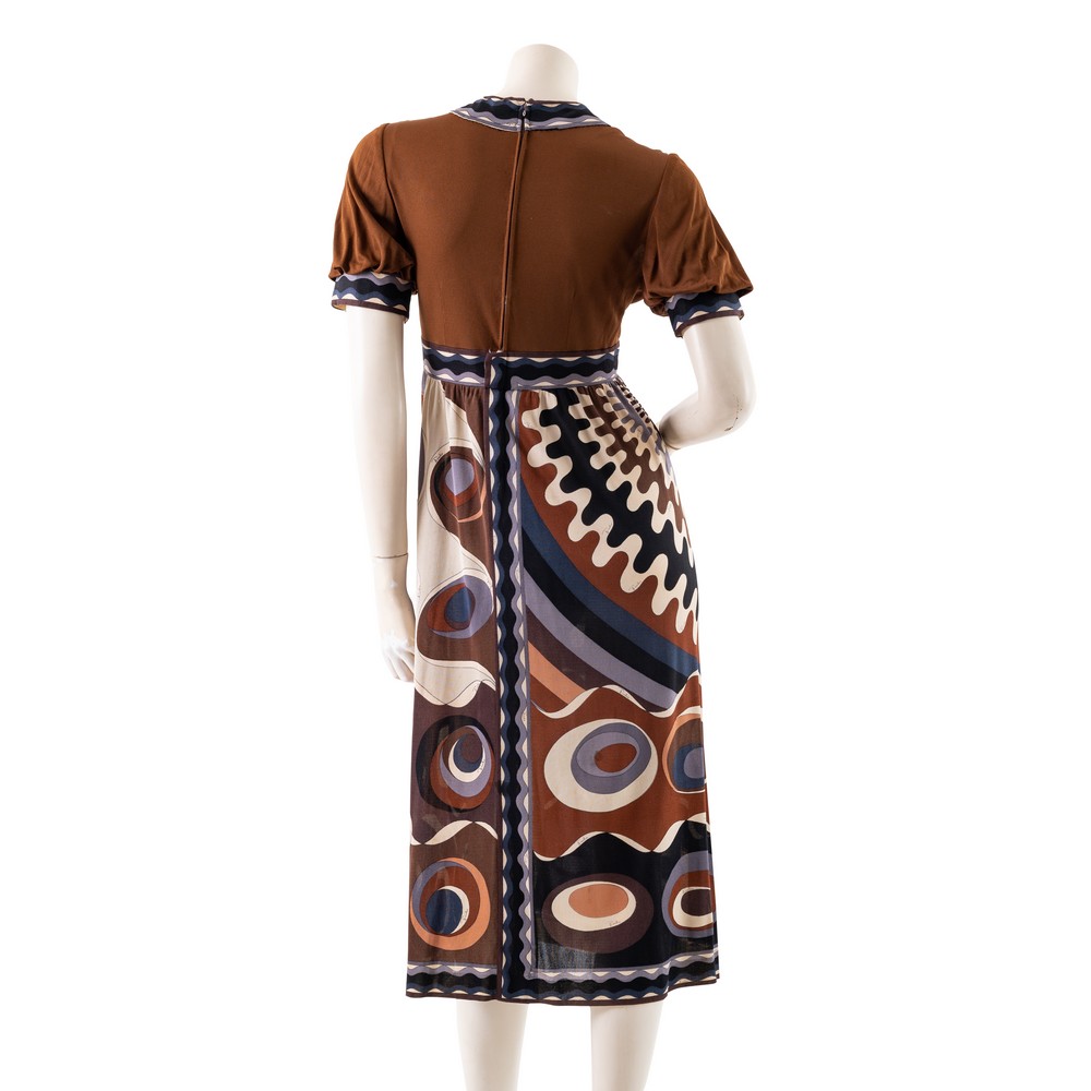 Abito in maglina di seta color cioccolato con stampa Emilio Pucci nei colori nero, bianco, marrone e grigio, taglio impero, mezza manica, collo tondo, cerniera posteriore. Etichetta di produzione. Taglia 10. Epoca: 1960 c.a.