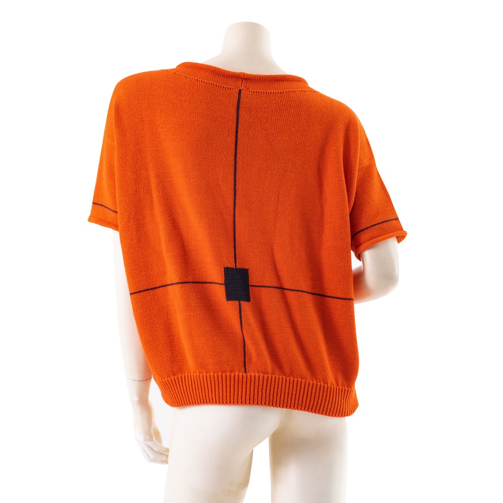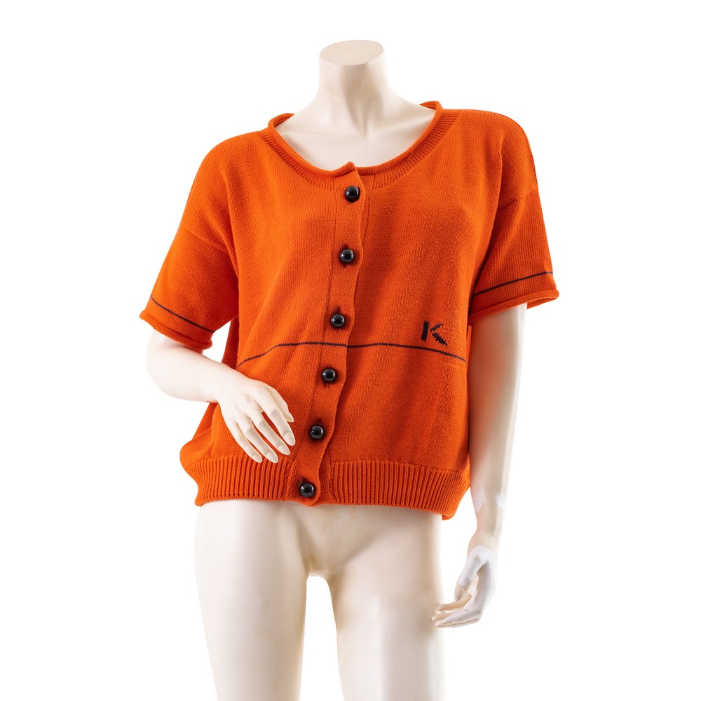 Cardigan in cotone corallo a mezza manica, abbottonatura centrale con grossi bottoni neri, logo sulla parte frontale. Etichetta di produzione. Taglia M.