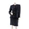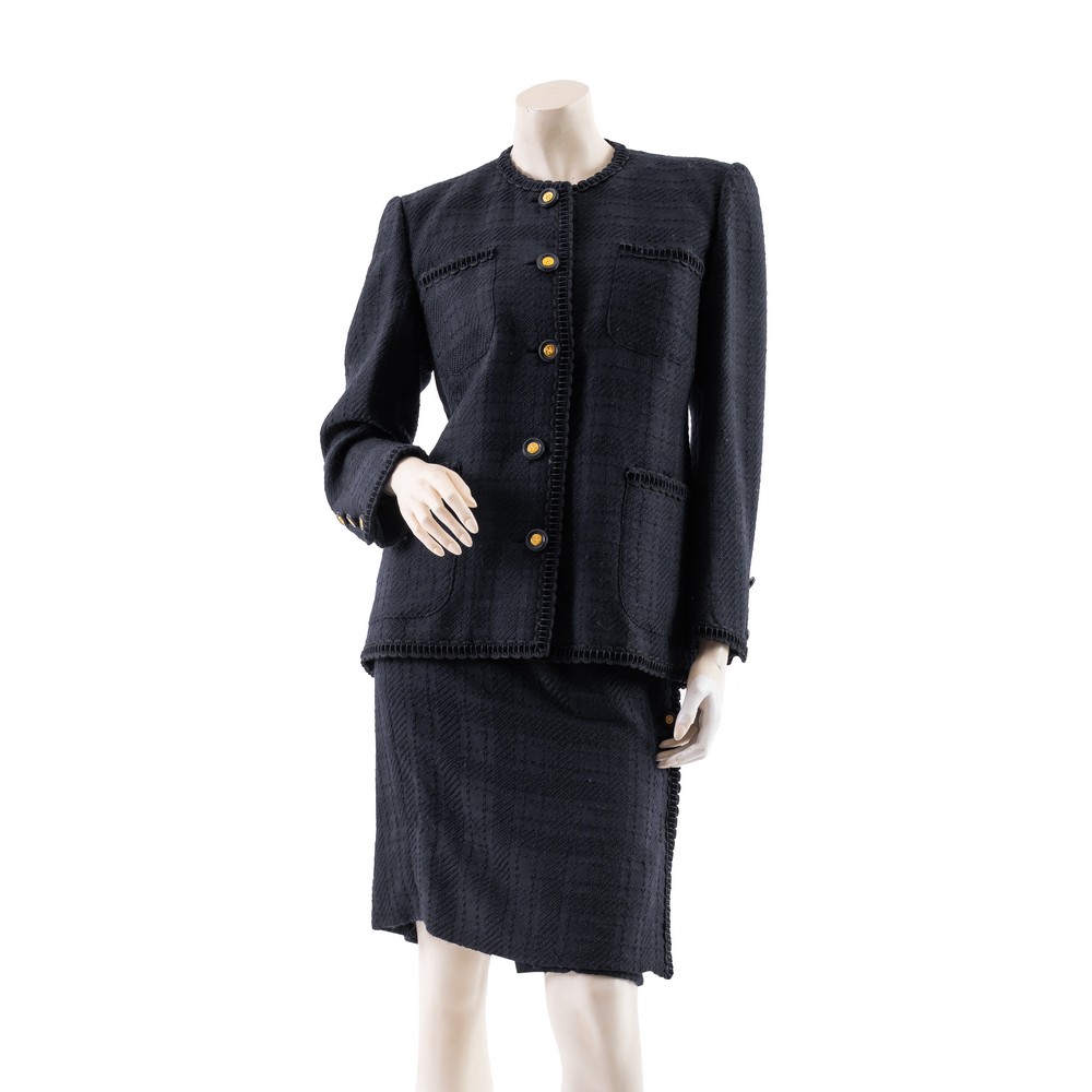 Un tailleur in boucle di lana blu composto da giacca con abbottonatura centrale e orli in passamaneria, una gonna retta. Taglia M.