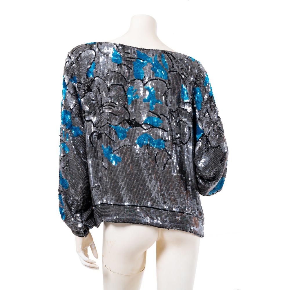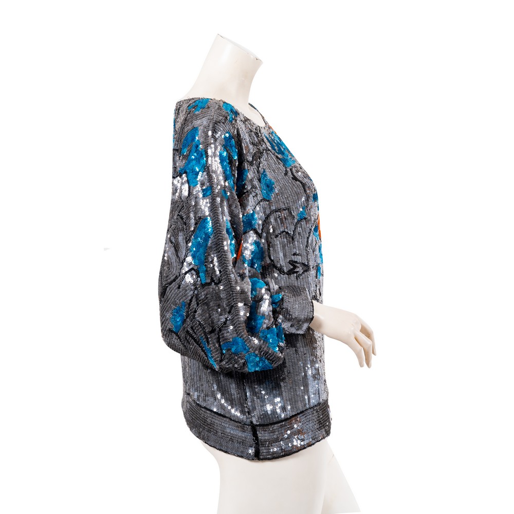 Maglia couture interamente lavorata con pagliette, fondo argento brunito con Hibiscus arancio becco d’oca, manica lunga a pipistrello e scollo a barca. Taglia M. Marchio di produzione.