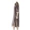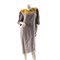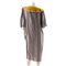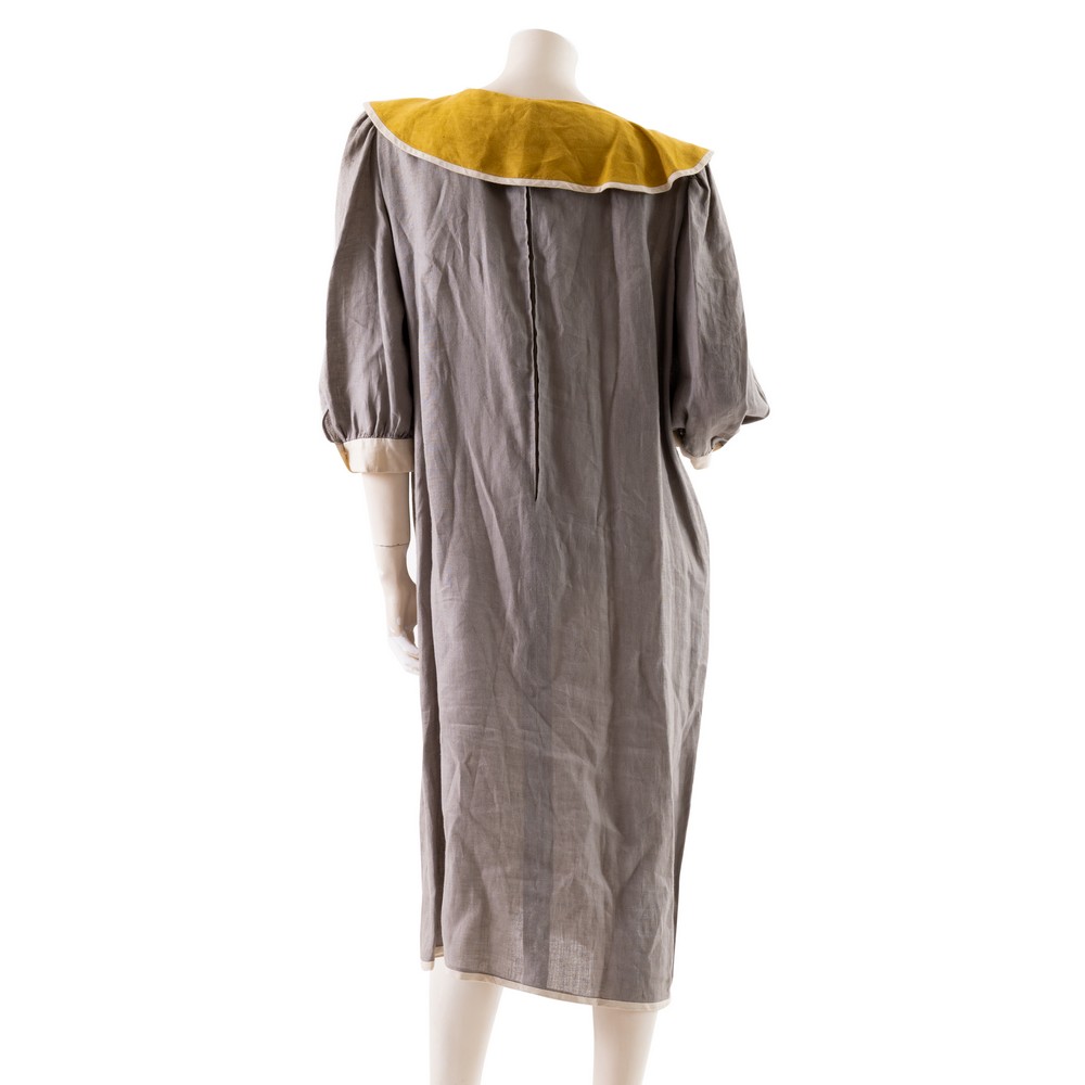 Abito in lino grigio e senape con ampio collo fermato da fiocco, manica a tre quarti. Etichetta di produzione. Taglia 46.