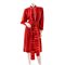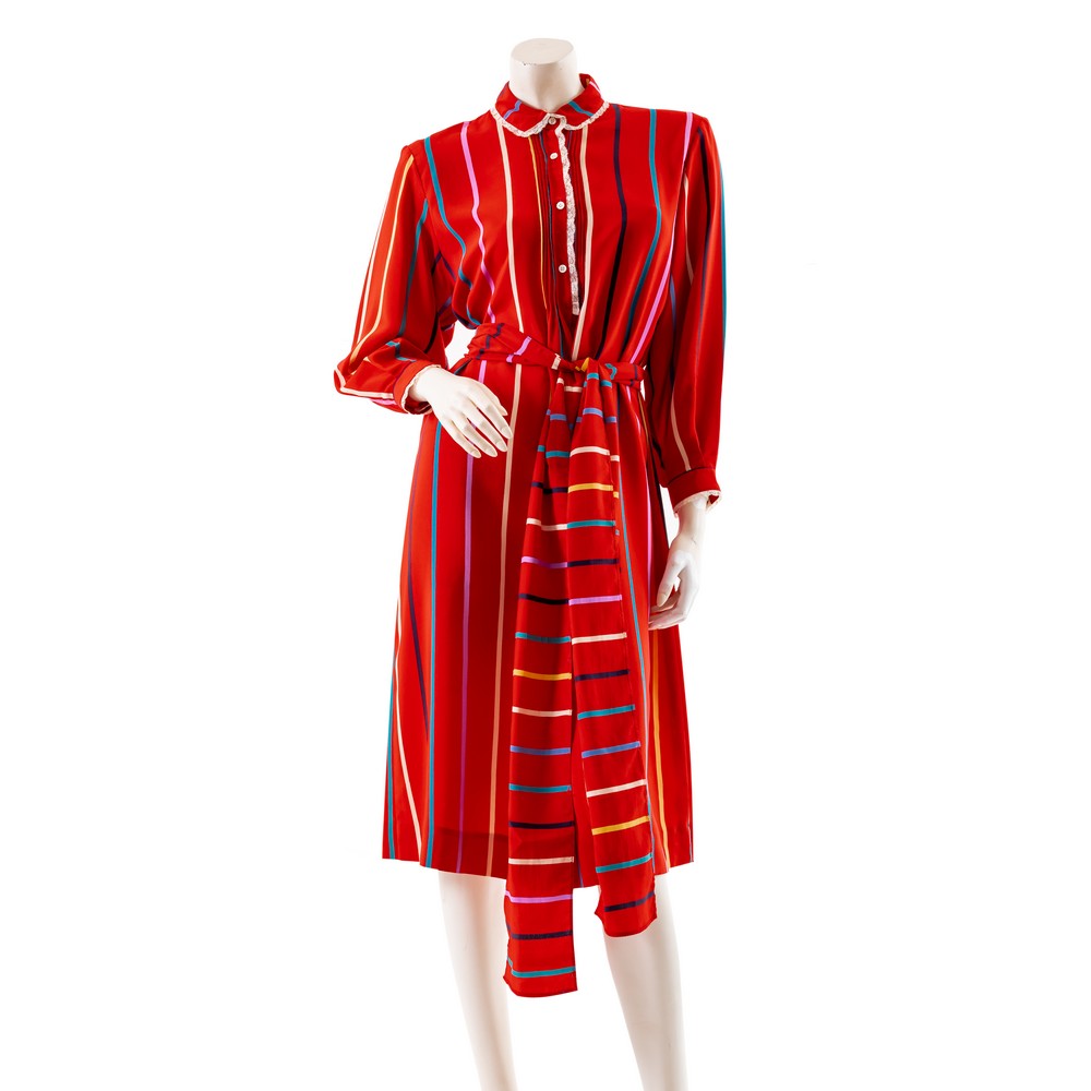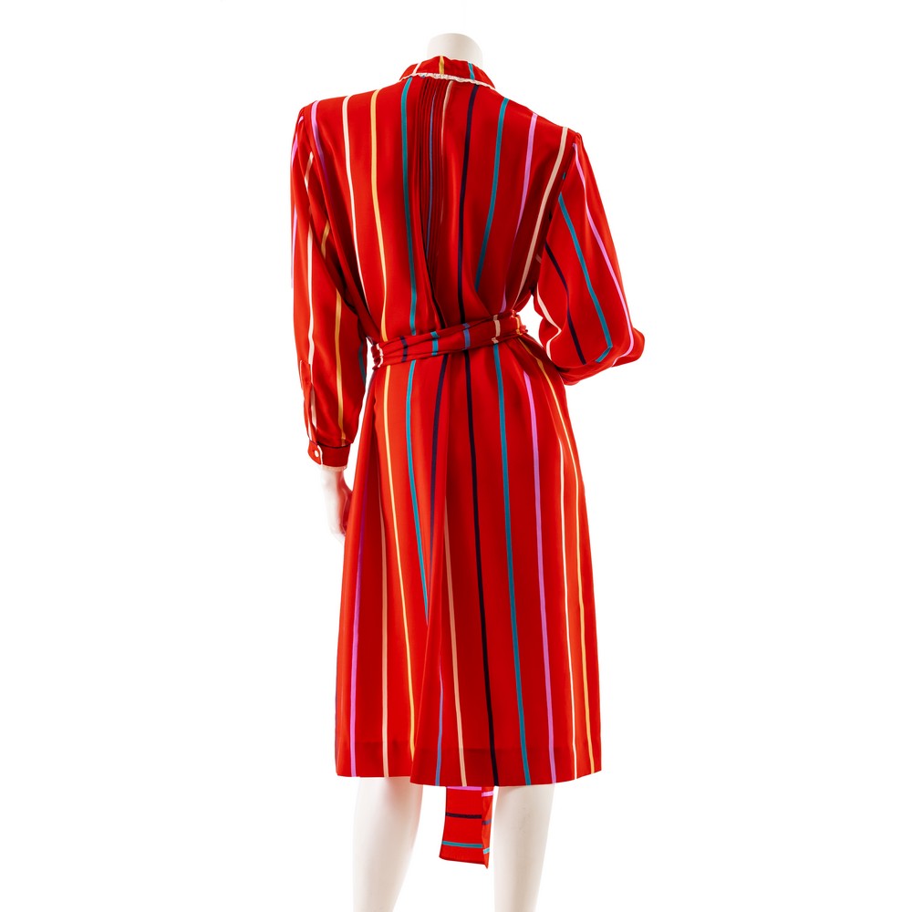 Abito in seta rosso a righe multicolor, manica lunga, abbottonatura anteriore, collo in pizzo, cintura in seta. Taglia M.