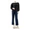 Una maglia in fettuccia di pelle nera, collo a barca, maniche ampie con lavorazione a rete. Taglia M.