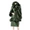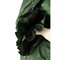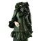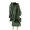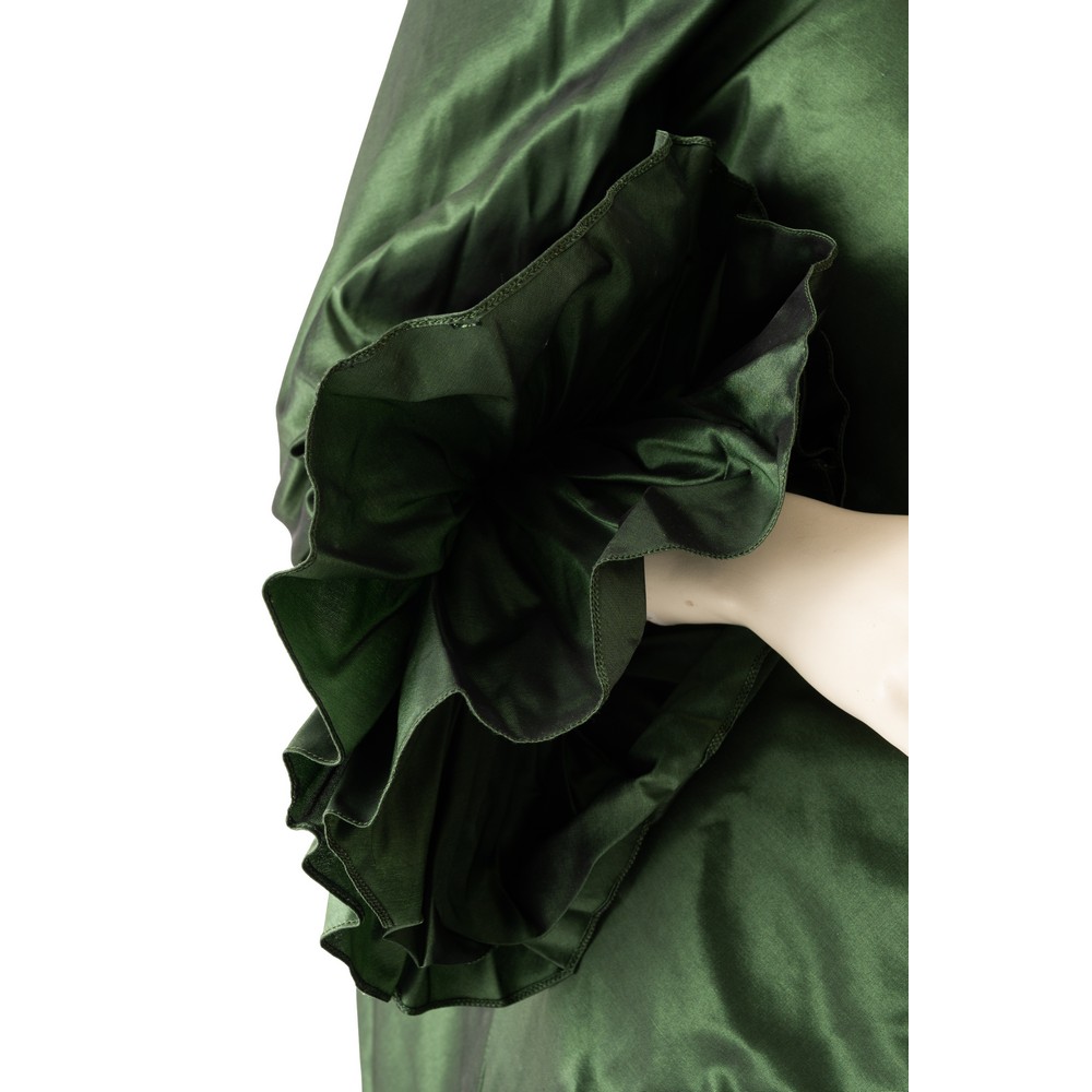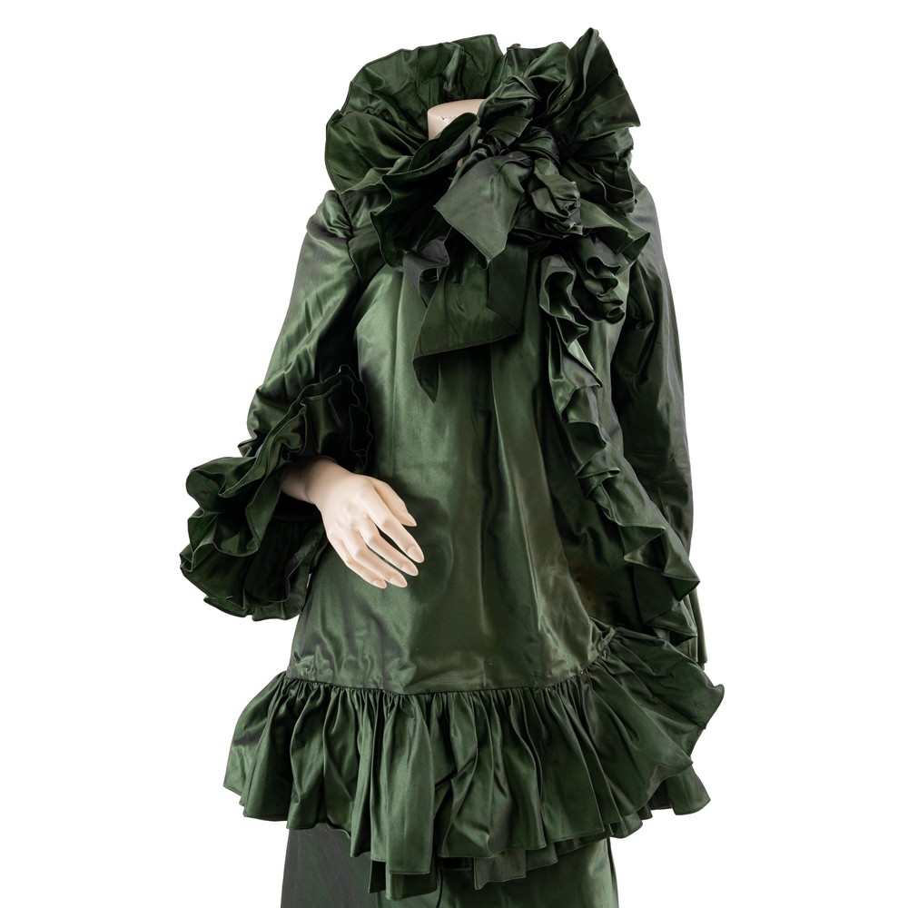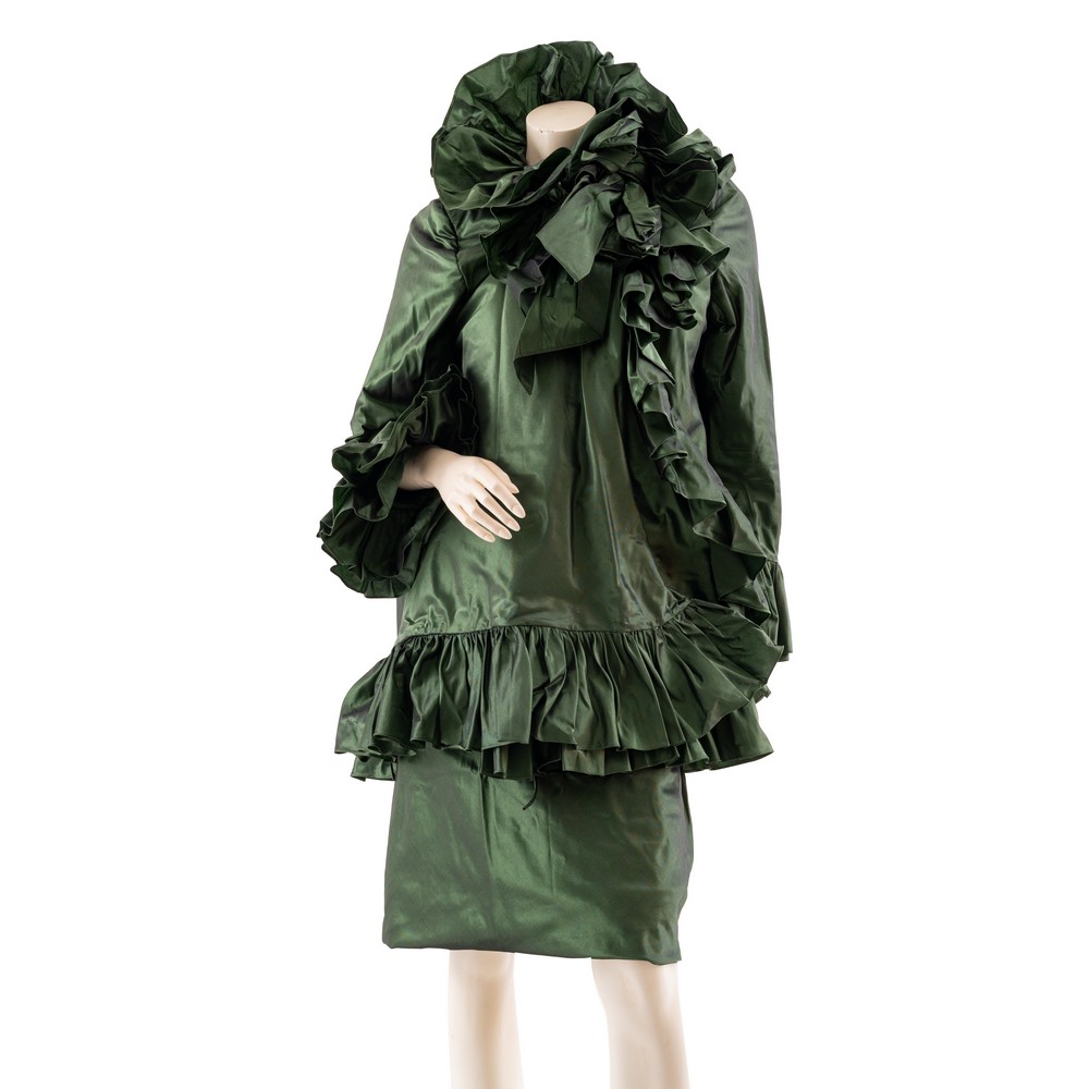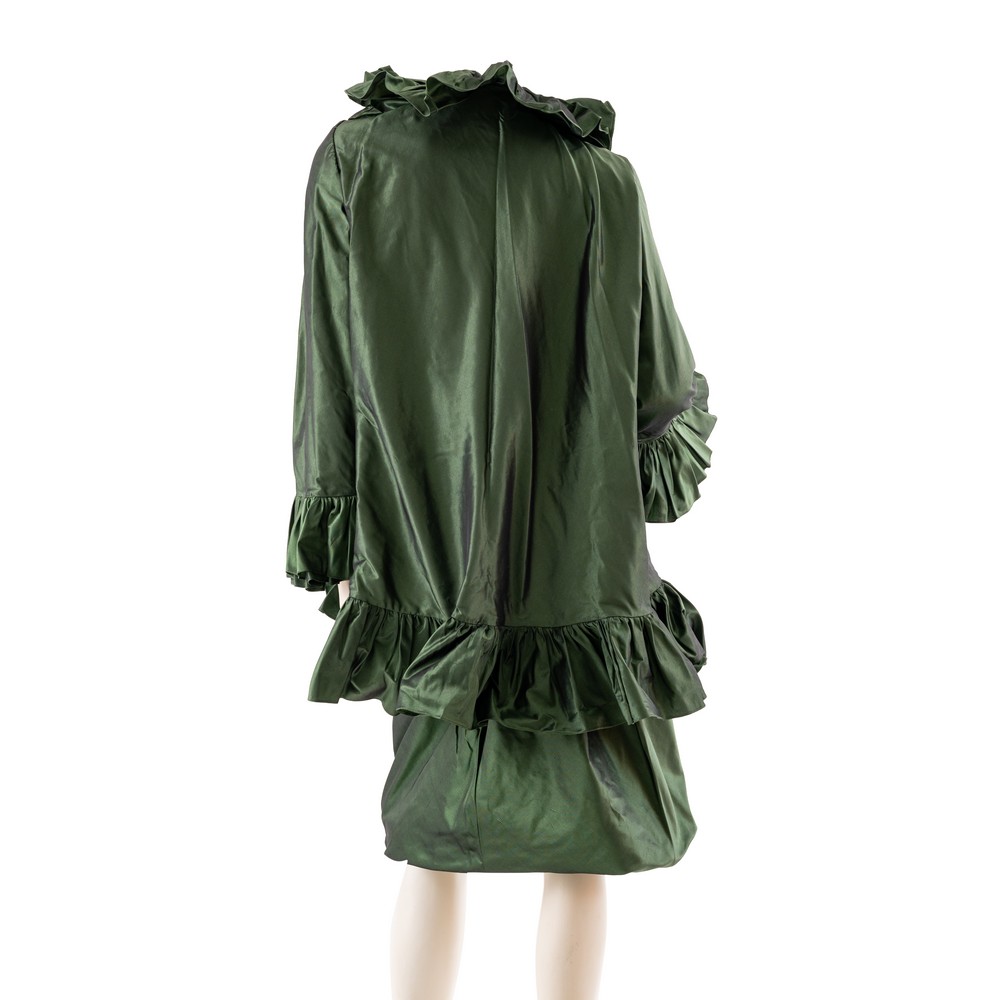 TAILLEUR in seta verde bottiglia composto da giacca con rouches sui bordi e montate lateralmente fino al collo, grade fiocco a chiusura, maniche con ruoches . Bottone a pressione mancate. Taglia L. Epoca: 1980 c.a.