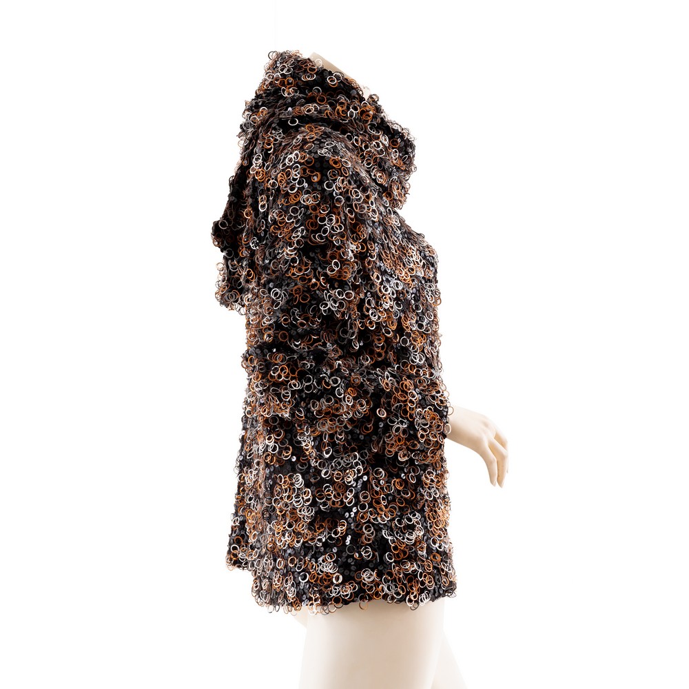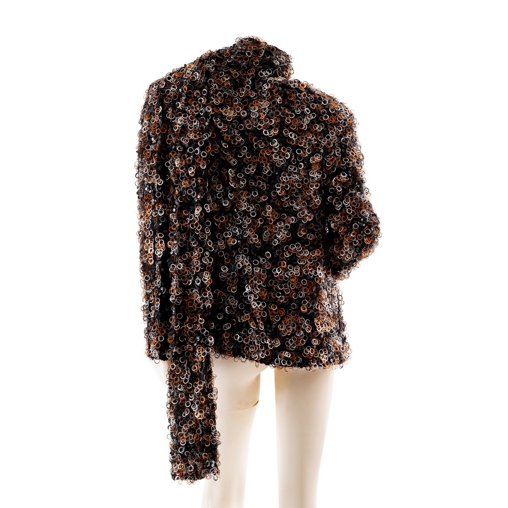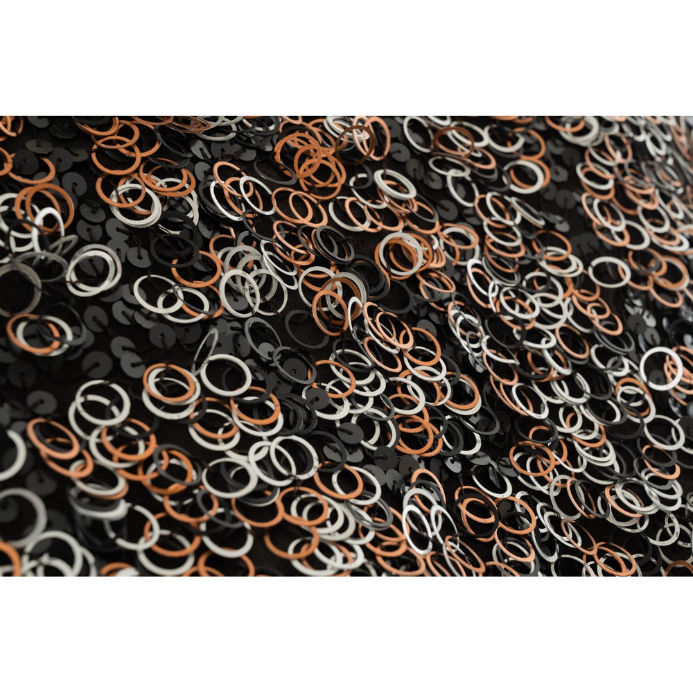 Maglia interamente lavorata ad anelli metallici colore nero rame e argento su supporto in tessuto nero. Taglia L.