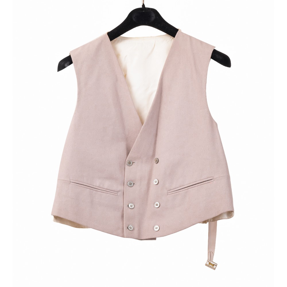 Thight tre pezzi, giacca in panno di lana grigia, gilet grigio perla con bottoni in madreperla, pantalone grigio gessato nero. Taglia sartoriale.