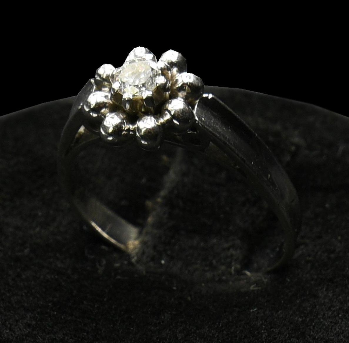 anello solitario con al centro diamante rotondo taglio a brillante di ct 0,18 circa incastonato in montatura a corolla