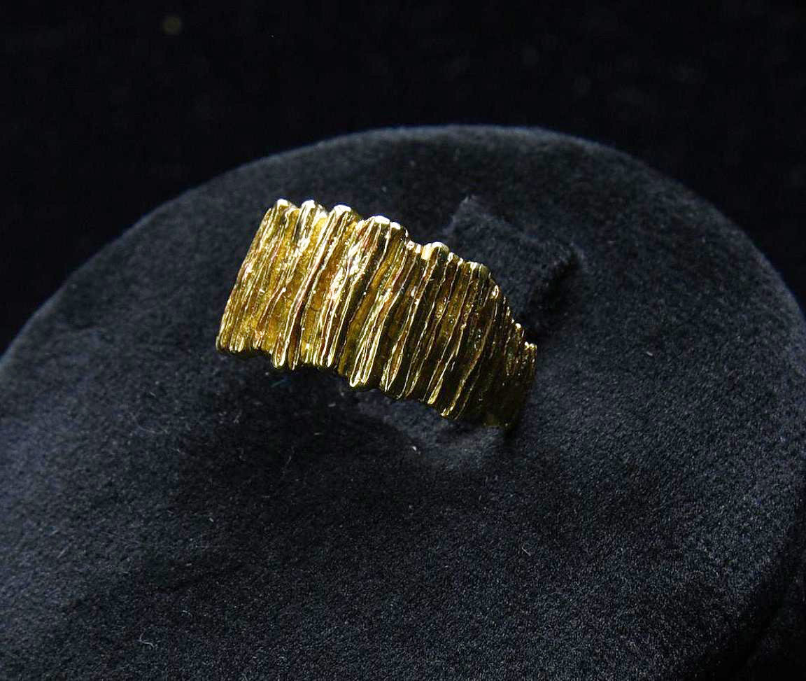 Anello in oro a fascia con decorazione zigrinata, punzone 750 visibile sulla superficie interna, misura 17