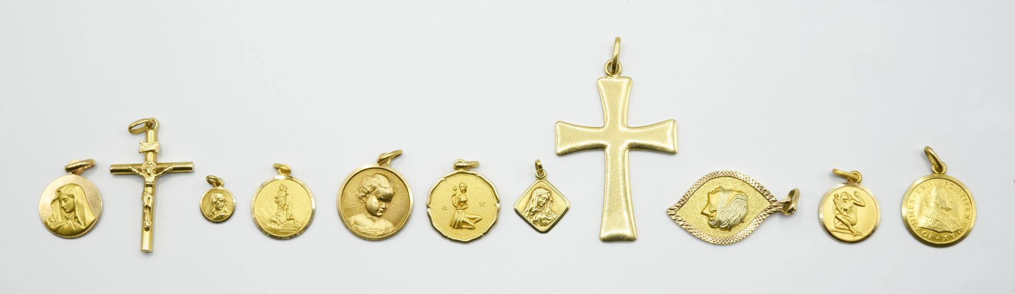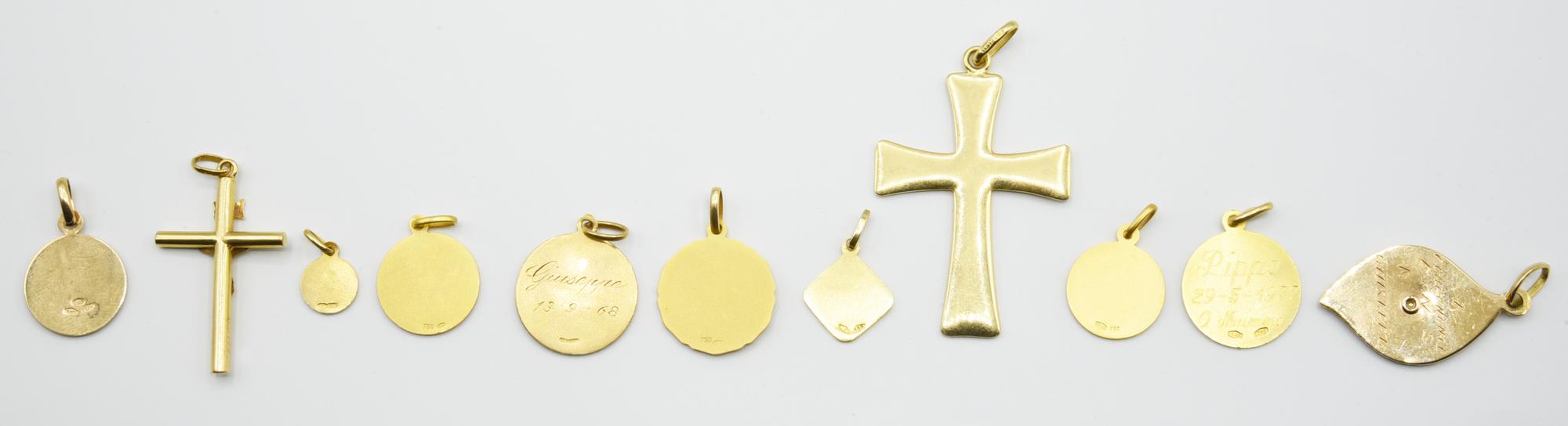 Lotto 36 | LOTTO DI UNDICI PENDENTI nove medagliette e due piccole croci Oro giallo 18K,...