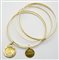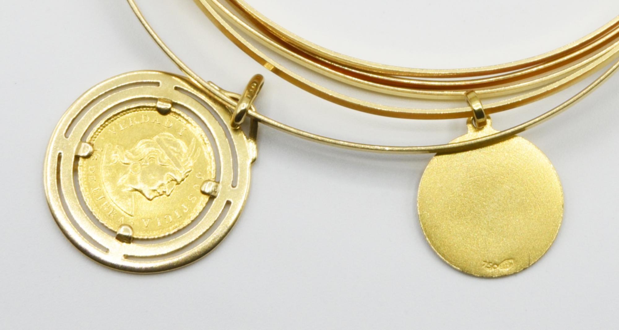 bracciale a cinque cerchi rigidi, con due piccoli pendenti, di cui una moneta 1/5 de libra peruviana