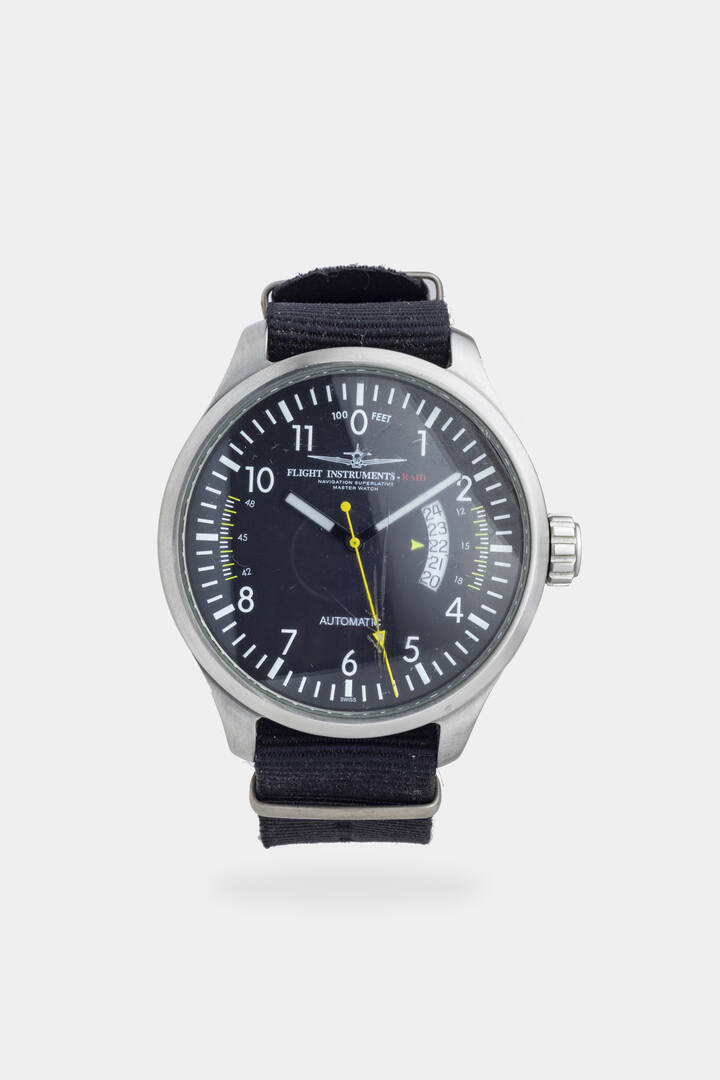 Cassa in acciaio con fondello a vista. Quadrante nero con indici e numeri arabi serigrafati, datario al 3 e altimetro che funziona mediante lancetta gialla.