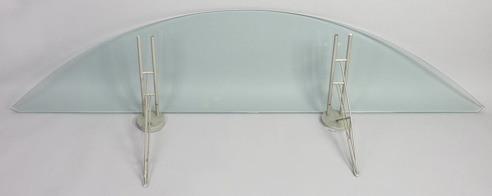consolle di forma semi-ovale a muro, con struttura in metallo e ripiano in vetro