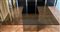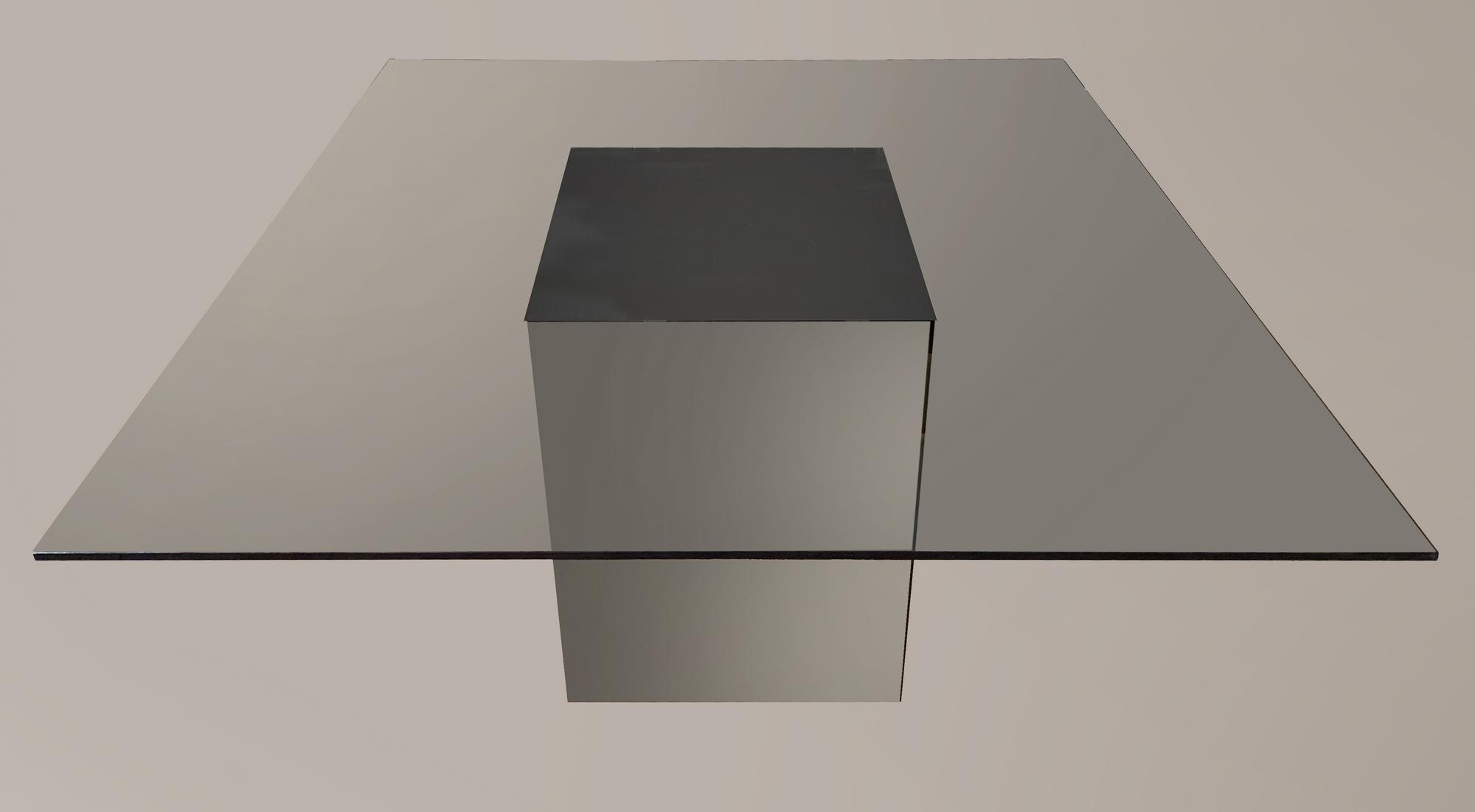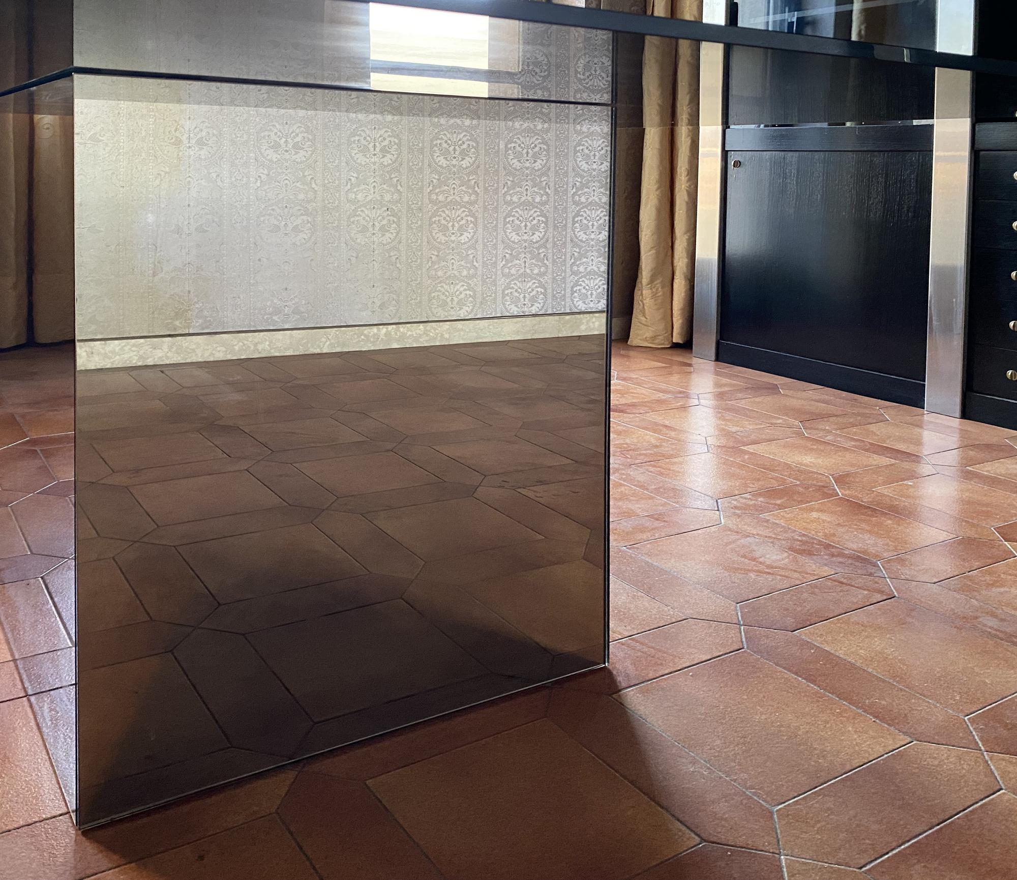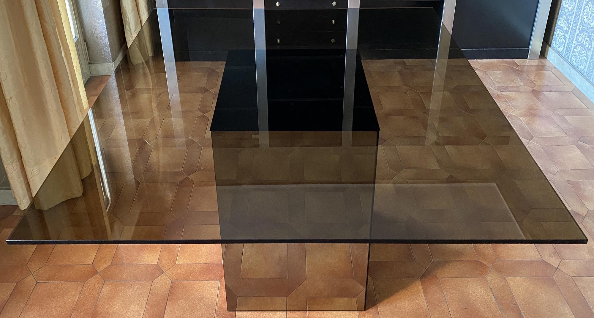 tavolo con struttura in metallo bronzato e ripiano in cristallo molato