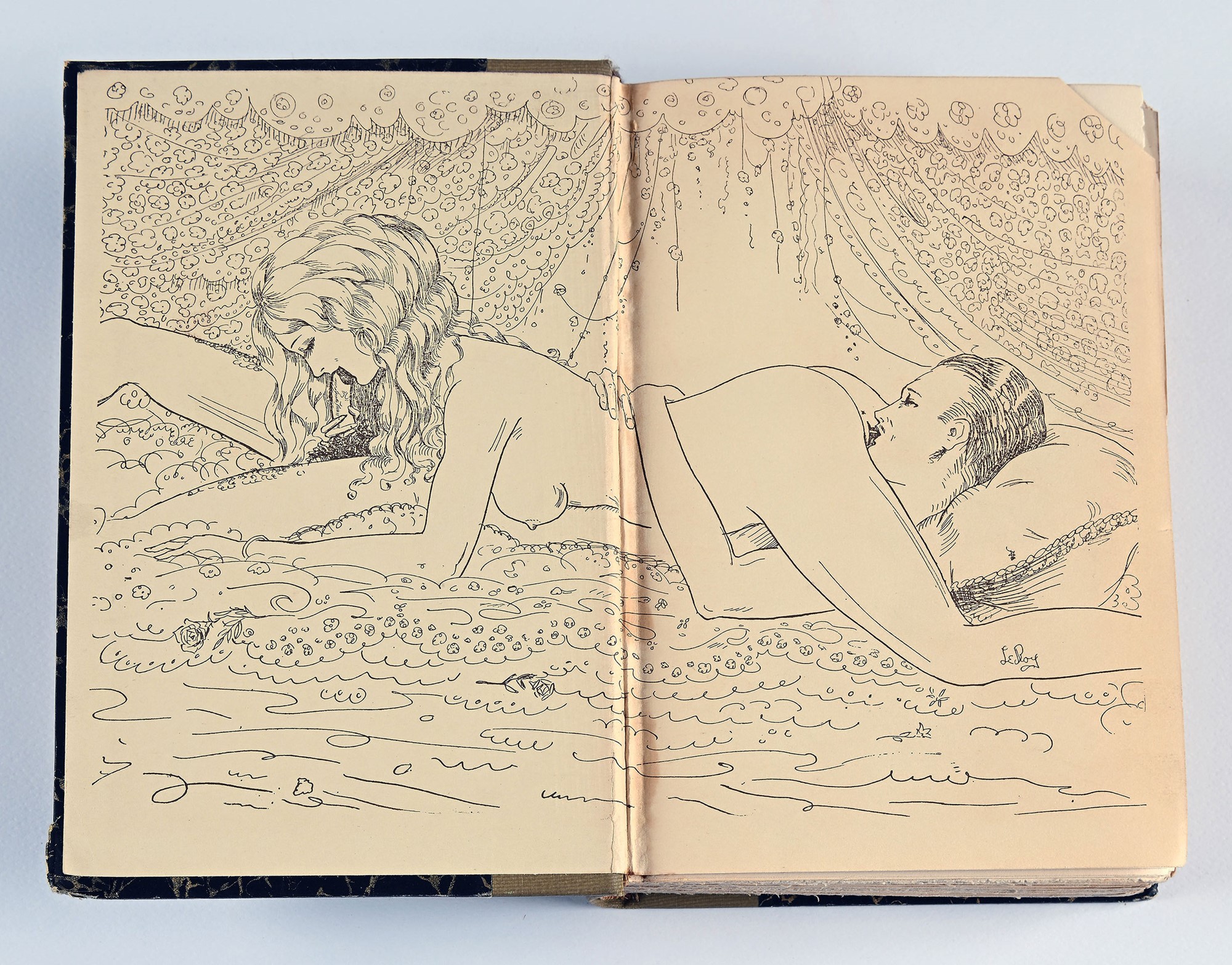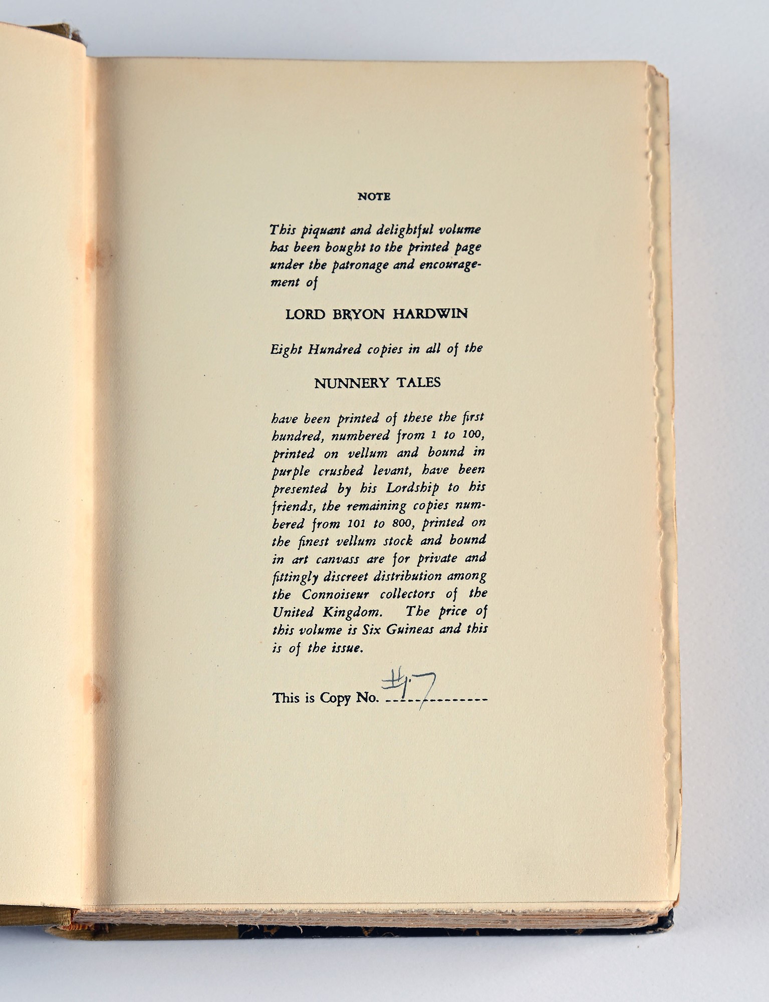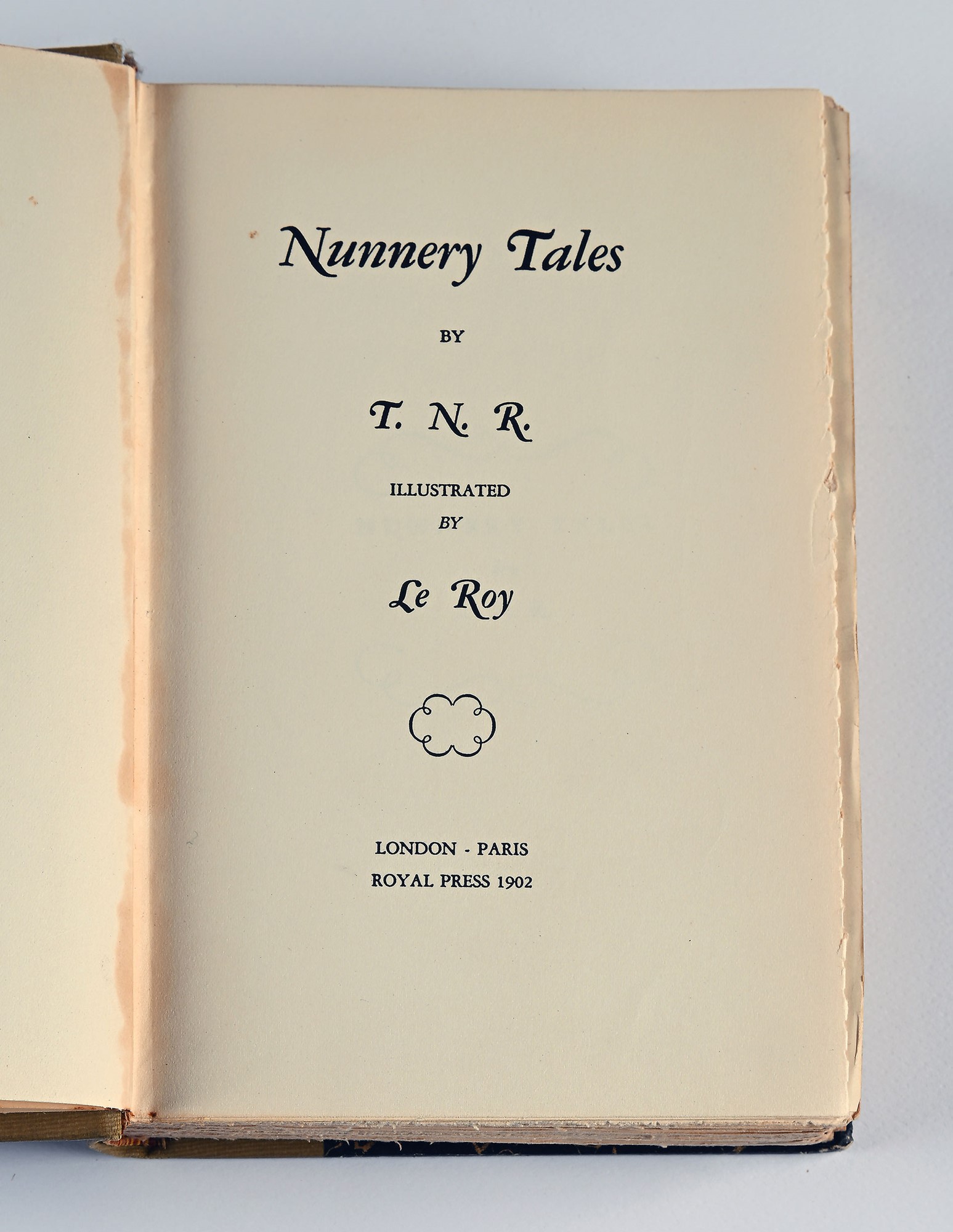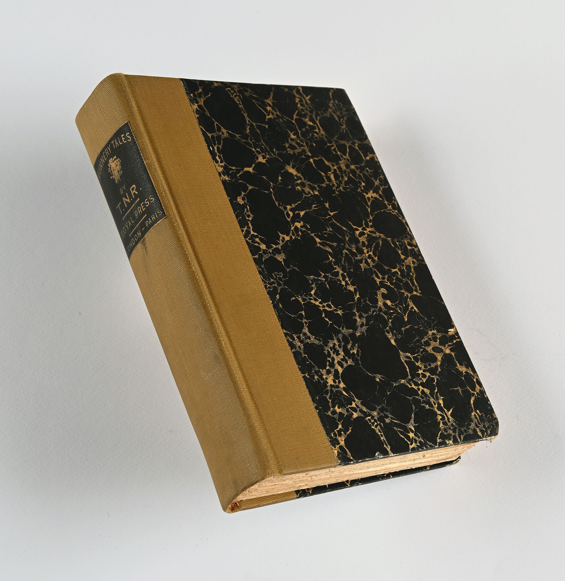 T. N. R. - NUNNERY TALES 1 vol. mm. 215X150, pp. 399 + 5 tavv. ill. f.t. Legatura ed. mz tela, con tit. in oro al dorso, taglio sup. col., risguardi illustrati. Gemma clandestina del 1935, con falsa data di stampa tra le più rare dell’erotismo illustrato anglosassone. Edizione numerata (es. 17/800) ornata con cul-de-lamps nel testo e 5 tavole erotiche di Le Roy a piena pagina. Testo a stampa 1902, Londra-Parigi, Royal Press mm 215X150