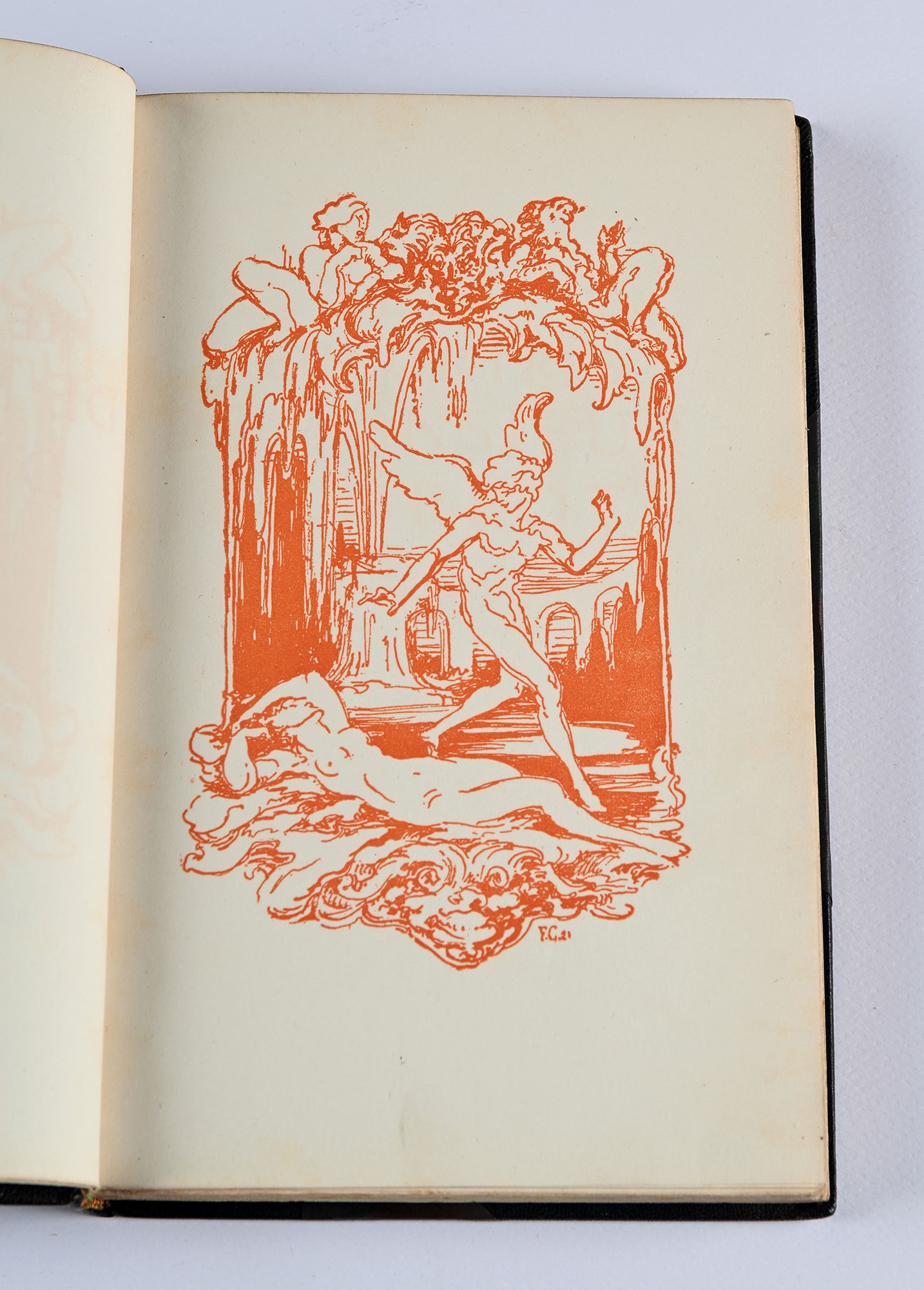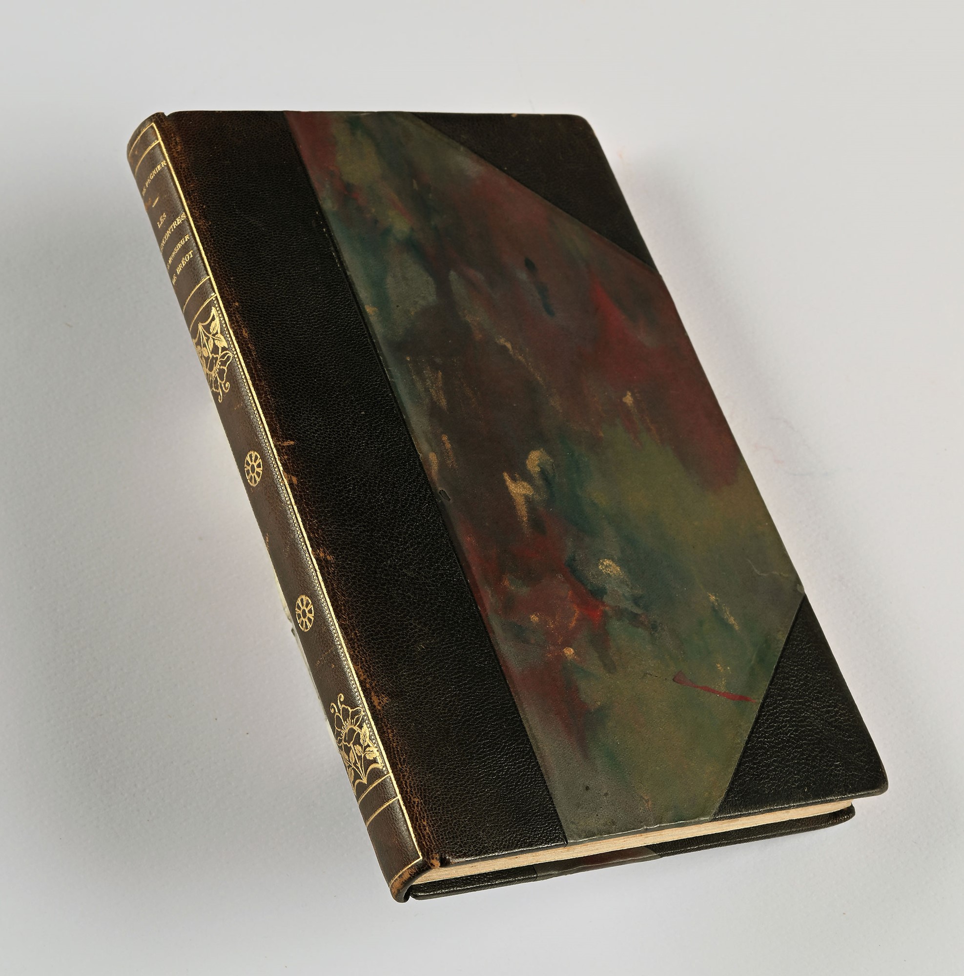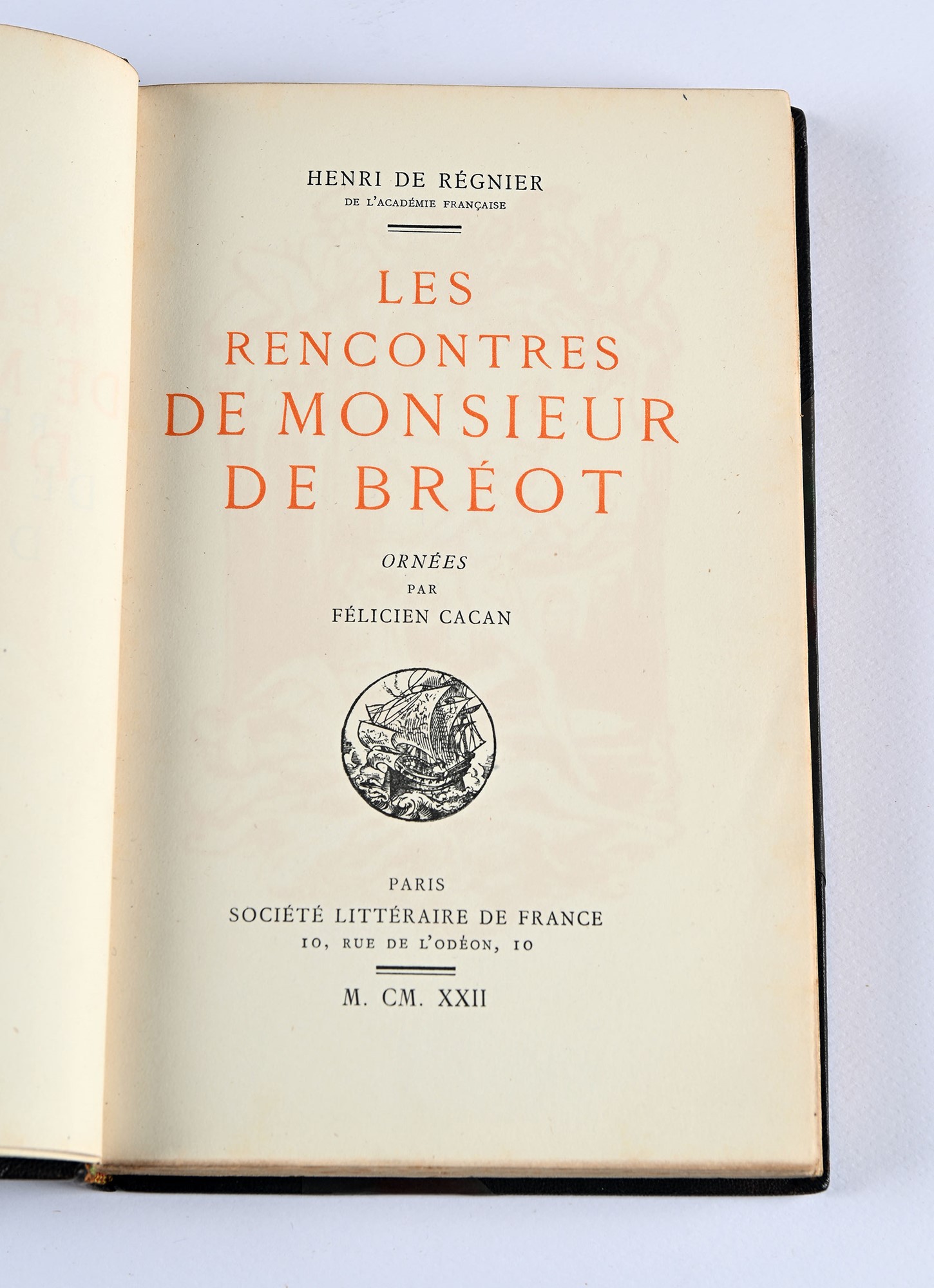 Régnier, Henri de - LES RENCONTRES DE MONSIEUR DE BRÉOT 1 vol. Leg. art. pp. [12]-175-[5]. Edizione numerata, es. n. 1217/1250. Con vignette di Félicien Cacan impresse a col. nel testo. Bella legatura artistica in mezza pelle con angoli, raffinati fregi in oro al dorso. Testo a stampa 1922, Paris, Société littéraire de France mm 230x145