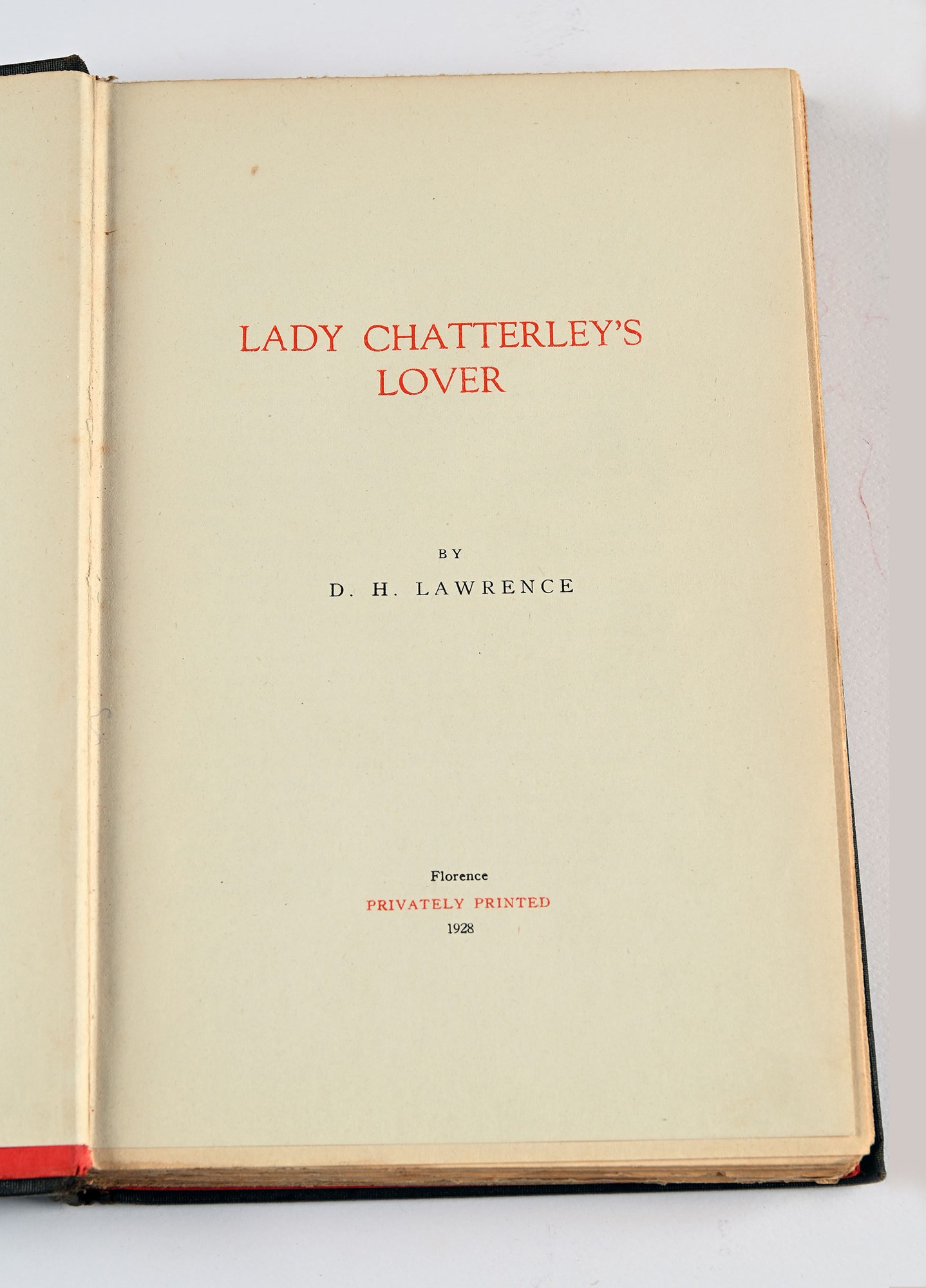 Lawrence, D. H. - LADY CHATTERLEY’S LOVER 1 vol. mm. 250X170, pp. [4]-365-[3]. Legatura ed. piena tela, titoli su tassello cartaceo al dorso. Esemplare con ex-libris in ideogrammi applicato al contropiatto e una romantica dedica manoscritta. Testo a stampa 1928, Firenze, edizione privata mm 250X170