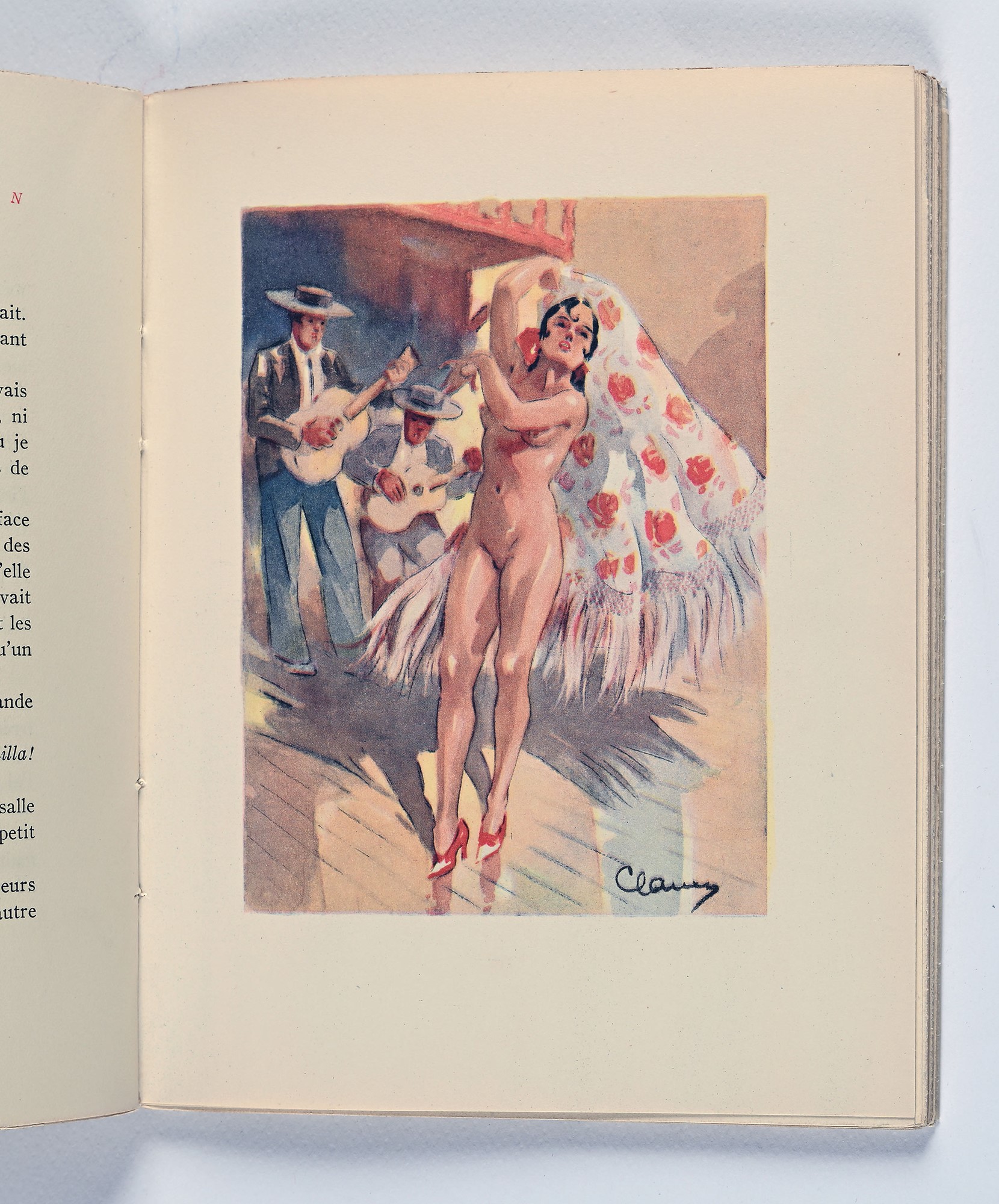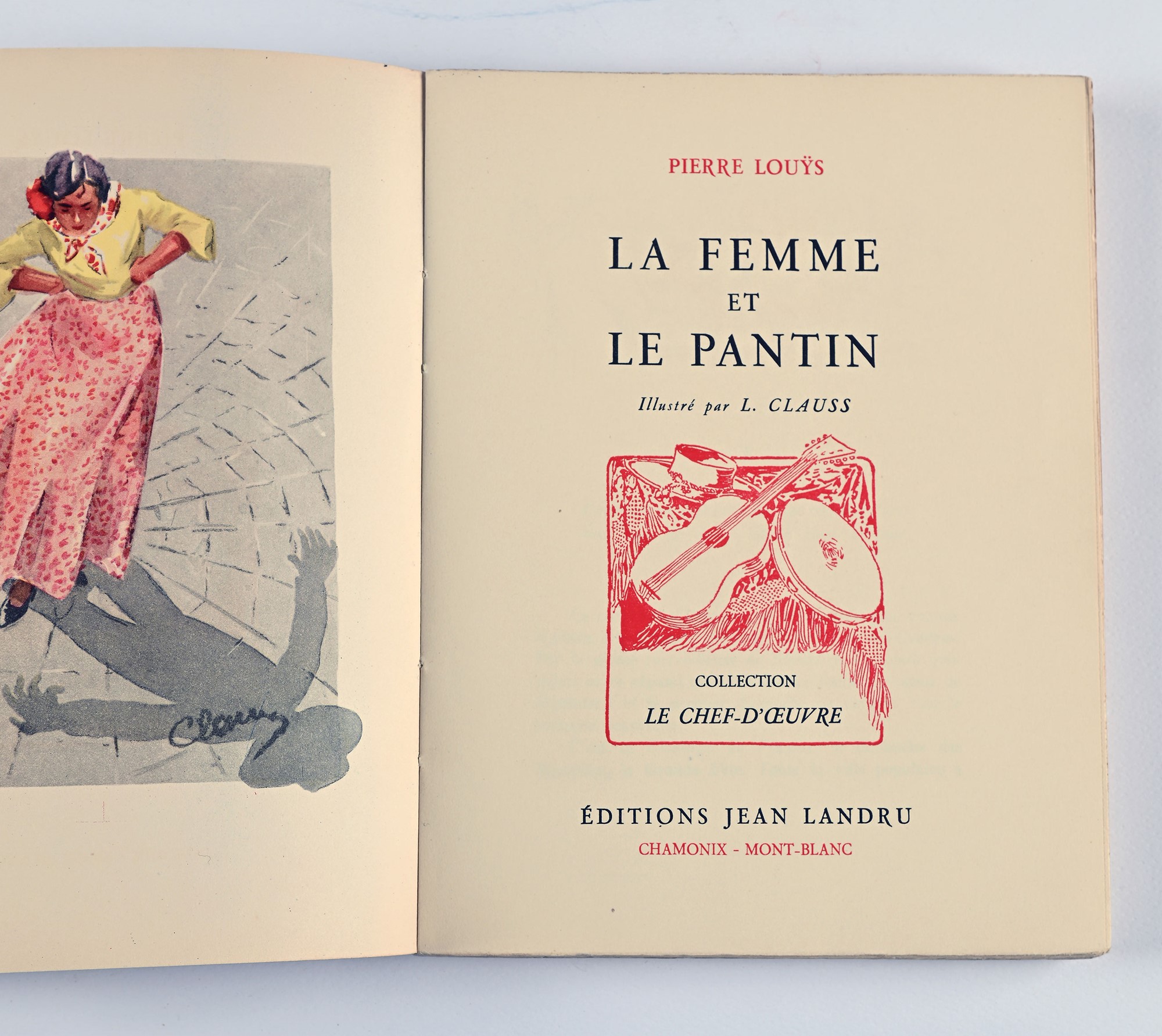 Louÿs, Pierre - LA FEMME ET LE PANTIN 1 vol. Bross. ed. con pergamino. pp. 148 n. + tavv. ill. Collection Le chef-oeuvre. Illustrazioni di L. Clauss. Edizione numerata, esemplare n. 3113 con tav. lit. a col.; testo impresso a colori. Testo a stampa 1946, Chamonix-Mont Blanc mm 215x170