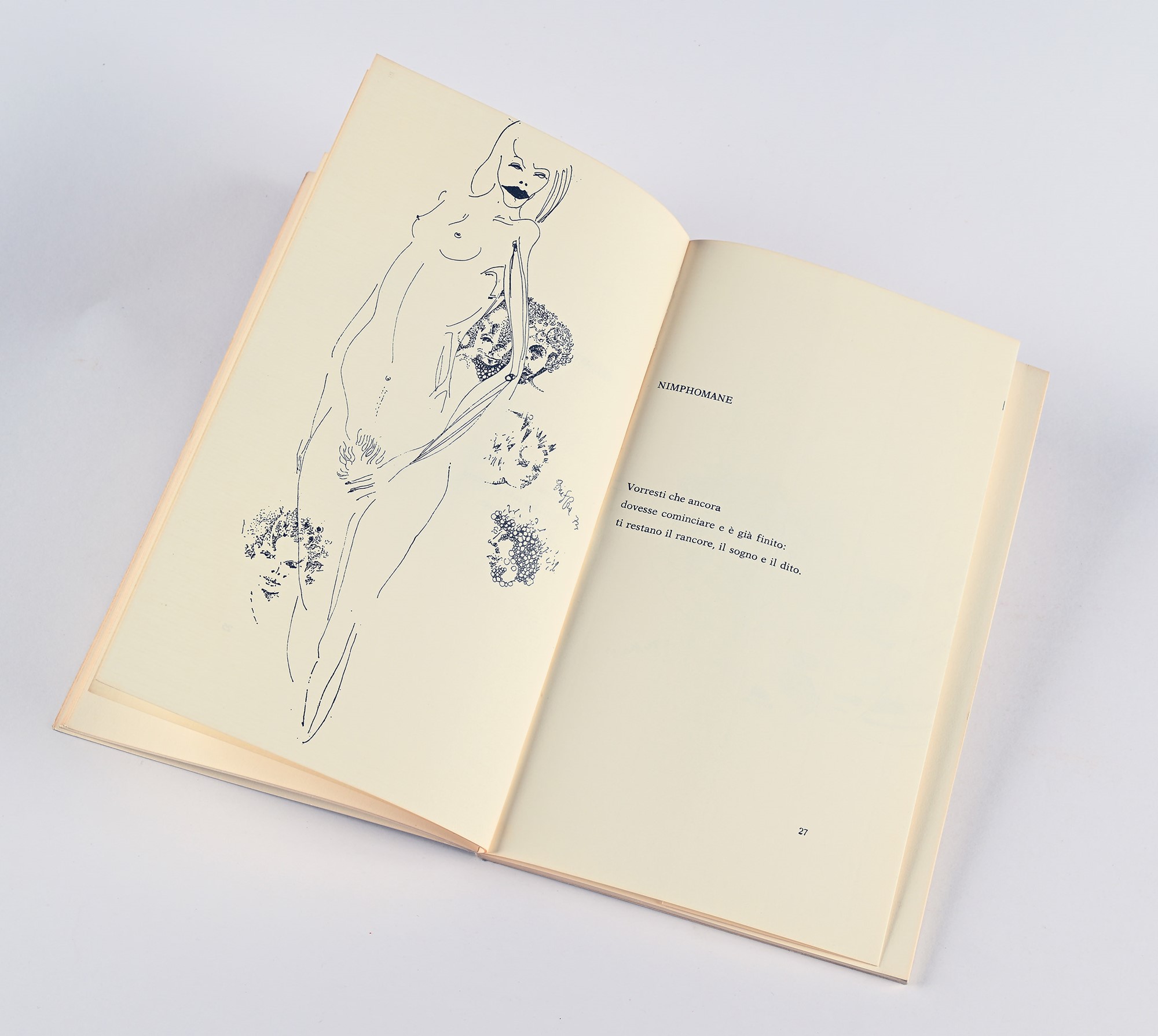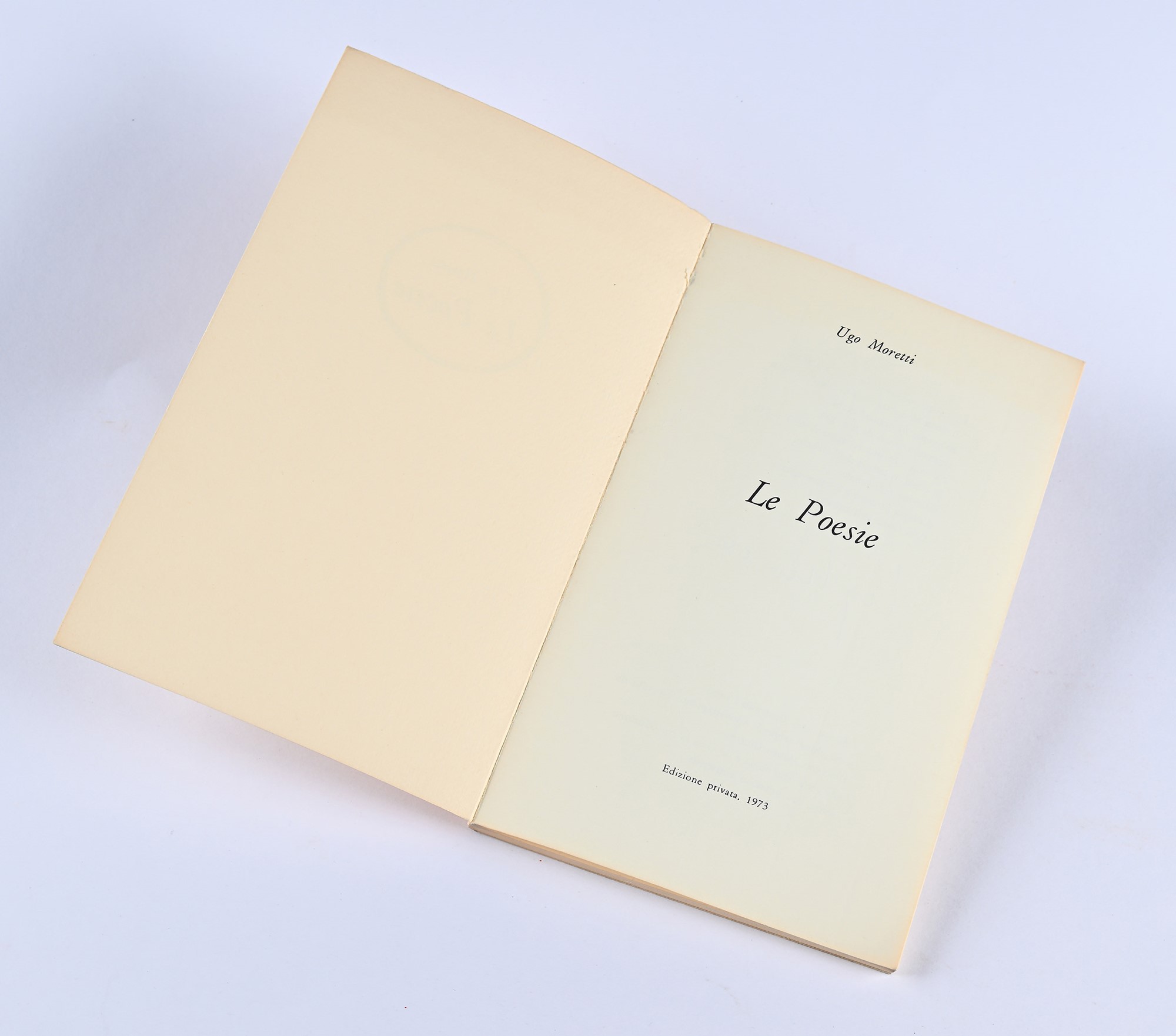 MORETTI, UGO - LE POESIE 1 vol. Bross. ed. pp. 80-[6], mm 240x145. Edizione non venale numerata e firmata dall’autore, es. LXI di 426 copie (200 in numeri arabi, 200 in numeri romani e 26 in lettere dell’alfabeto). Volume illustrato, tavole a piena pagina con raffinati disegni da chine di Giacomo Mauro Giuffra. Testo a stampa 1973, s.l., edizione privata mm 240x145