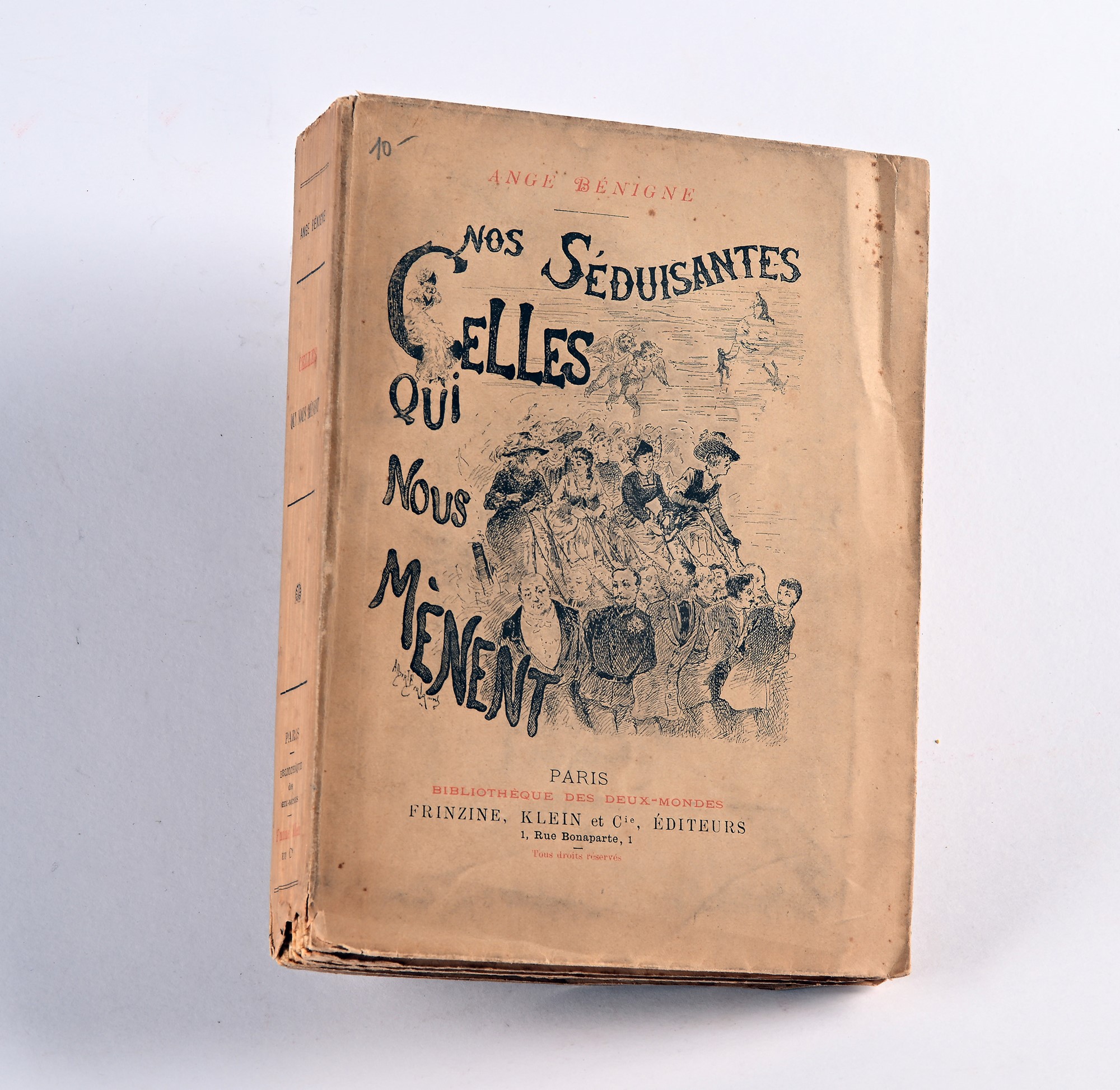 BENIGNE, ANGE - NOS SEDUISANTES. CELLES QUI NOUS MENENT 1 vol. Bross. ed. con titoli e ill. al piatto, titoli al dorso. Esemplare n. 6 dei 15 stampati su carta Hollande, con alcuni fregi xil. nel testo. Lievi segni del tempo al testo, comunque ottimo esemplare. Testo a stampa s.d., Paris, Frinzine Klein & C.ie mm 185x140