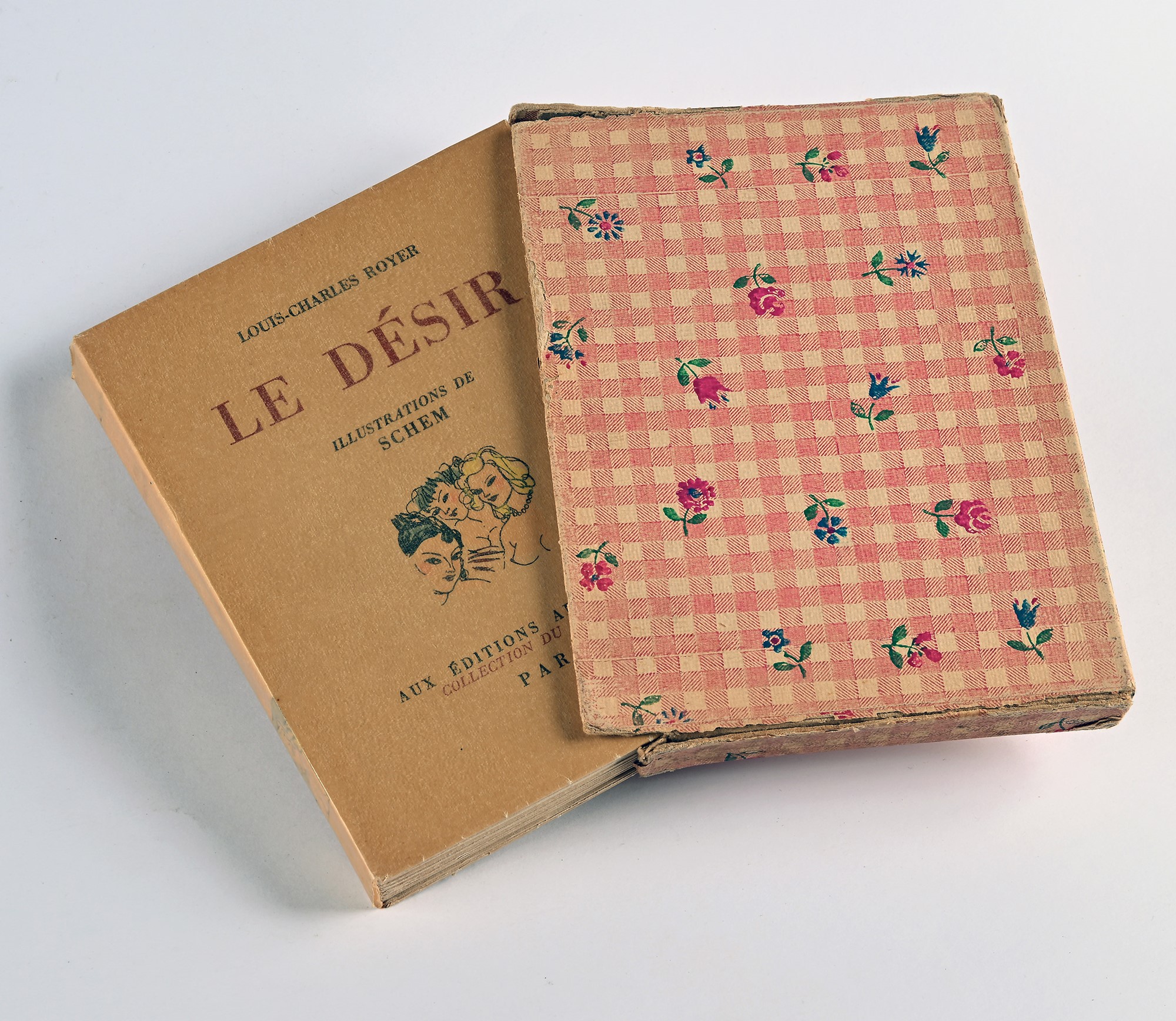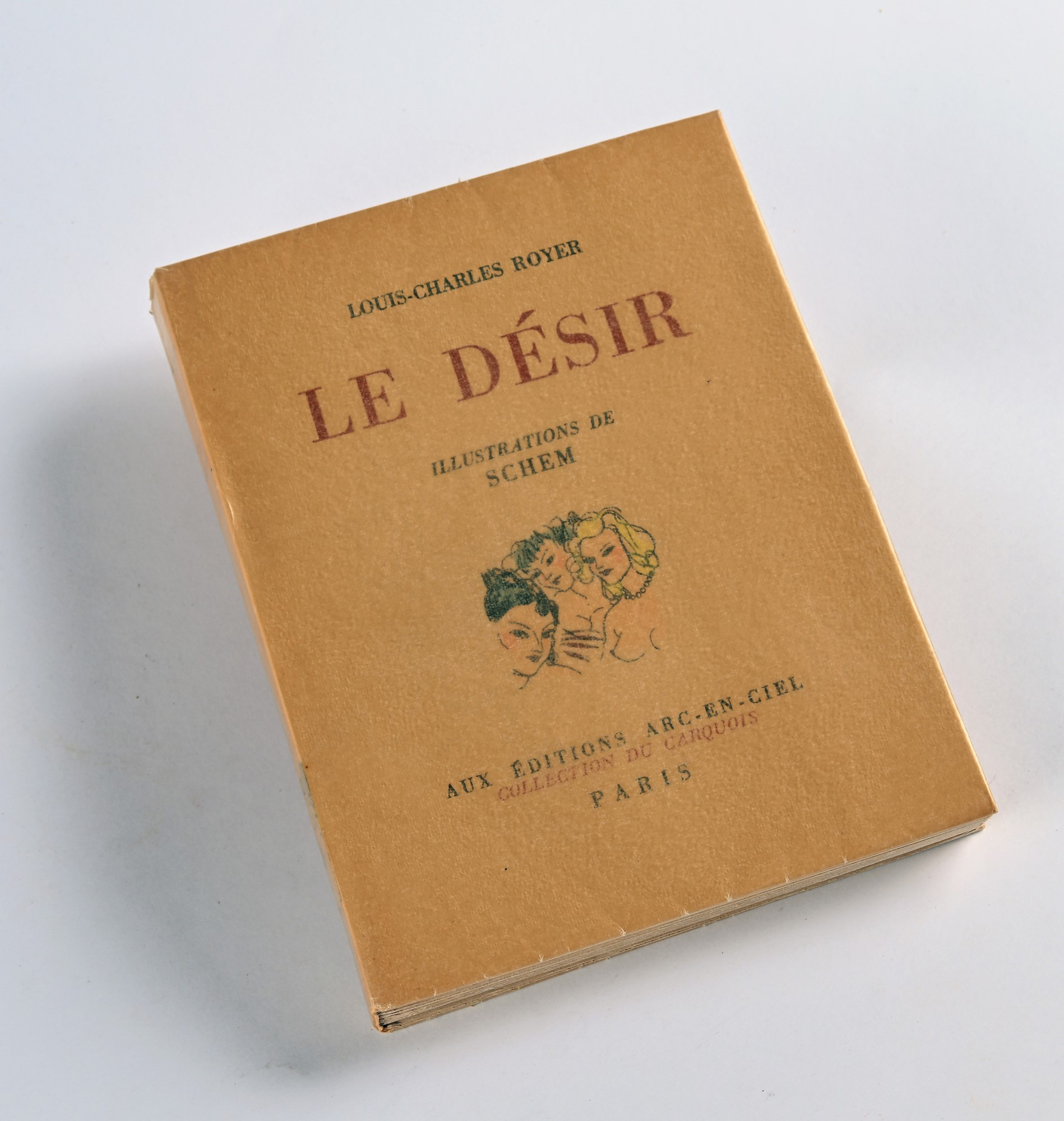 ROYER, LOUIS-CHARLES - LE DÉSIR 1 vol. Bross. ed. con sopracoperta e pergamino protettivo, mm 200x152, p. 219 n. Con astuccio cart. Edizione originale francese con illustrazioni a colori di Schem. Difetti all’astuccio. Testo a stampa 1946, Paris, Aux Editions Arc-En-Ciel mm 200x152