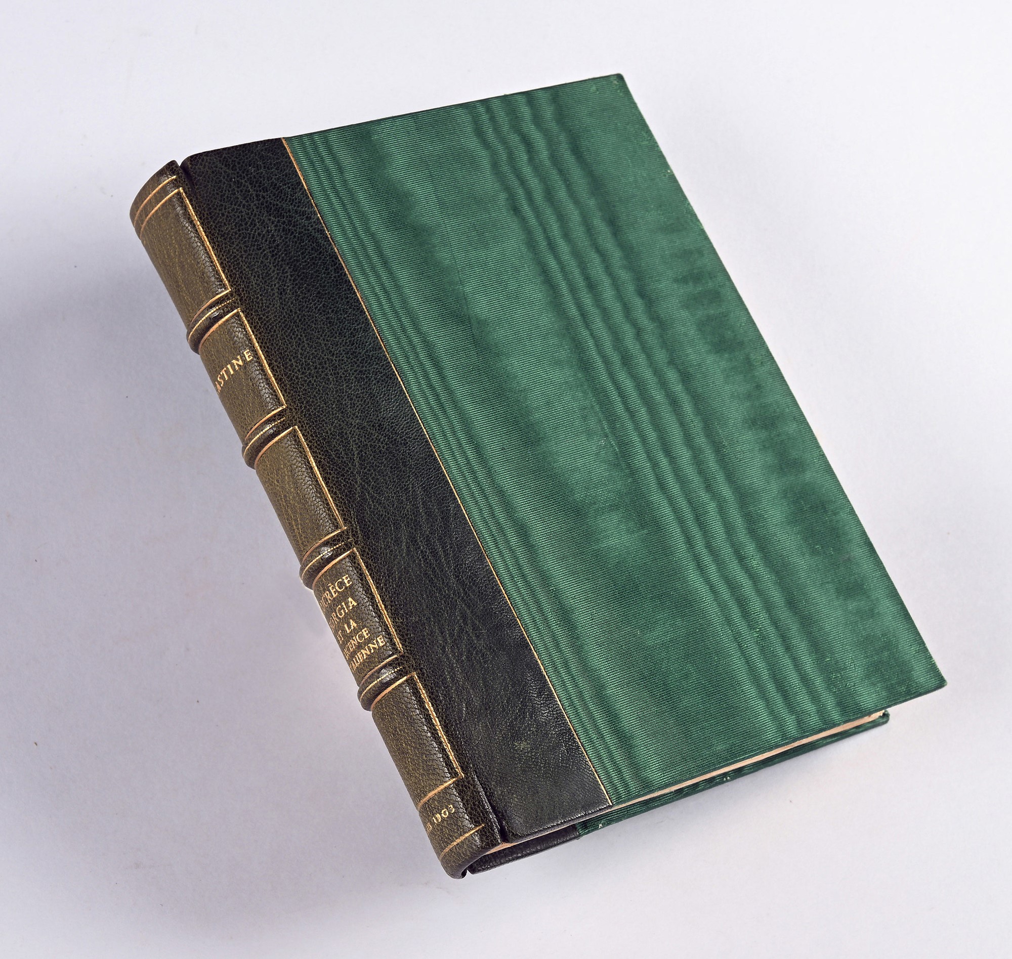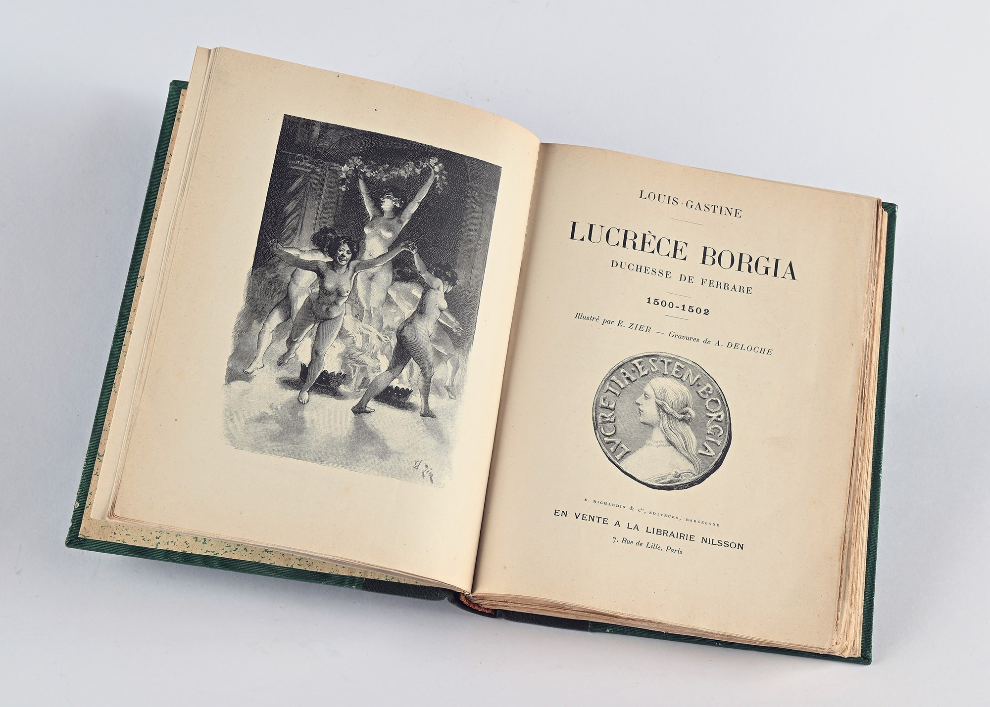 GASTINE, LOUIS - LUCRÈCE BORGIA, DUCHESSE DE FERRARE 1500-1502 1 vol. mm 190x150, p. [10], 348. Rilegatura artistica in mezzo marocchino pregiato con piatti in seta, dorso con titoli in oro e 4 nervature, risg. marm., brossura rilegata. Edizione originale francese illustrata da E. Zier con incisioni di A. Deloche. Testo a stampa [1903], Paris, Nilsson mm 190x150
