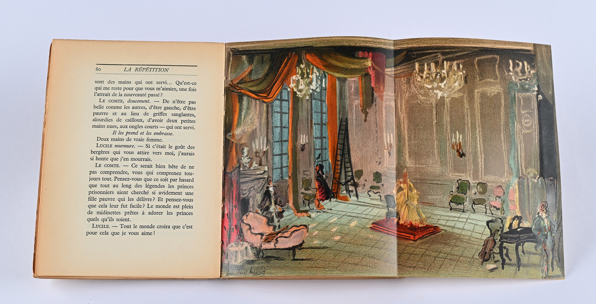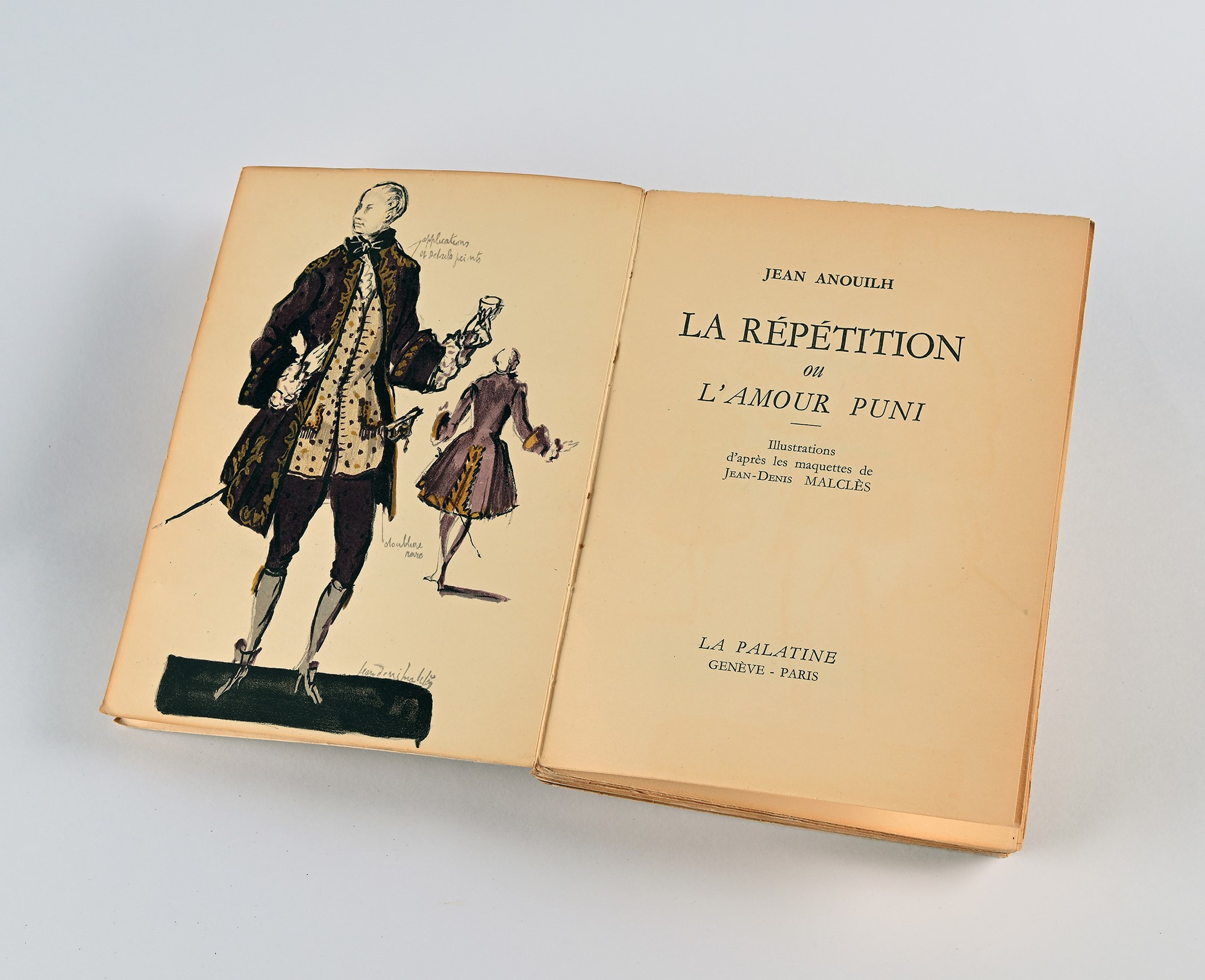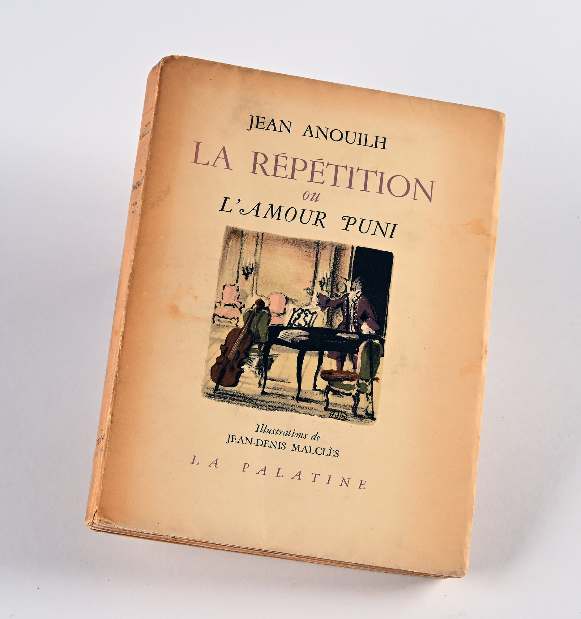 ANOUILH, JEAN - LA REPETITION OU L’AMOUR PUNI. PIÈCE EN 5 ACTES 1 vol. mm 190x145, p. 186+2 tav. ill. Bross. ed. con titoli e ill. al piatto, titoli al dorso. Esemplare n. 845/1000, testo teatrale con 2 tavole a colori (di cui 1 ripiegata) raffiguranti i bozzetti dei costumi di scena e della scenografia. Ex libris di nobile provenienza. Buon esemplare con lievi segni del tempo. Testo a stampa 1950, Paris, La Palatine mm 190x145