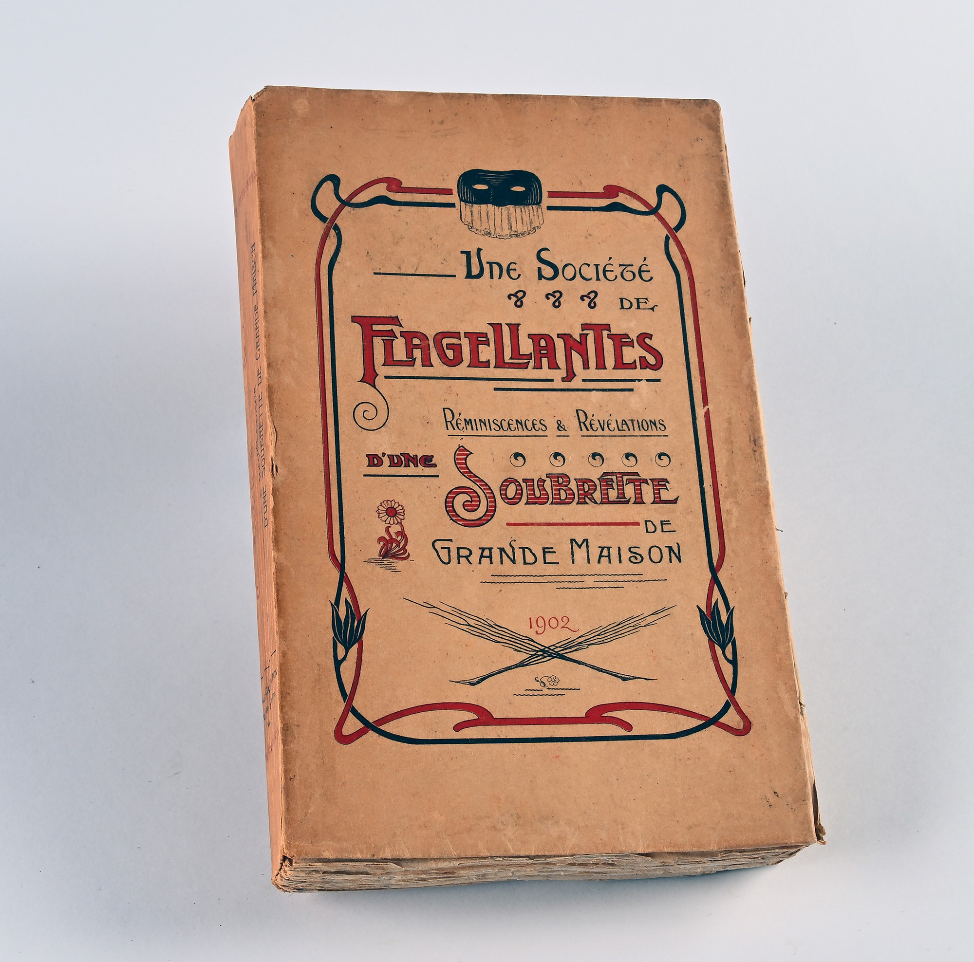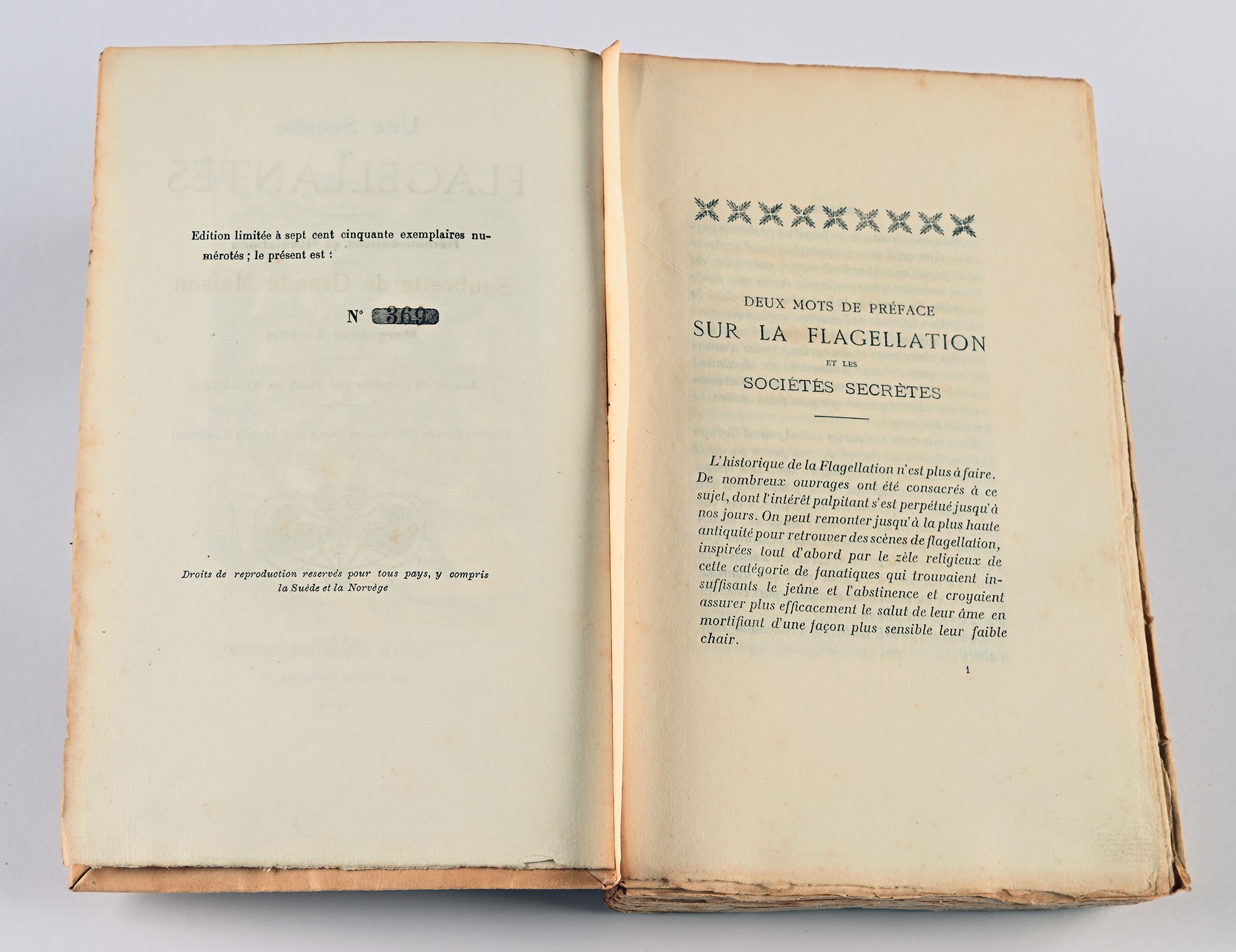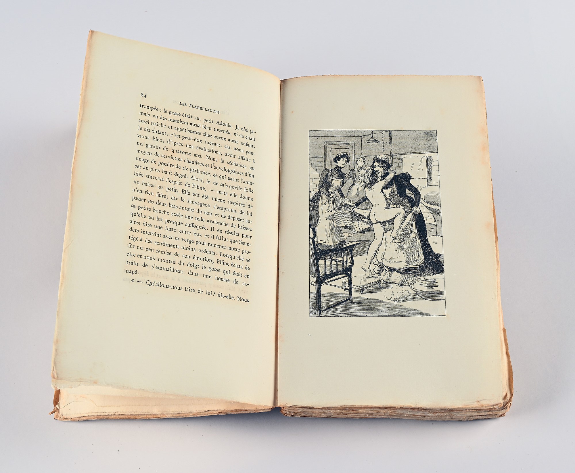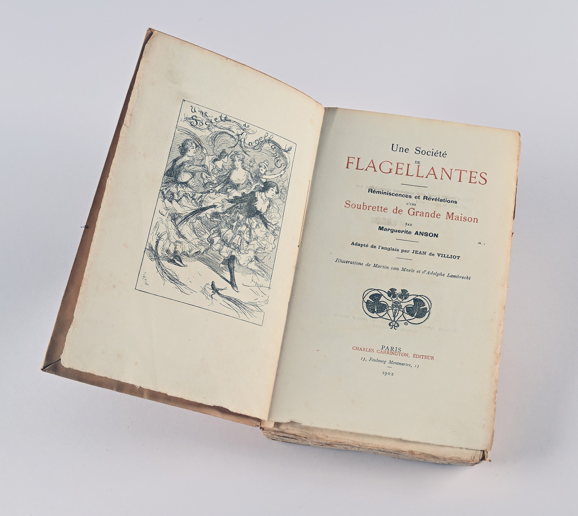 ANSON, MARGUERITE (BERTRAM, JAMES GLASS) - UNE SOCIÉTÉ DE FLAGELLANTES. RÉMINISCENCES ET RÉVÉLATIONS D'UNE SOUBRETTE DE GRANDE MAISON 1 vol. mm 230x145, p. [4], 298, [2] con front. a col., ill. Brossura editoriale con sovracop. a col. Con illustrazioni anche a piena pagina di Martin van Maele e Adolphe Lambrecht. Rara edizione numerata, es. 369/750. Esemplare assai fresco con barbe, una scheda bibl. dattil. applicata all’occh. Testo a stampa 1902, Paris, Charles Carrington mm 230x145