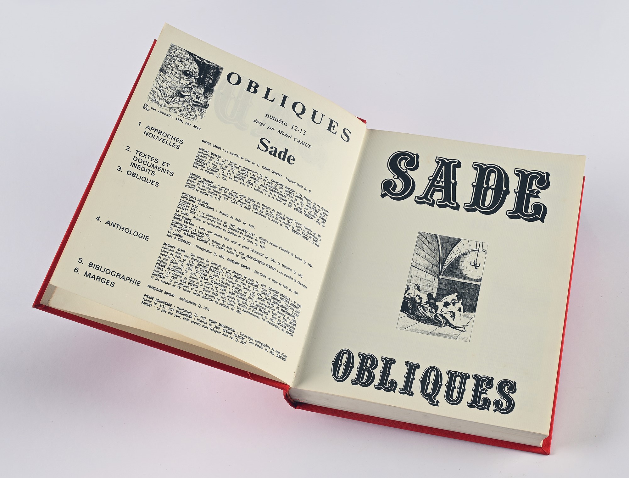 AA.VV - SADE. OBLIQUES, NUMÉRO 12-13 1 vol. mm 275x215, p. 341 n. Legatura editoriale in piena tela rossa, titoli impressi al piatto con ill., titoli al dorso, sovracoperta acetata. Volume illustrato, si conserva la stampa allegata. Testo a stampa 1977, Paris, Borderie mm 275x215