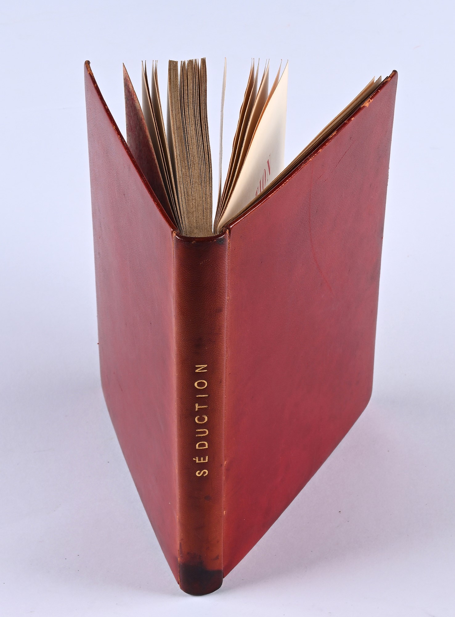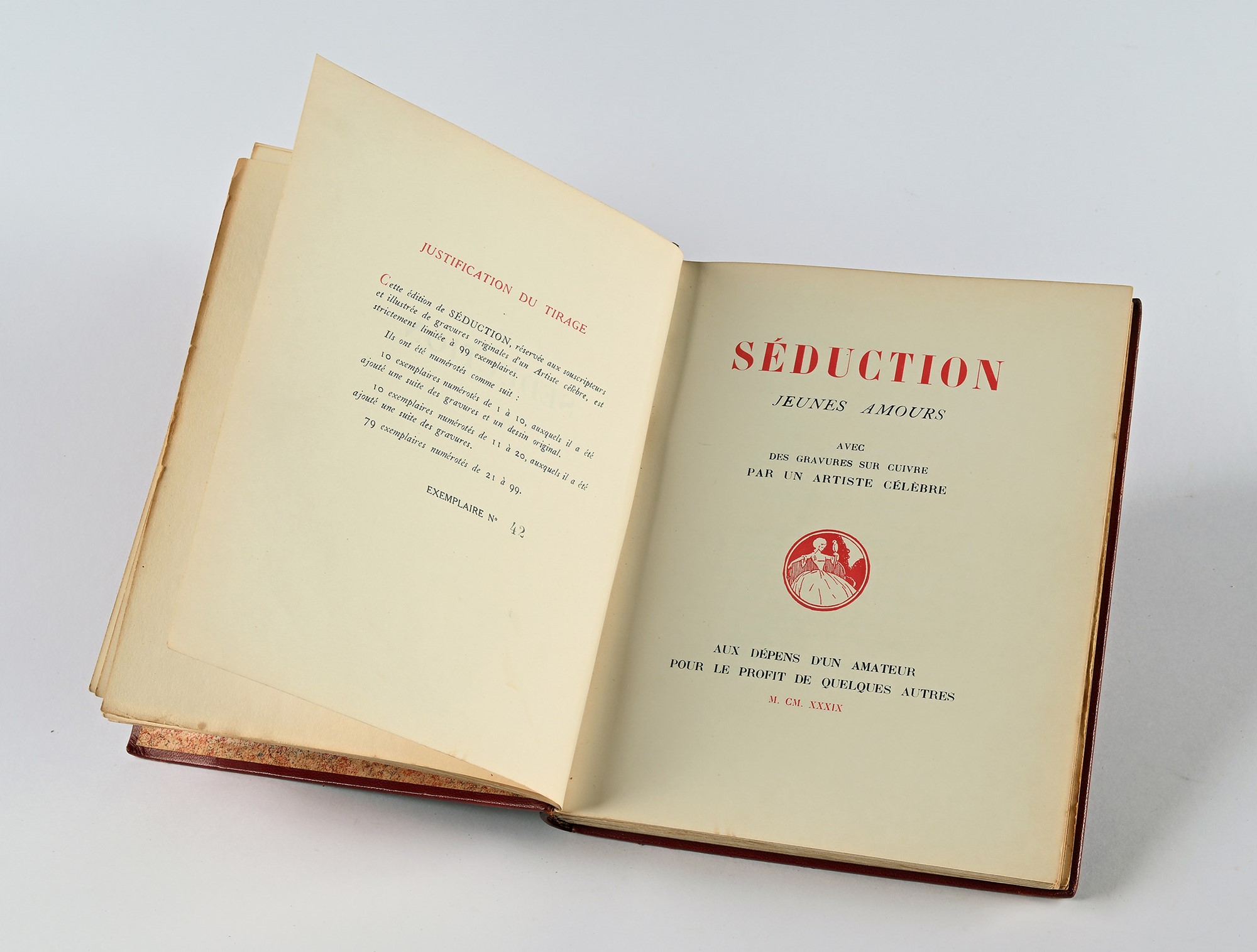 ANONIMO - SÉDUCTION. JEUNES AMOURS 1 vol. mm 245x195, p. 144+6 tav. ill. f.t. Rilegatura in piena pelle con titoli in oro al dorso. Edizione numerata riservata ai sottoscrittori e illustrata da stampe di Collot, es. n. 42/99, testo stampato a colori. Esemplare non completo, si conservano 6 tavole delle 10 previste. Testo a stampa 1939 mm 245x195