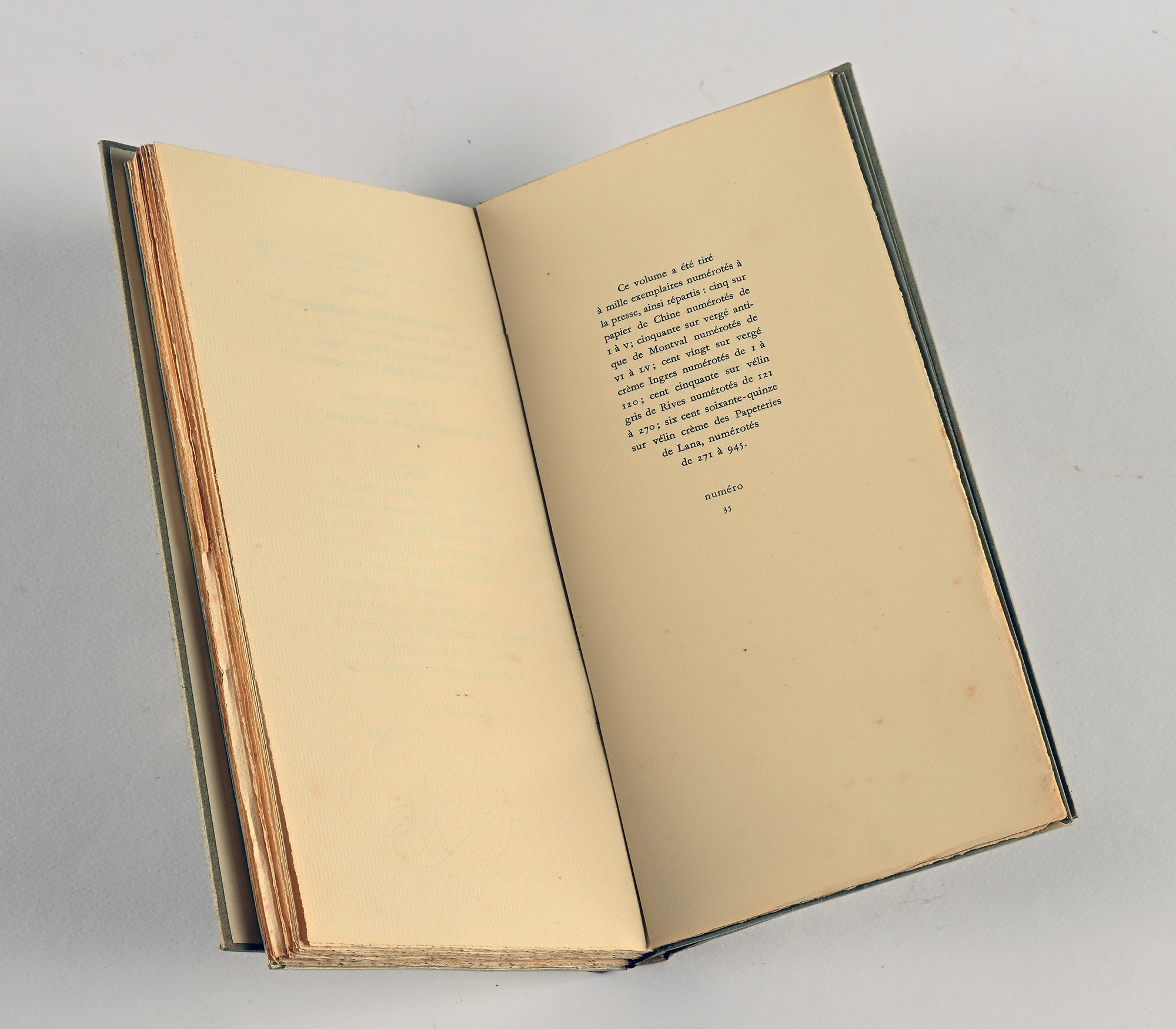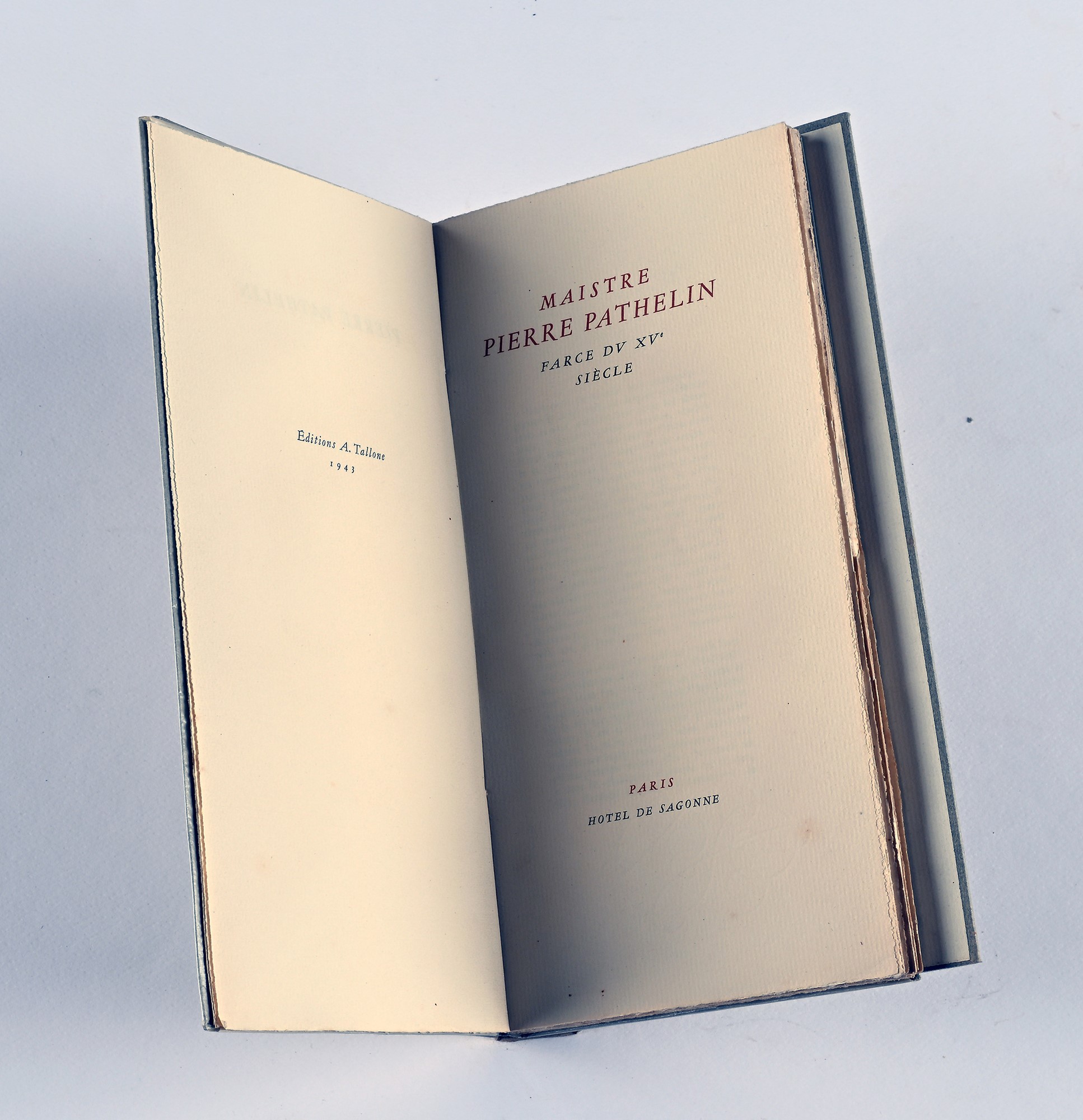 Maistre Pierre Pathelin. Farce du XV siècle. Raffinata edizione talloniana di questo anonimo capolavoro del teatro comico medievale, con l'introduzione di Jean Porcher, realizzata durante il periodo parigino in cui la stamperia era impiantata nell'Hotel de Sagonne. Tiratura limitata di 945 esemplari, il nostro n. 35 dei 120 su carta "vergé creme Ingres". Brossura editoriale a risvolti in carta Ingres protetta da velina, camicia ed astuccio cartonati. Hotel di Sagonne, Tallone, Parigi 1943 cm 26x13