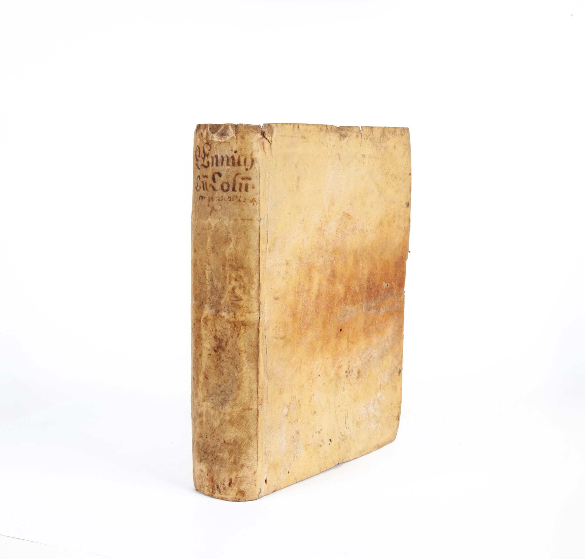 Quintus Ennius, Girolamo Colonna - Q. Ennii Poetae vetustissimi quae supersunt fragmenta ab Hieronimo Columna conquisita, disposita et explicata, ad Ioannem filium Edizione originale completa, divisa in quattro libri, tra cui gli annali, le commedie, le tragedie, Evemero o storia sacra e una biografia del poeta latino. Opera dell'erudito Girolamo Colonna (Napoli 1534-1586), tenuta in grande considerazione dagli studiosi del poeta e drammaturgo latino Ennio fino a tutto l'Ottocento (una prima edizione parziale è del 1585). Pubblicata postuma dal figlio Giovanni è l'unico scritto giunto a noi del Colonna, padre del più noto linceo Fabio. Legatura coeva in piena pergamena con titolo manoscritto al dorso. Restauro al frontespizio. Parzialmente slegato. Orazio Salviani, Napoli 1590 cm 23,5x17,5