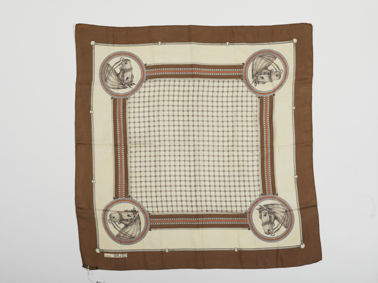 CELINE Foulard stampato nei toni del marrone. Seta. . Foulard Celine stampato a motivi geometrici ed equestri nei toni del marrone su fondo beige, Celine Paris firmato in un angolo in basso.