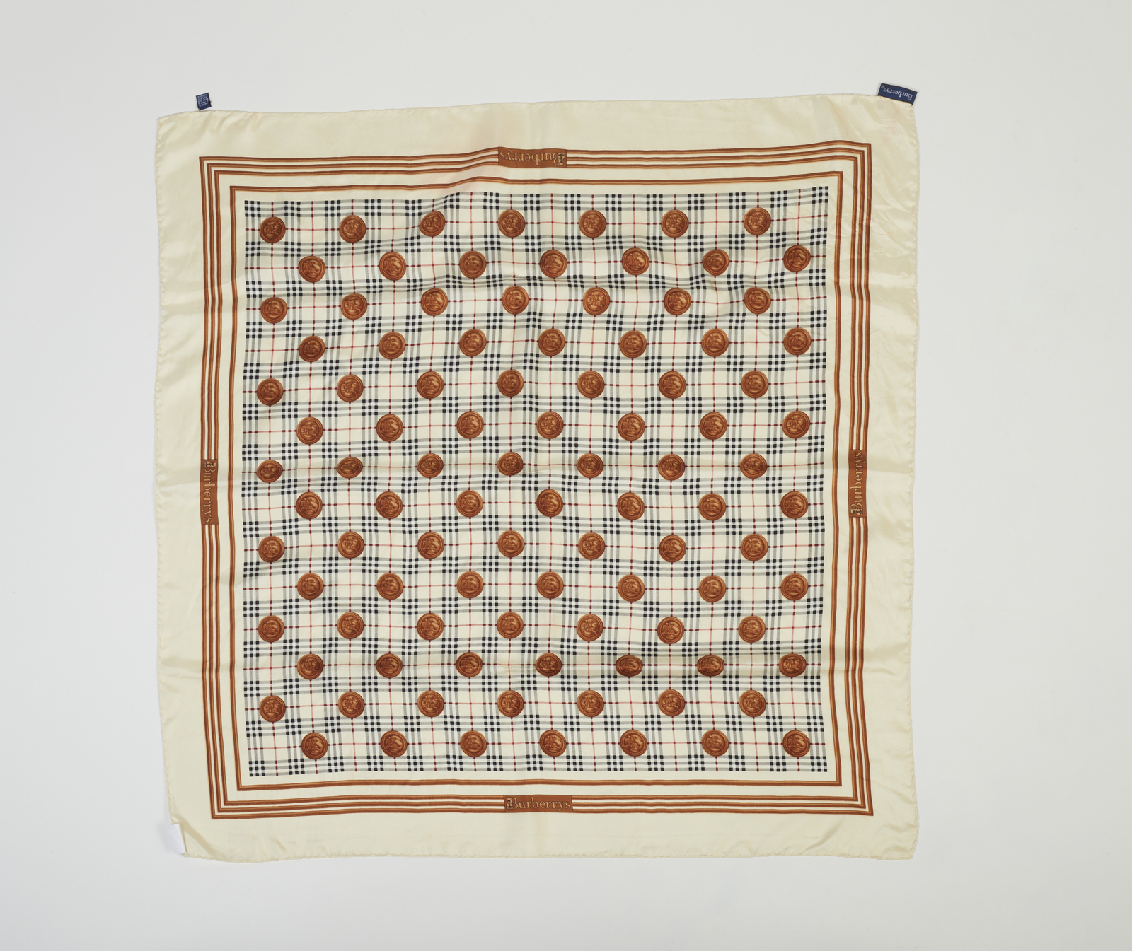 BURBERRY Foulard stampato. Seta. . Foulard Burberry a fantasia check nei toni del beige e motivi a bottoni con logo giallo oro, firma Burberry ai quattro angoli, etichetta Burberry presente.