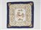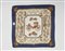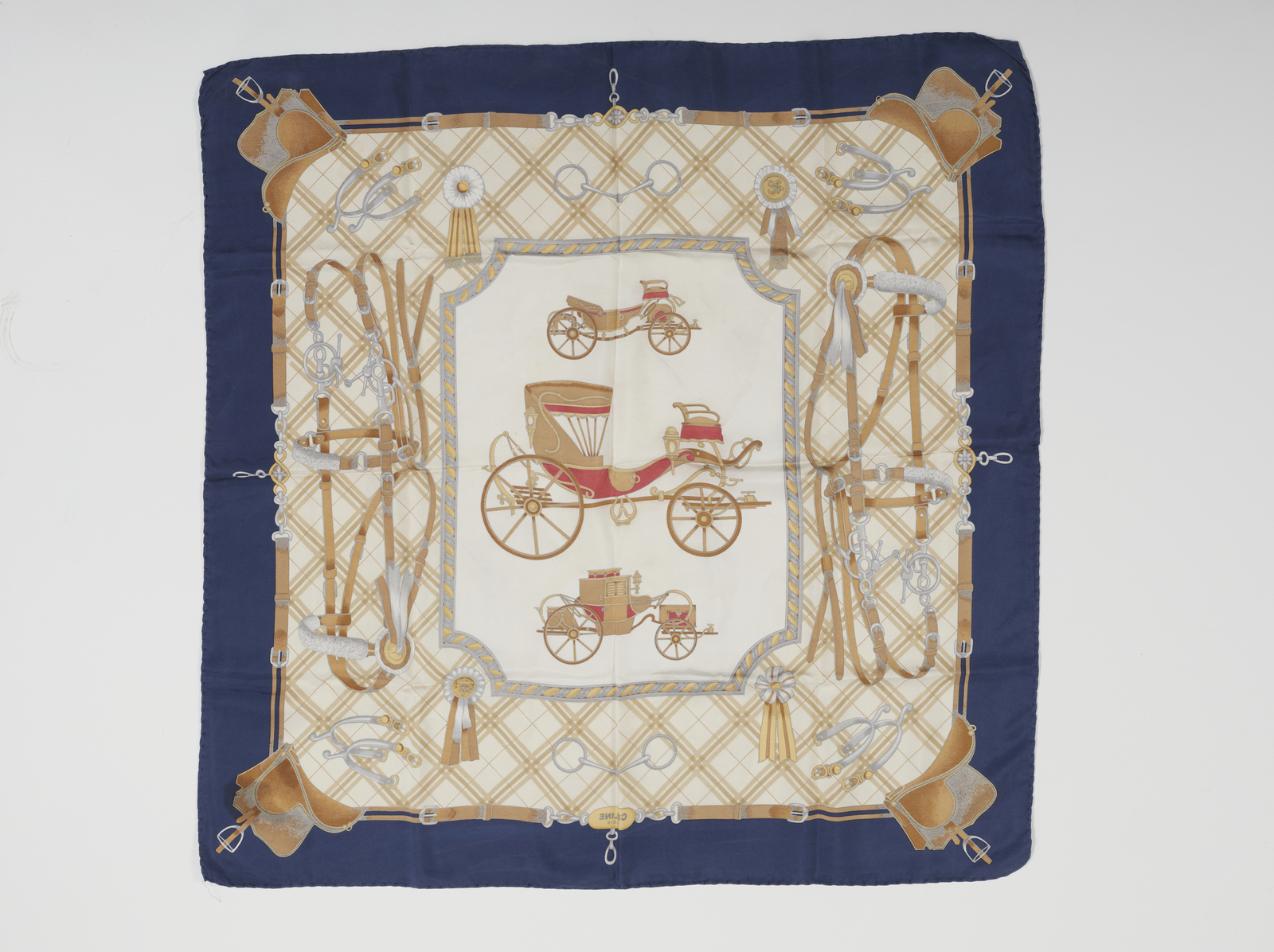 CELINE Foulard stampato con bordi blu. Seta. . Foulard in seta Celine stampato con motivi geometrici, di carrozze ed equestri sui toni del marrone su fondo beige, bordi color blu. firmata Celine Paris in basso al centro.
