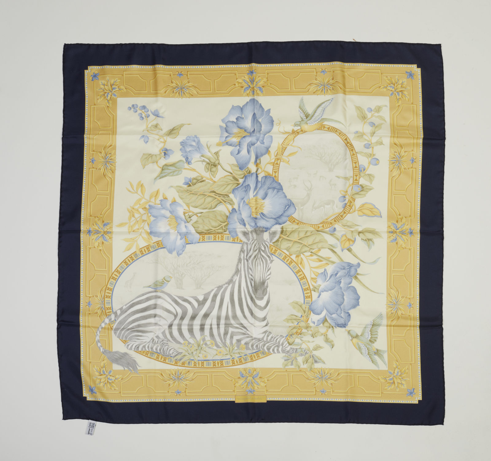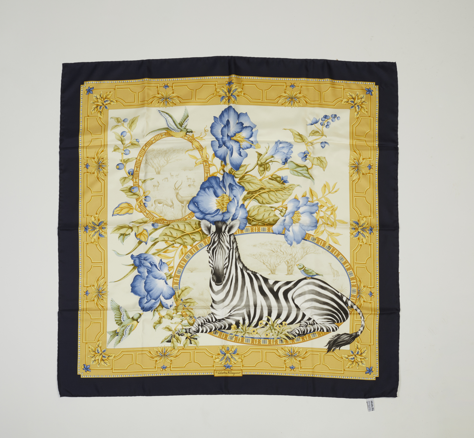 FERRAGAMO SALVATORE Foulard stampato. Seta. . Iconico foulard carré in seta Salvatore Ferragamo vintage, bordi arrotolati a mano, fantasia animalier con una grande zebra al centro, motivi floreali e vegetali a rappresentare il paesaggio del bush africano, nei toni del giallo, verde chiaro e azzurro, bordi color blu di Prussia. Logo Salvatore Ferragamo stampato. Etichetta logo Salvatore Ferragamo 100% seta presente. Condizioni eccellenti.
