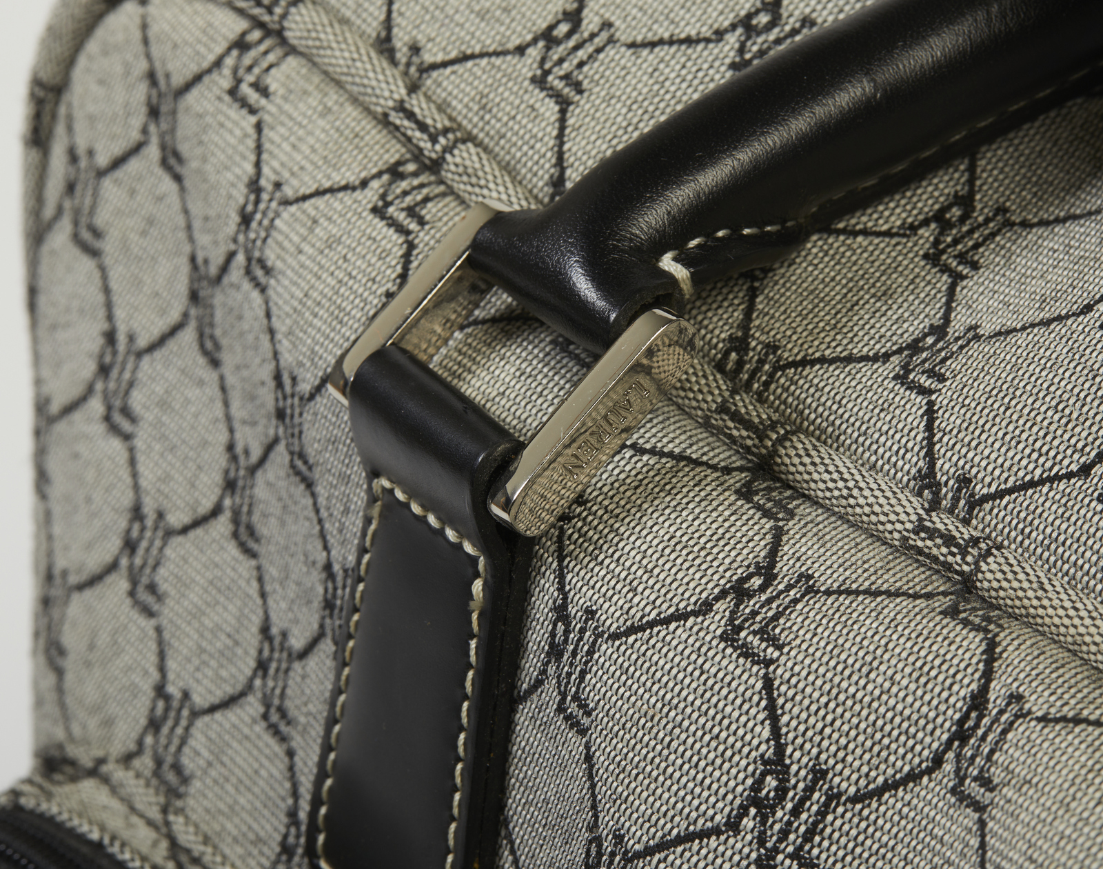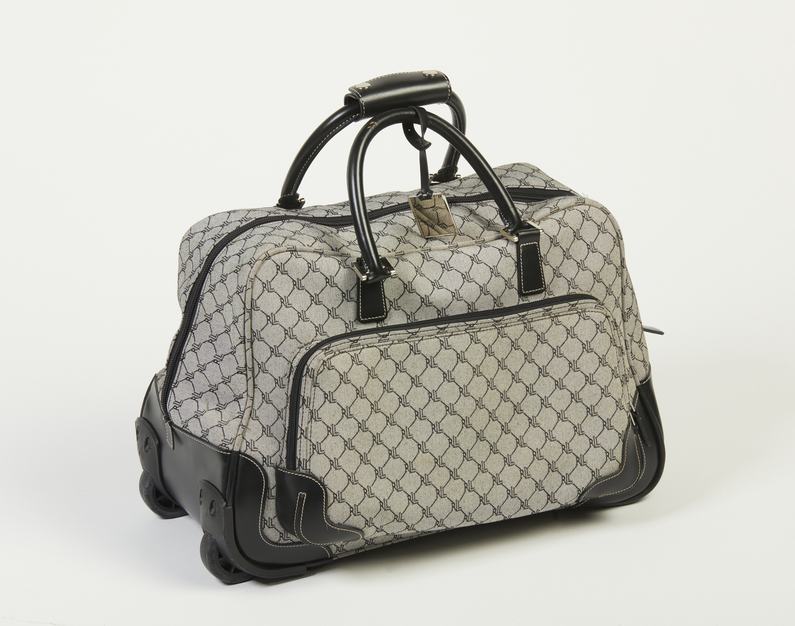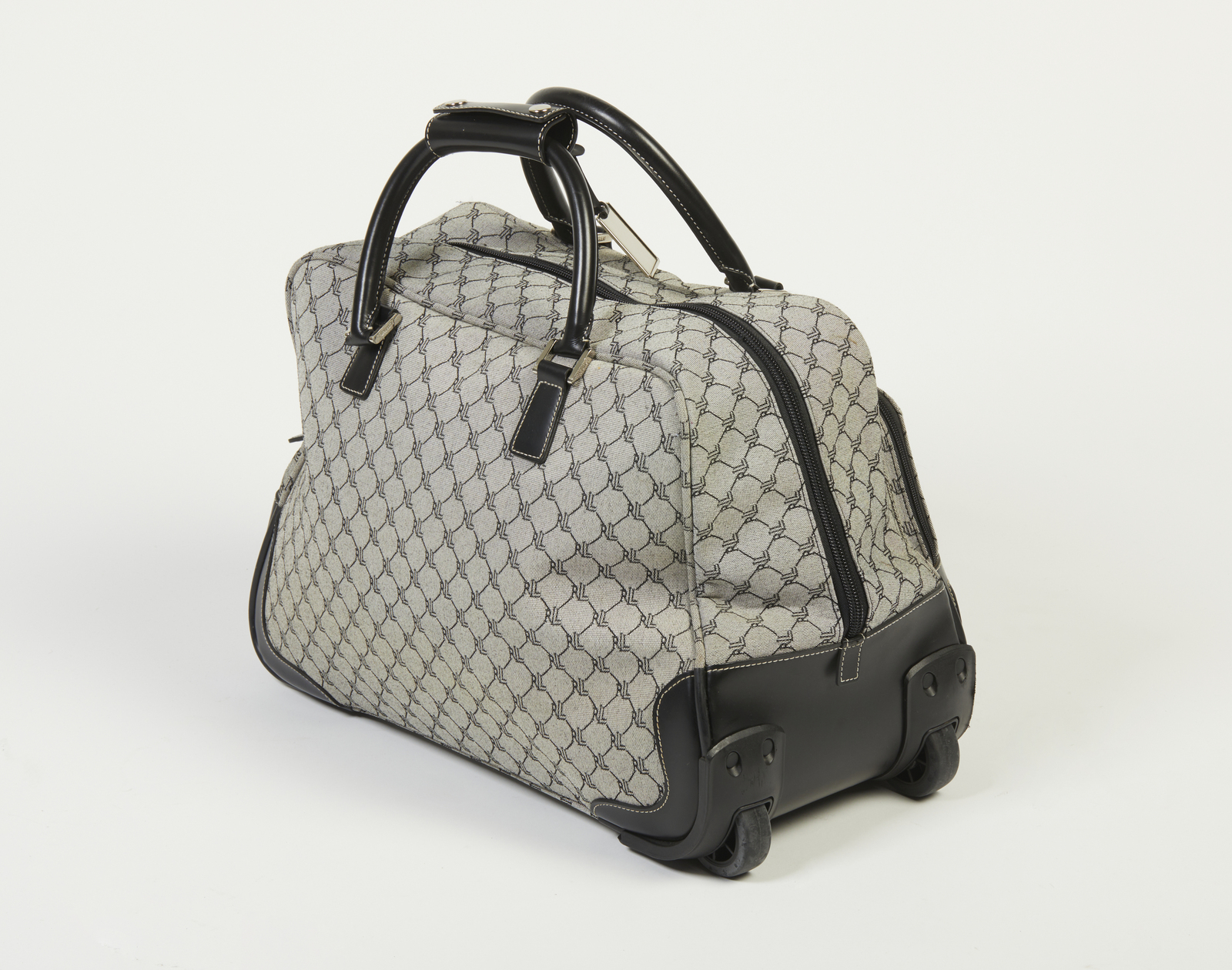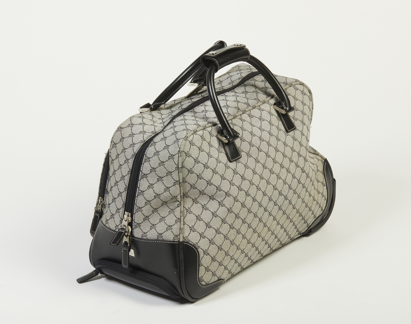 LAUREN RALPH Borsone trolley. Canvas. Cm 34,00 x 51,00 x 25,00. Borsone da viaggio con rotelle modello trolley, di taglia media, linea Lauren, brand Ralph Lauren, in canvas monogram nei toni del grigio e dettagli in pelle nera a contrasto, fodera in tessuto nero logo, etichetta Lauren/ Ralph Lauren all'interno.