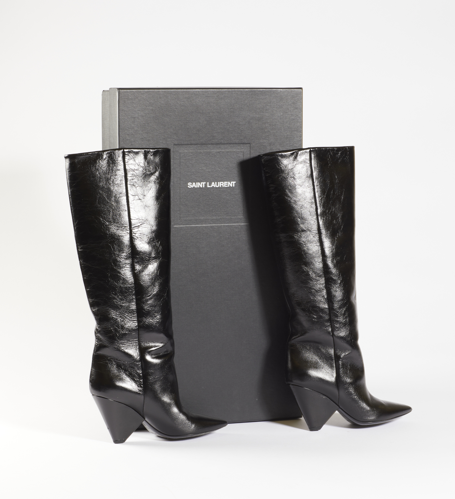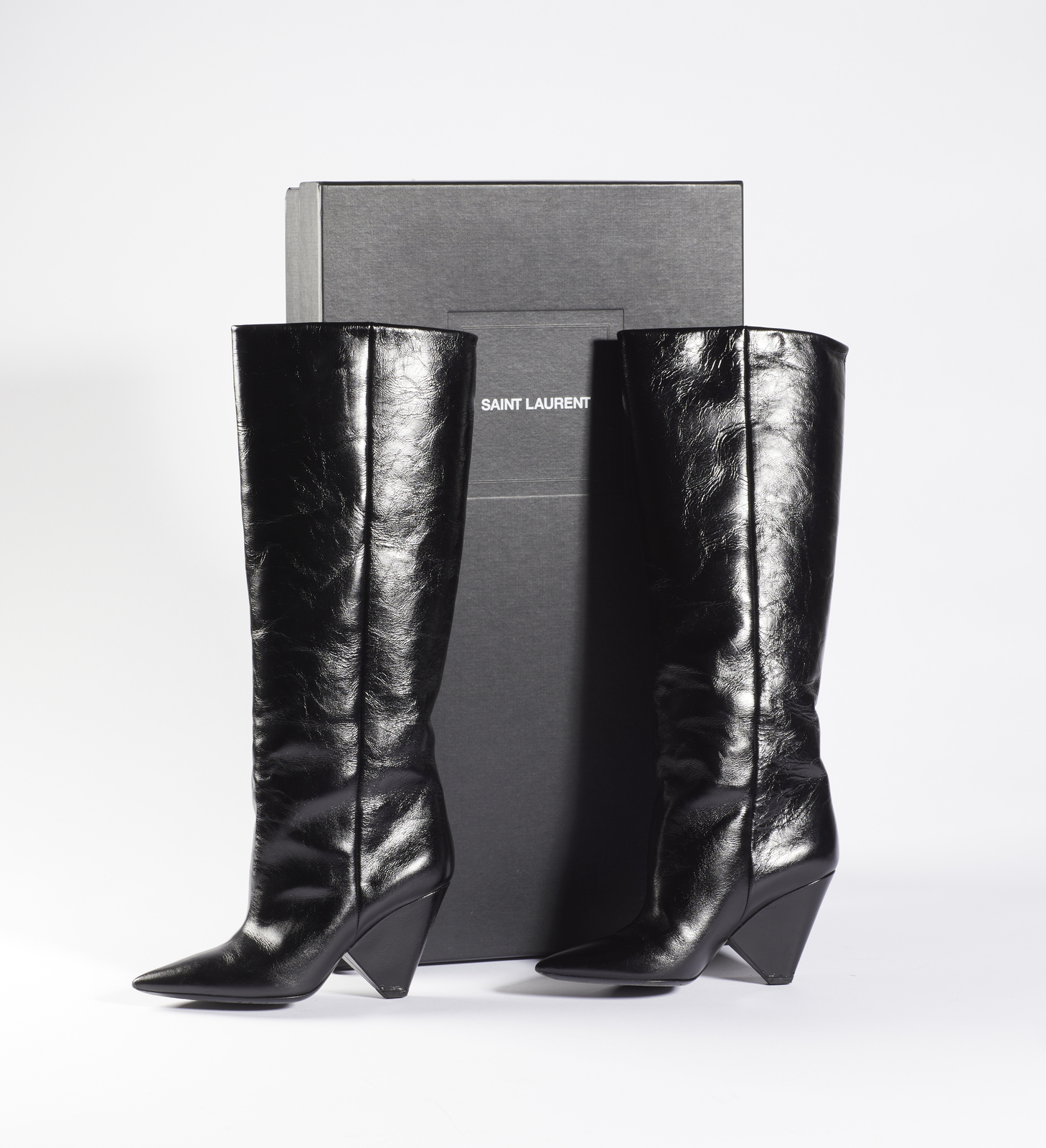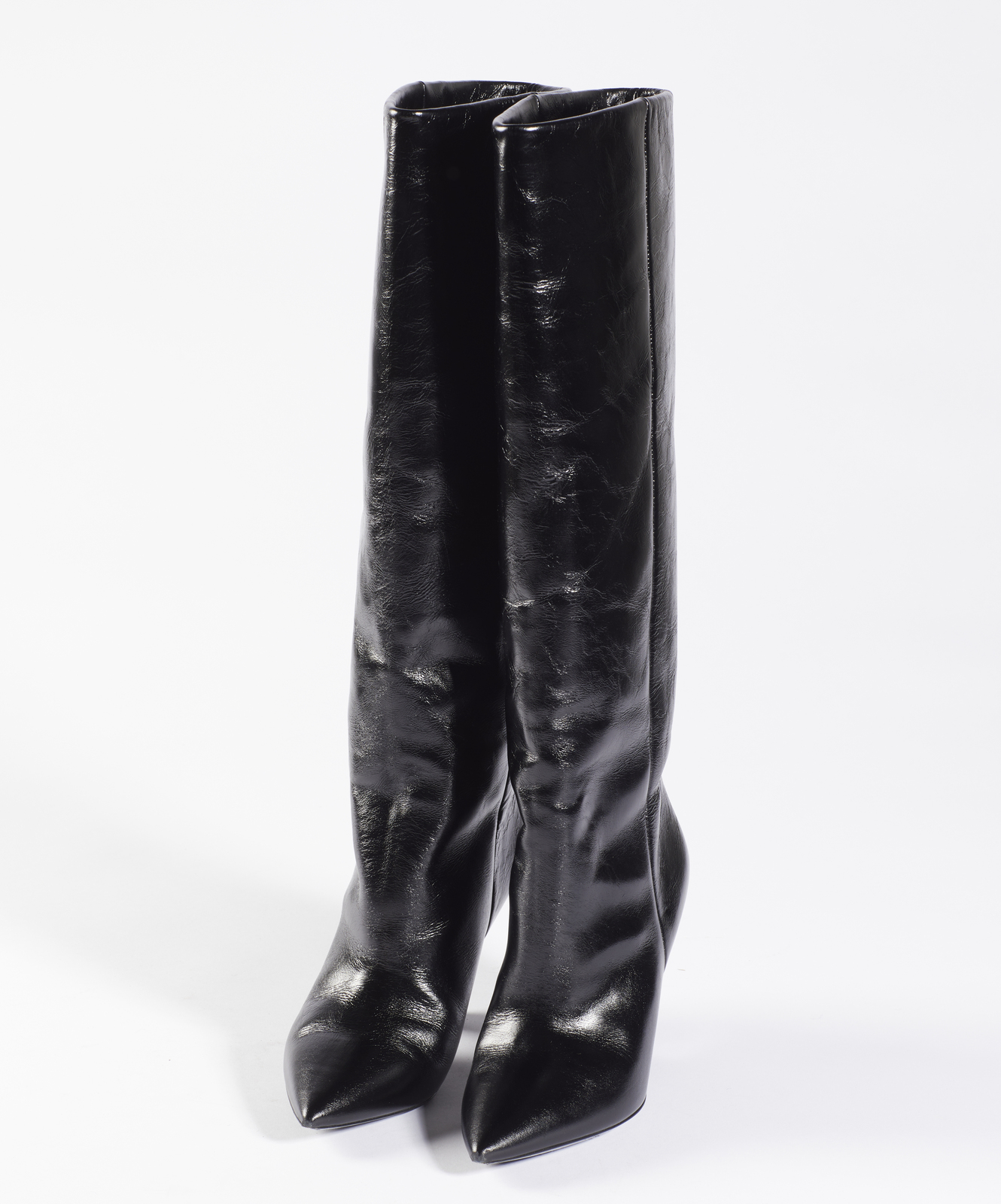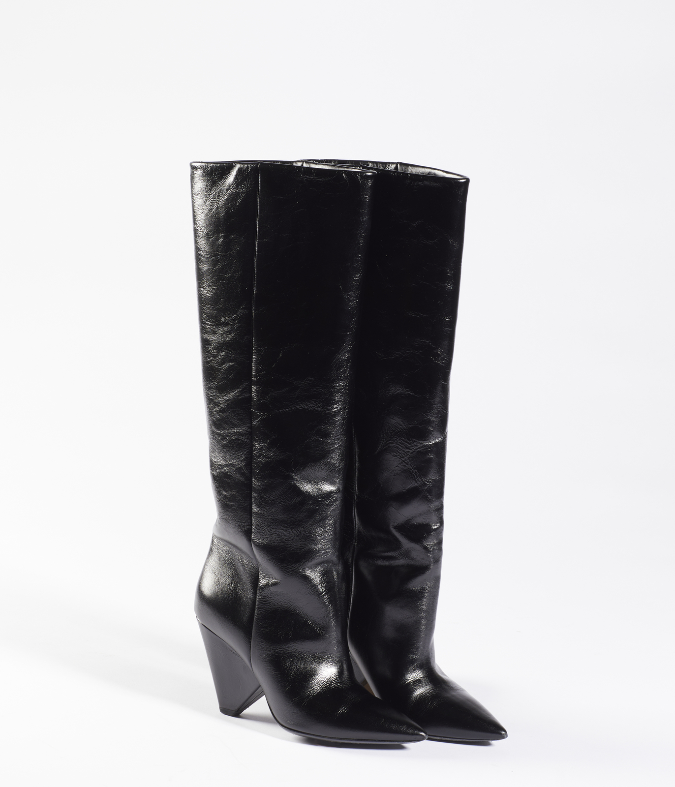 LAURENT SAINT Stivali neri in pelle. Pelle. . Stivali in pelle nera Yves Saint Laurent, a punta, tacco a cono.Taglia 40. Gamba altezza 42 cm, tacco 9 cm.