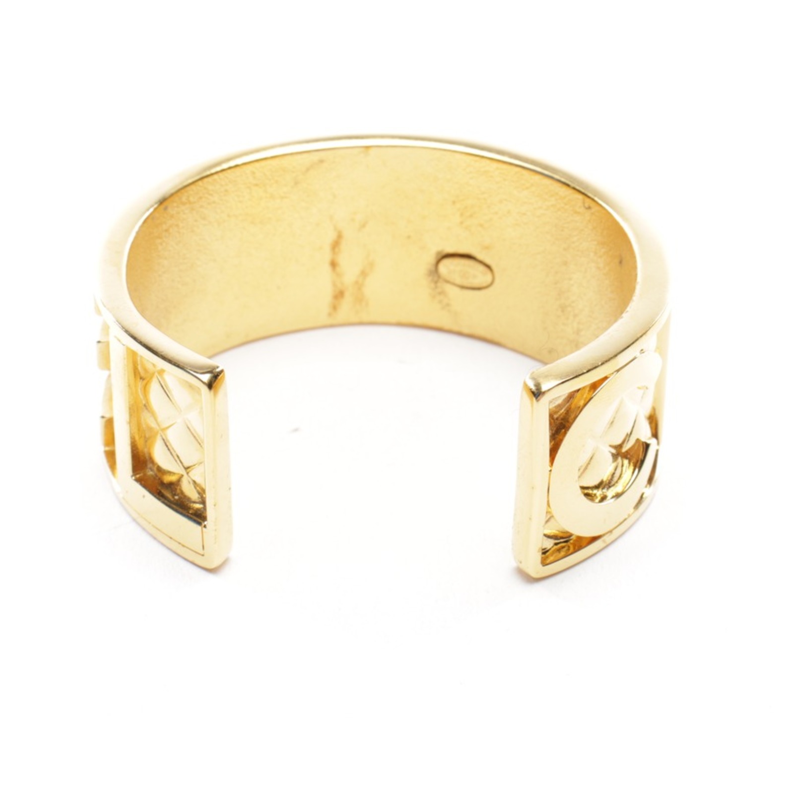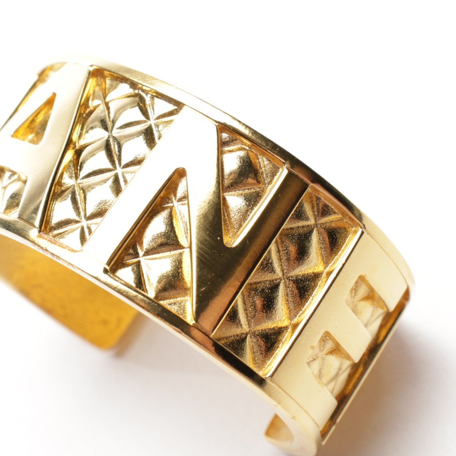 CHANEL Bracciale rigido. 1997. Metallo dorato. Cm 6,50 x 2,80. Bracciale rigido in metallo dorato matelassé con scritta CHANEL per esteso su tutta la superficie del bracciale.