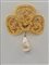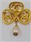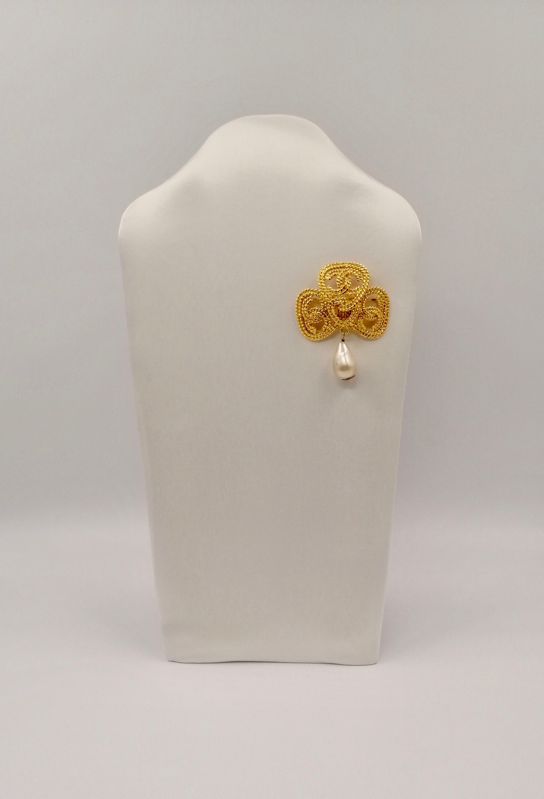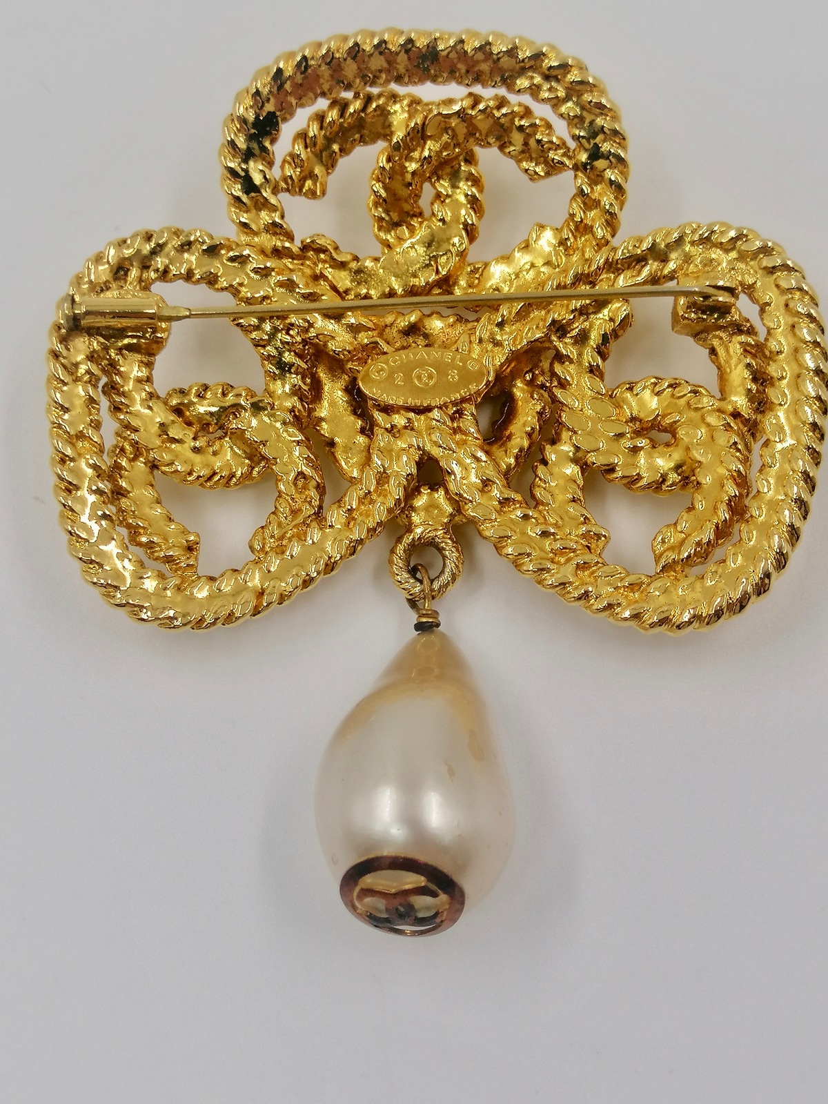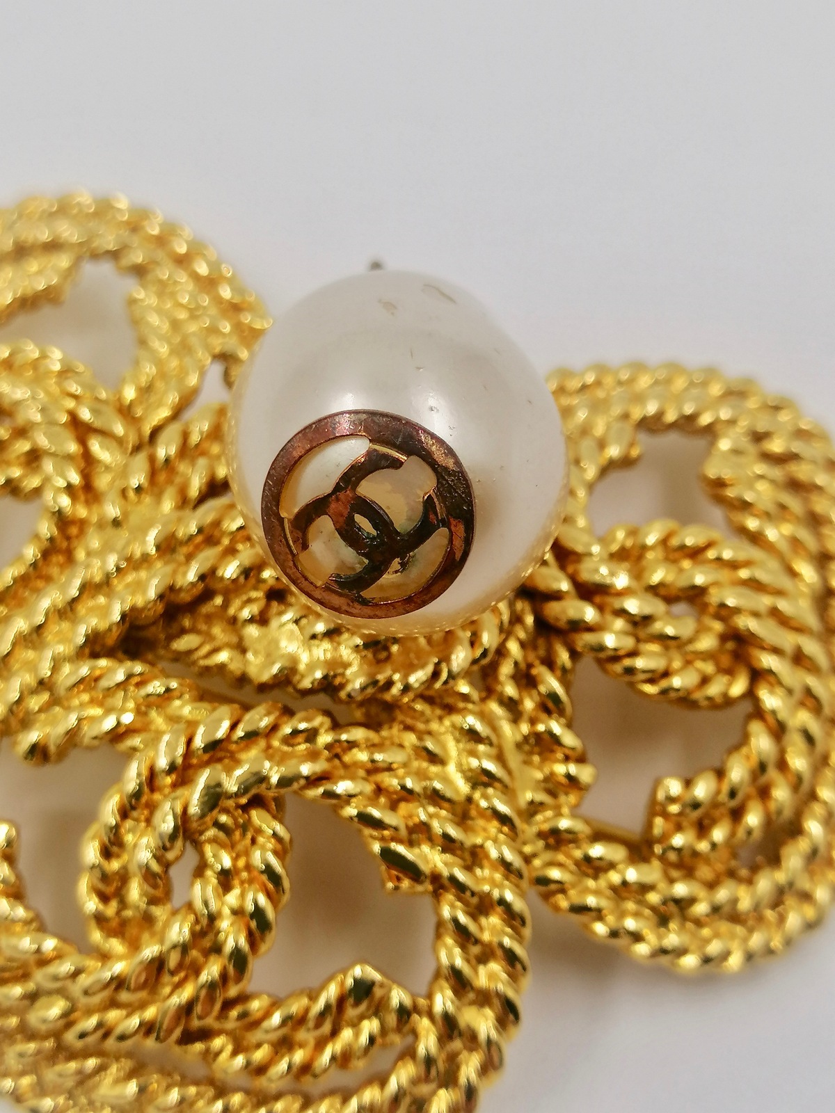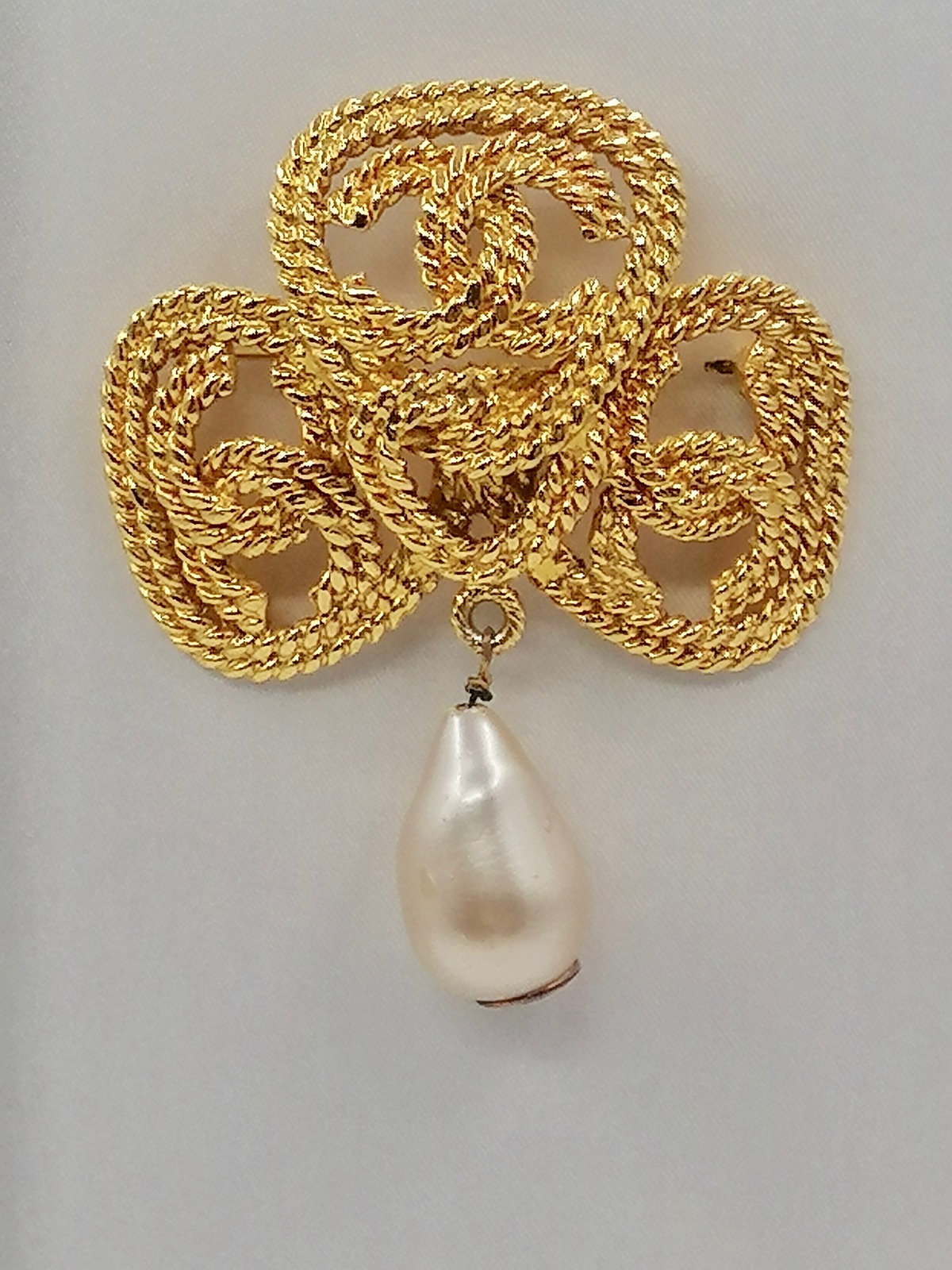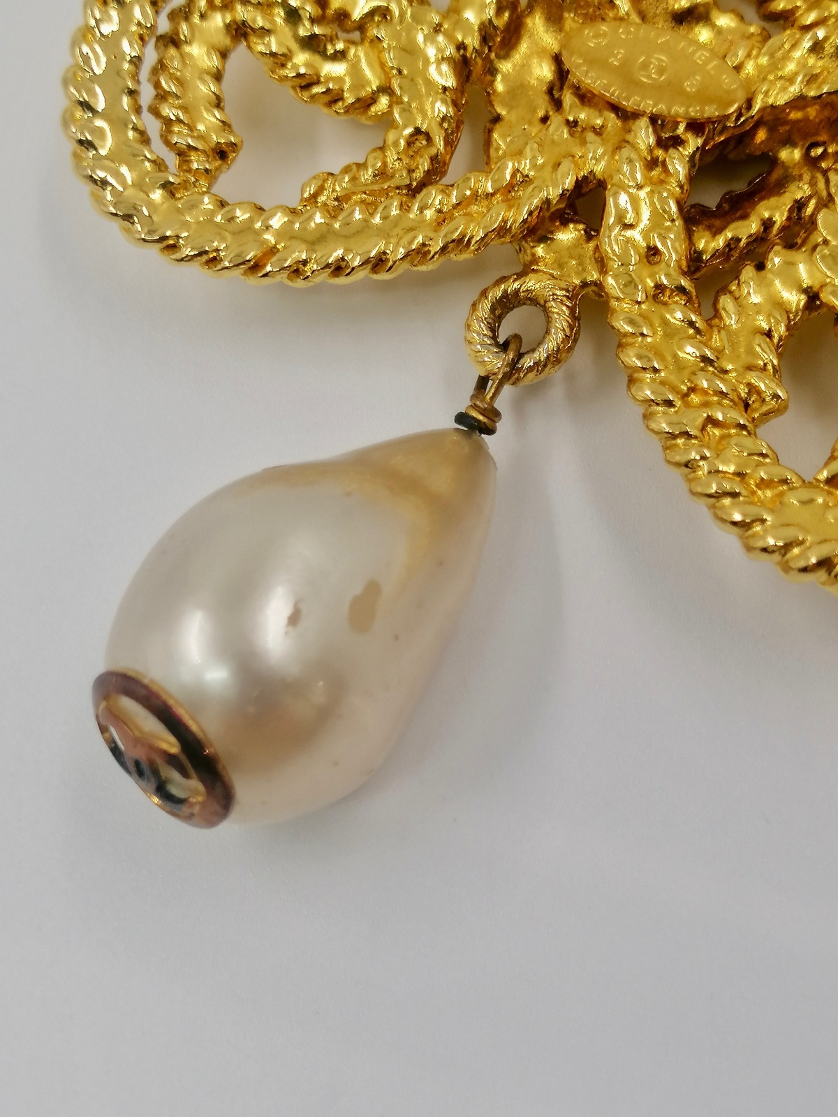 CHANEL Spilla a cordone marinaro. 1989. Metallo dorato e perla.. Cm 7,00 x 8,50 x 3,00. Spilla di grandi dimensioni in metallo dorato con logo centrale, perla a goccia pendente.Collezione 23 fine anni '80 inizio anni '90. Larghezza cm 7, Altezza cm 5,5, Perla cm 3, Altezza totale cm 8,5. Buone condizioni, lievi difetti sulla perla.