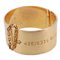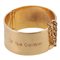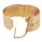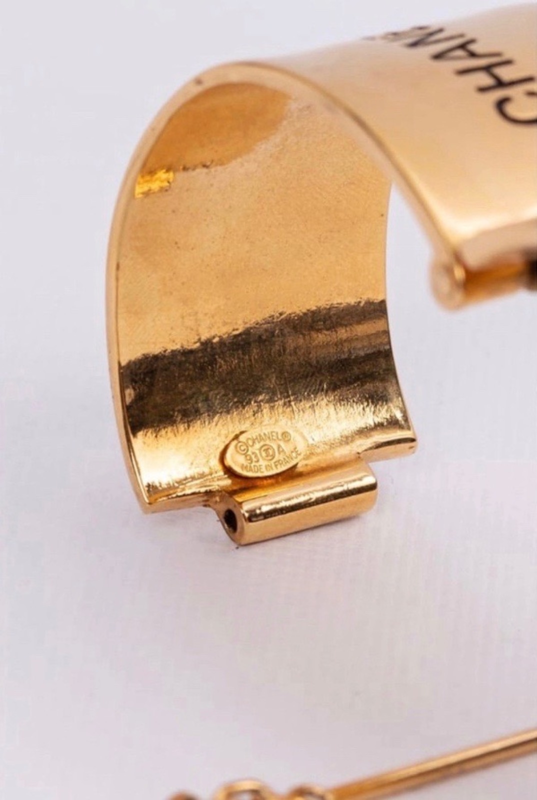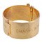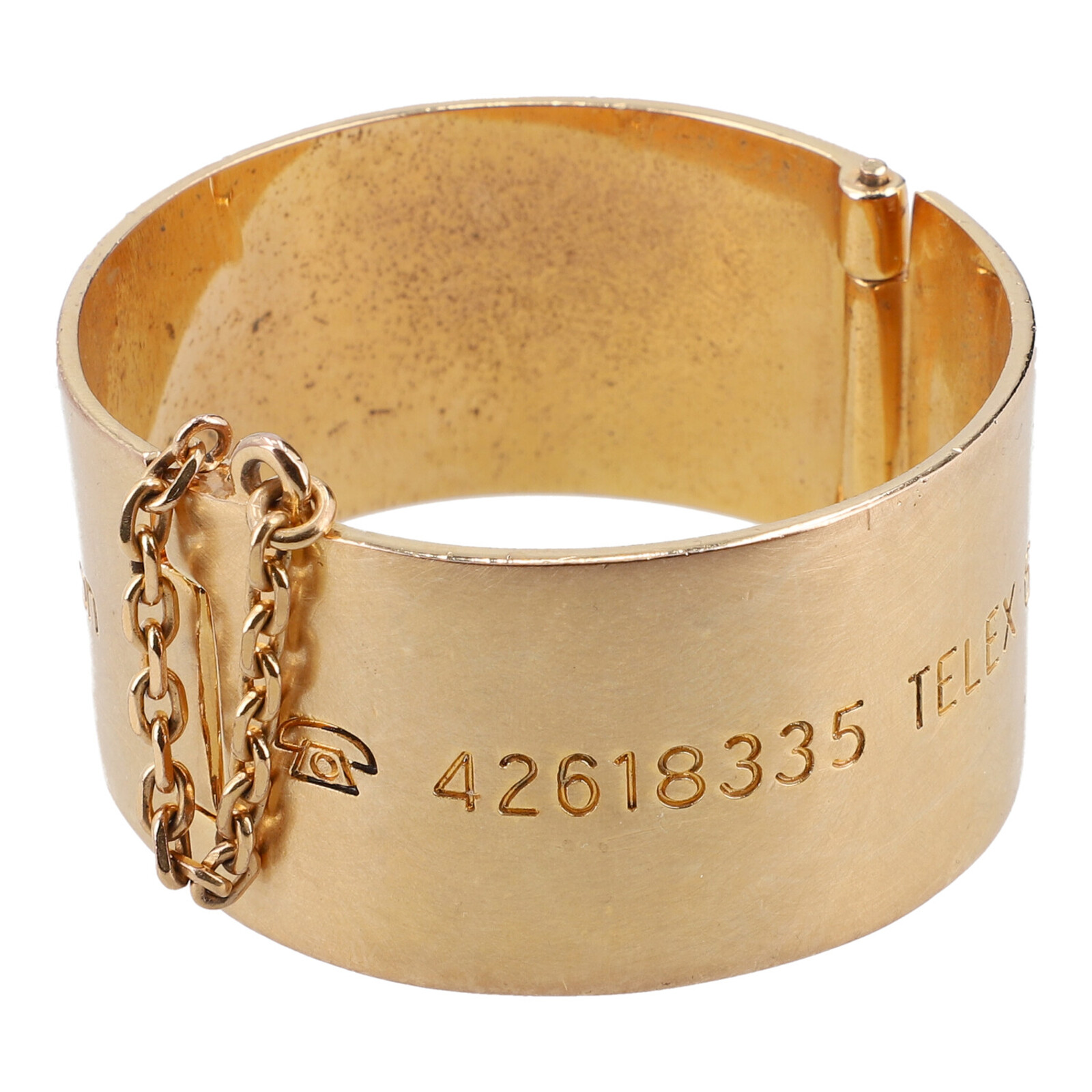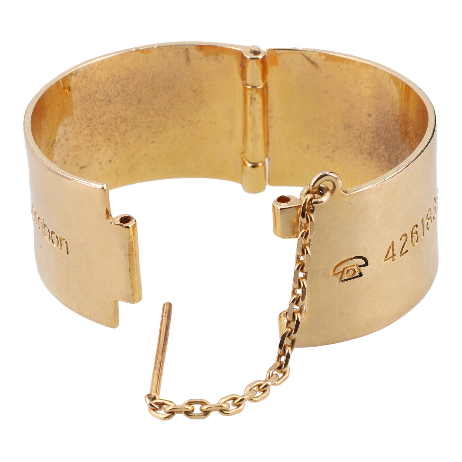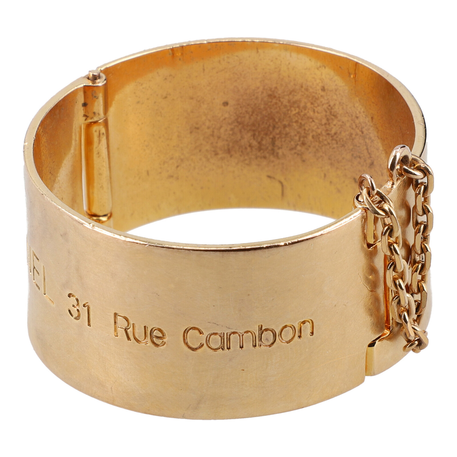 CHANEL Bracciale manchette. 1993. Metallo dorato. Cm 6,00 x 3,10. Bracciale rigido in metallo dorato con chiusura a baionetta. Sulla superficie incisione del marchio Chanel, con indirizzo. Collezione Autunno 1993. Diametro cm 6, h cm 3,1. Condizioni discrete, graffi superficiali, in origine le incisioni erano riempite in smalto nero, oggi scomparso, ne rimane lieve traccia sul simbolo del telefono.