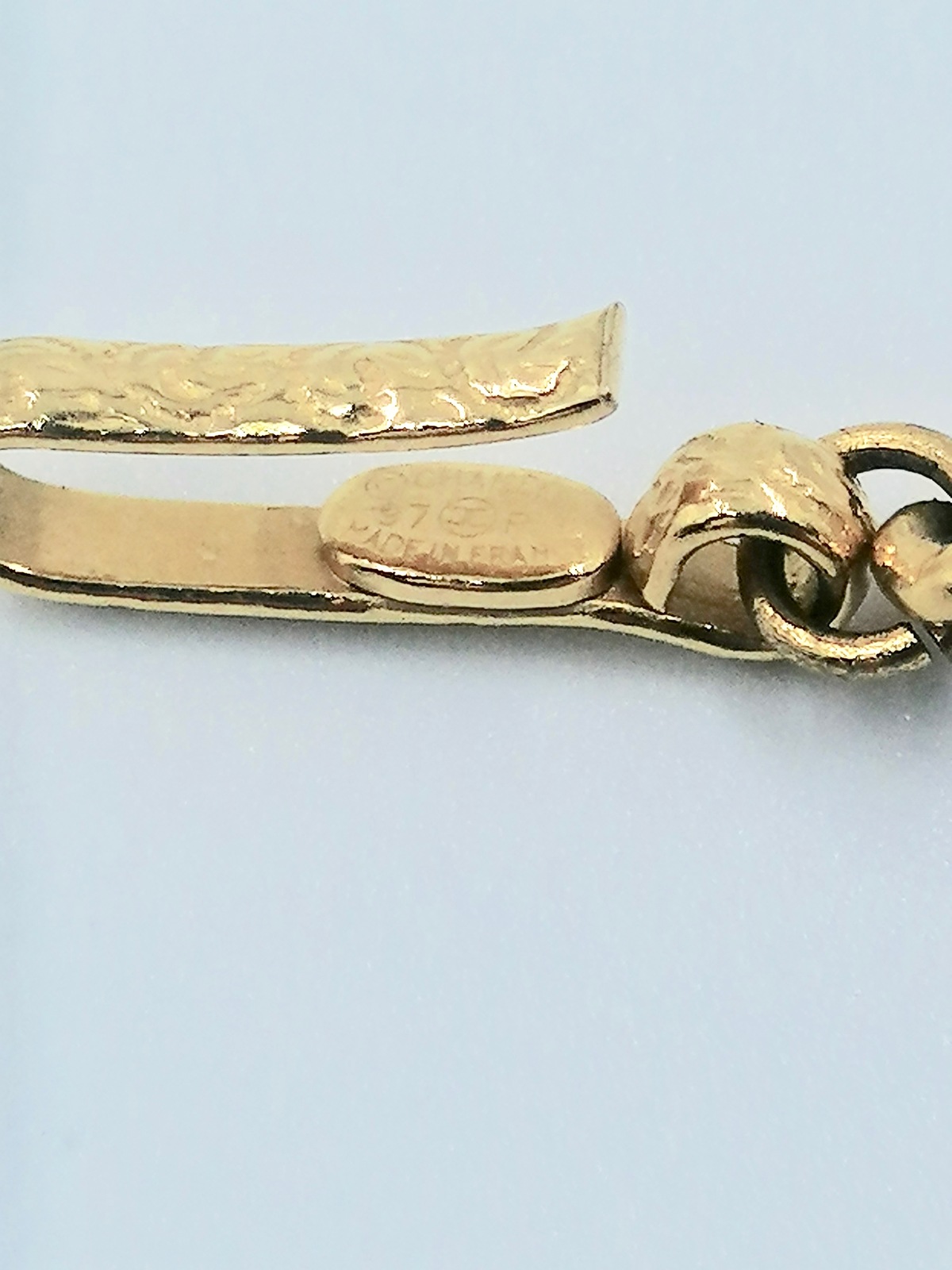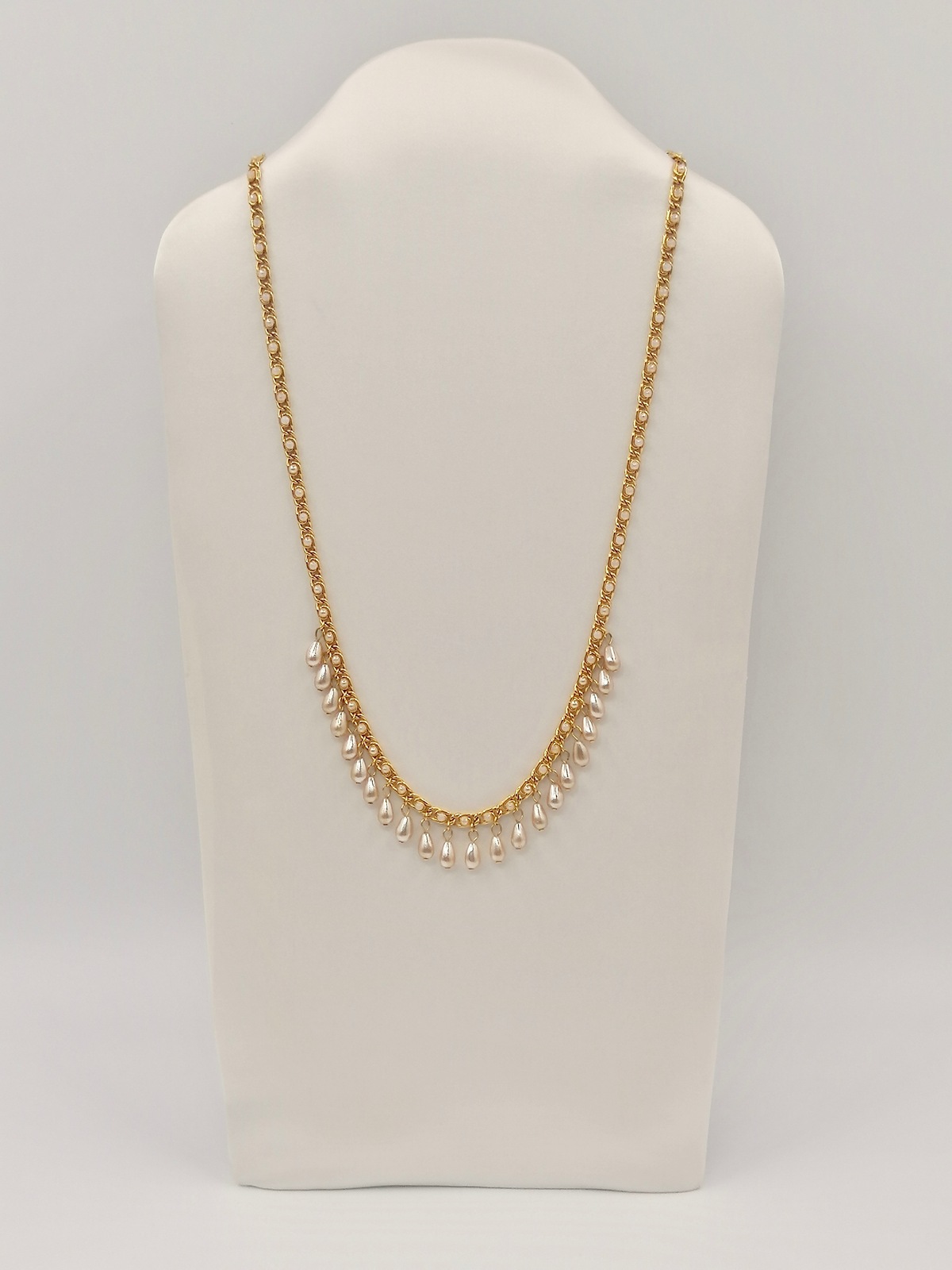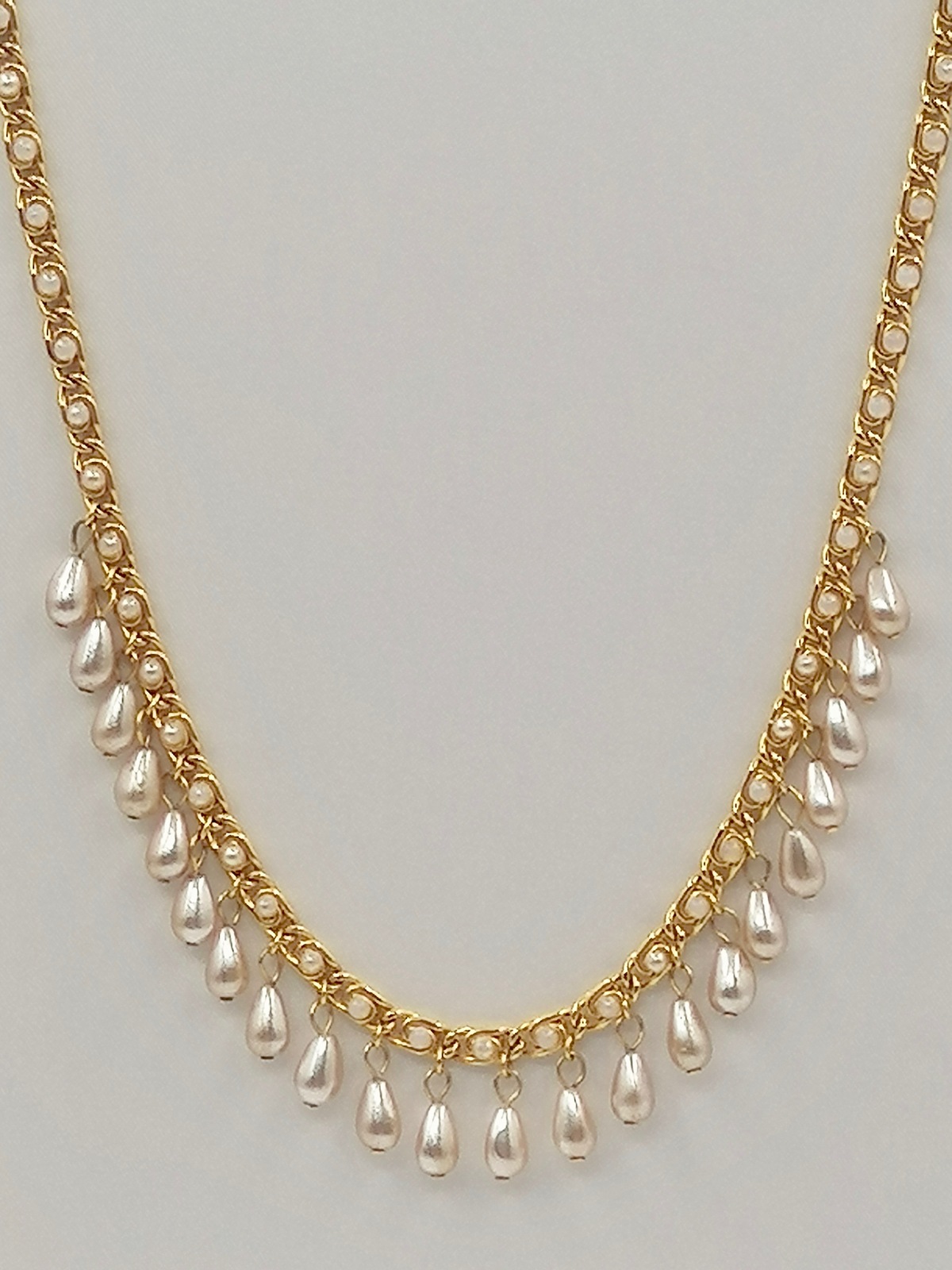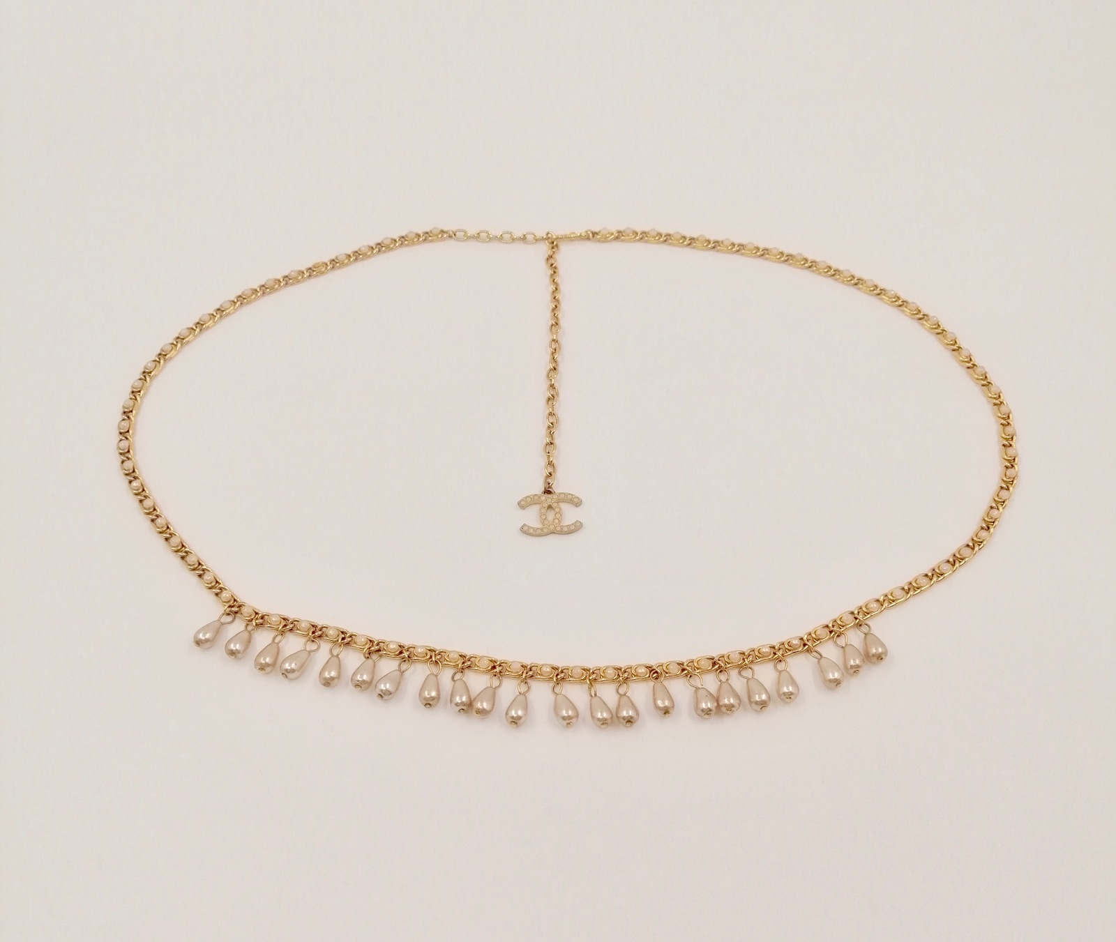 CHANEL Cintura / Collana. 1997. Metallo dorato e perla.. Cm 85,00. Metallo dorato, con applicazione di perline, perle a goccia nella parte centrale, finale con logo. Collezione Primavera 1997. Misura: cm 70 con estensione di cm 15, totale cm 85. Ottime condizioni manca una perlina sulla catena, piccolissimi difetti su alcune perline della catena.