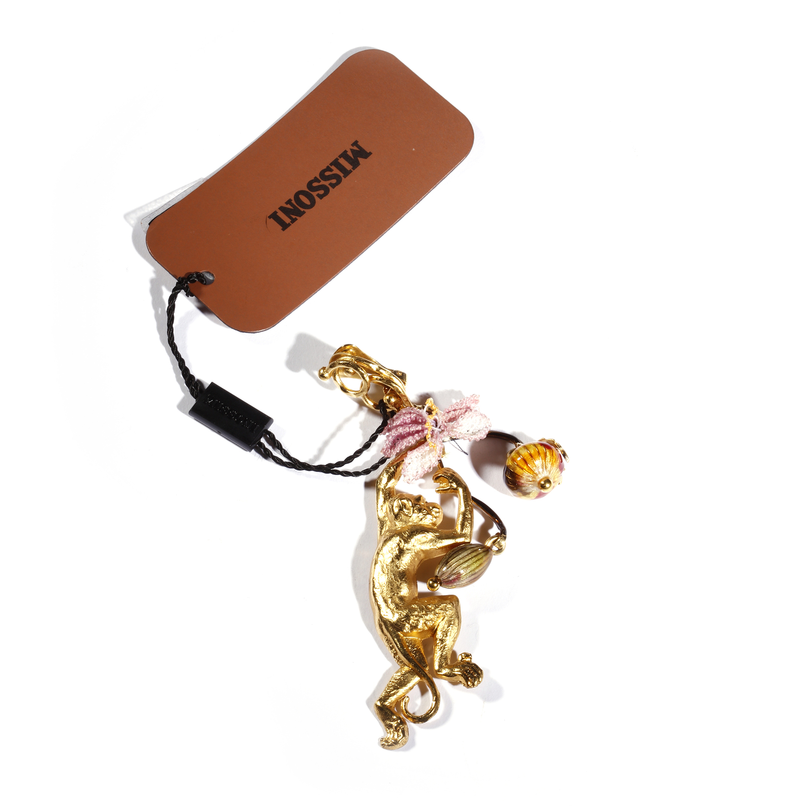 MISSONI Orecchino singolo lungo con scimmietta dorata. Metallo dorato. Cm 3,00 x 12,00. Orecchino singolo lungo a clip Missoni, raffigurante una scimmietta, in metalllo dorato, perline e fiocchetto in tessuto. Etichetta e scatola originale.