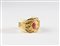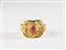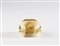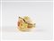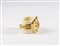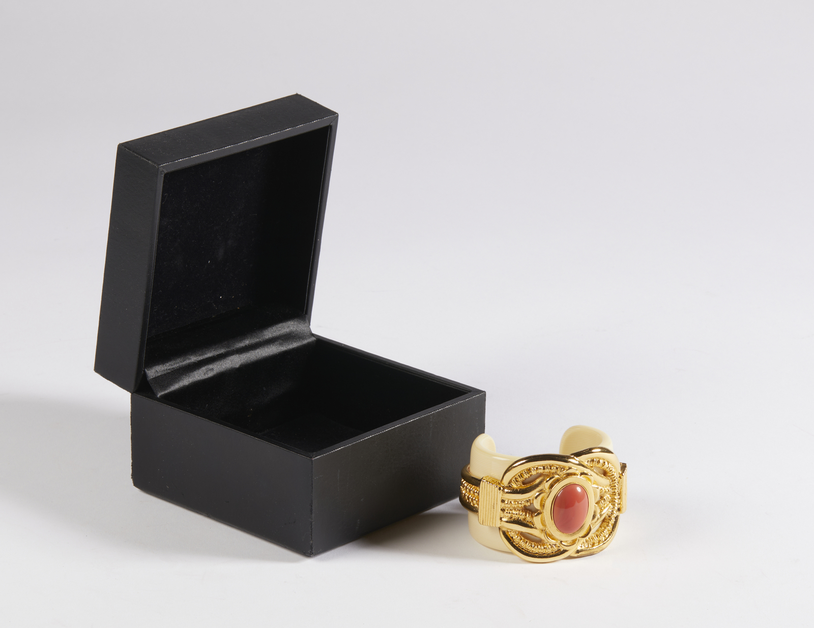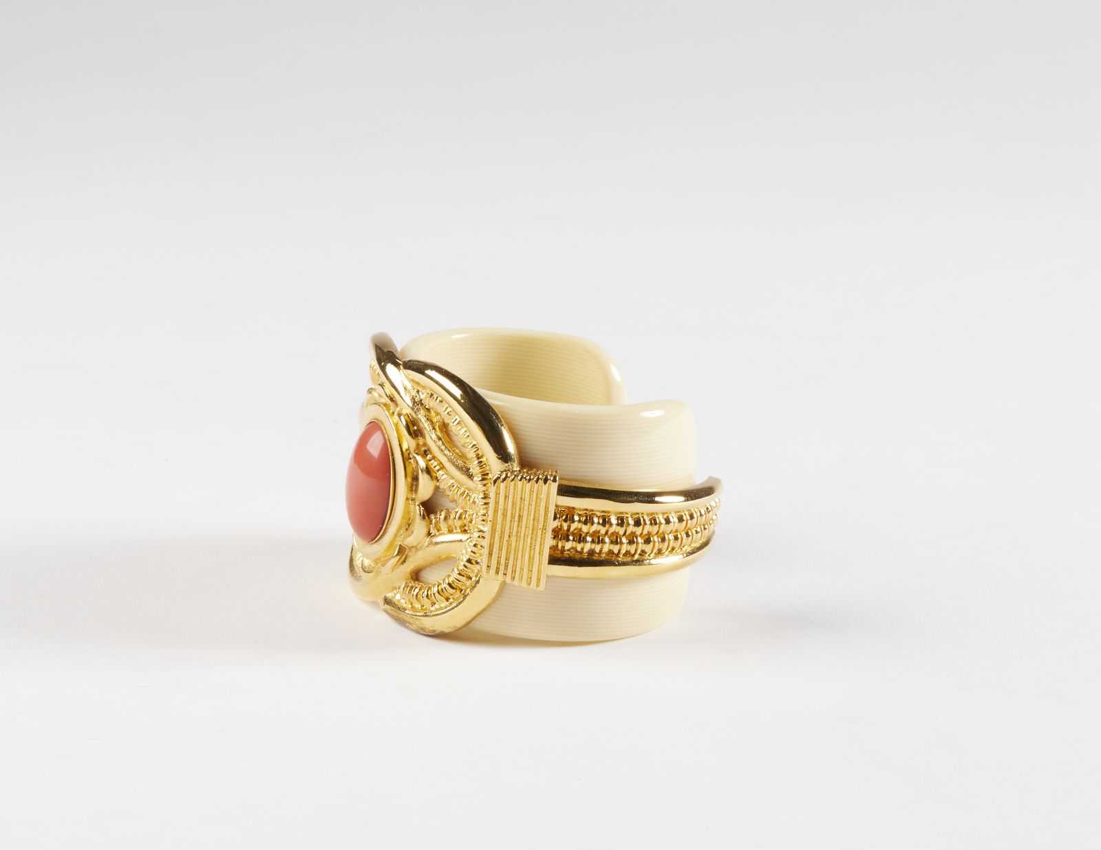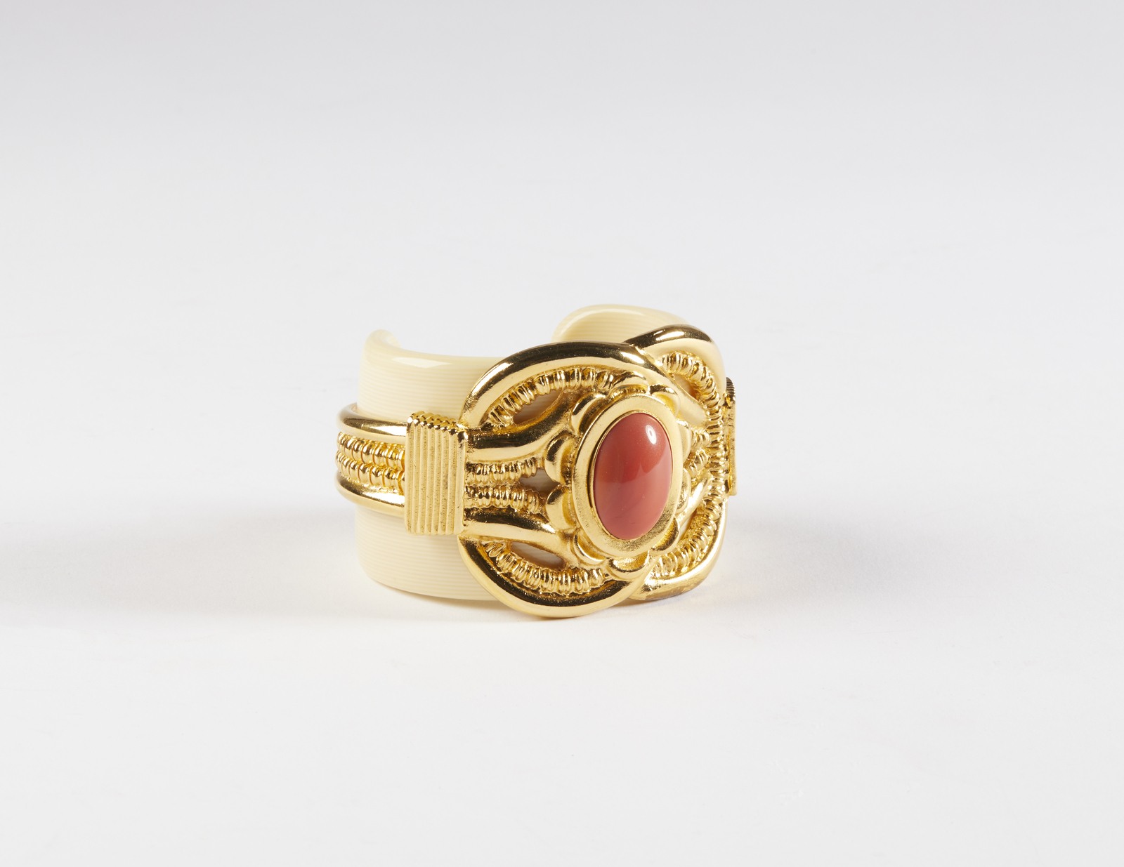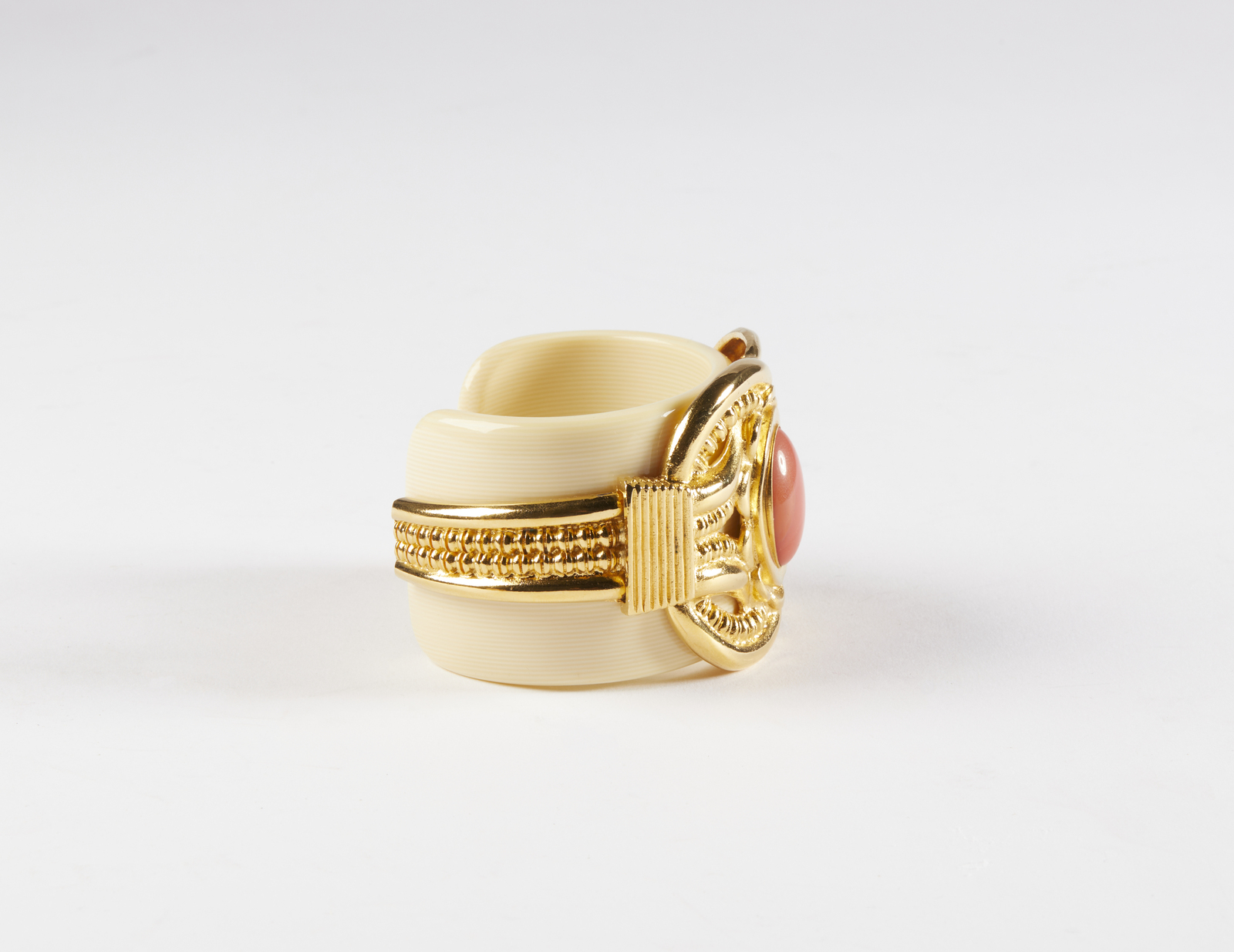 ESCADA Bracciale. Metallo dorato. Cm 8,00 x 5,50. Importante braccialetto rigido a manetta, modello aperto, Escada, logo Escada/ Made in Italy al retro, base in perspex effetto avorio, decorato con metallo dorato lavorato con cabochon centrale effetto corallo. Scatola.