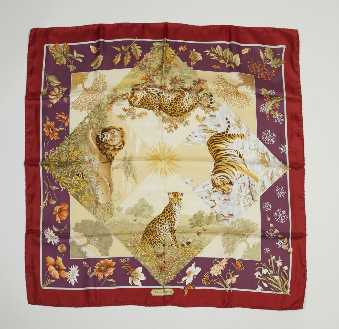 HERMES Foulard fantasia "Grands Fonds". Seta. Cm 90,00 x 90,00. Foulard Hermès vintage , carré in seta, orli profilati a mano, sfondo bianco e rosso, fantasia stampata con disegno di pesci multicolor, "Grands Fonds", disegnata nel 1992 da Annie Faivre. Eccellenti condizioni.