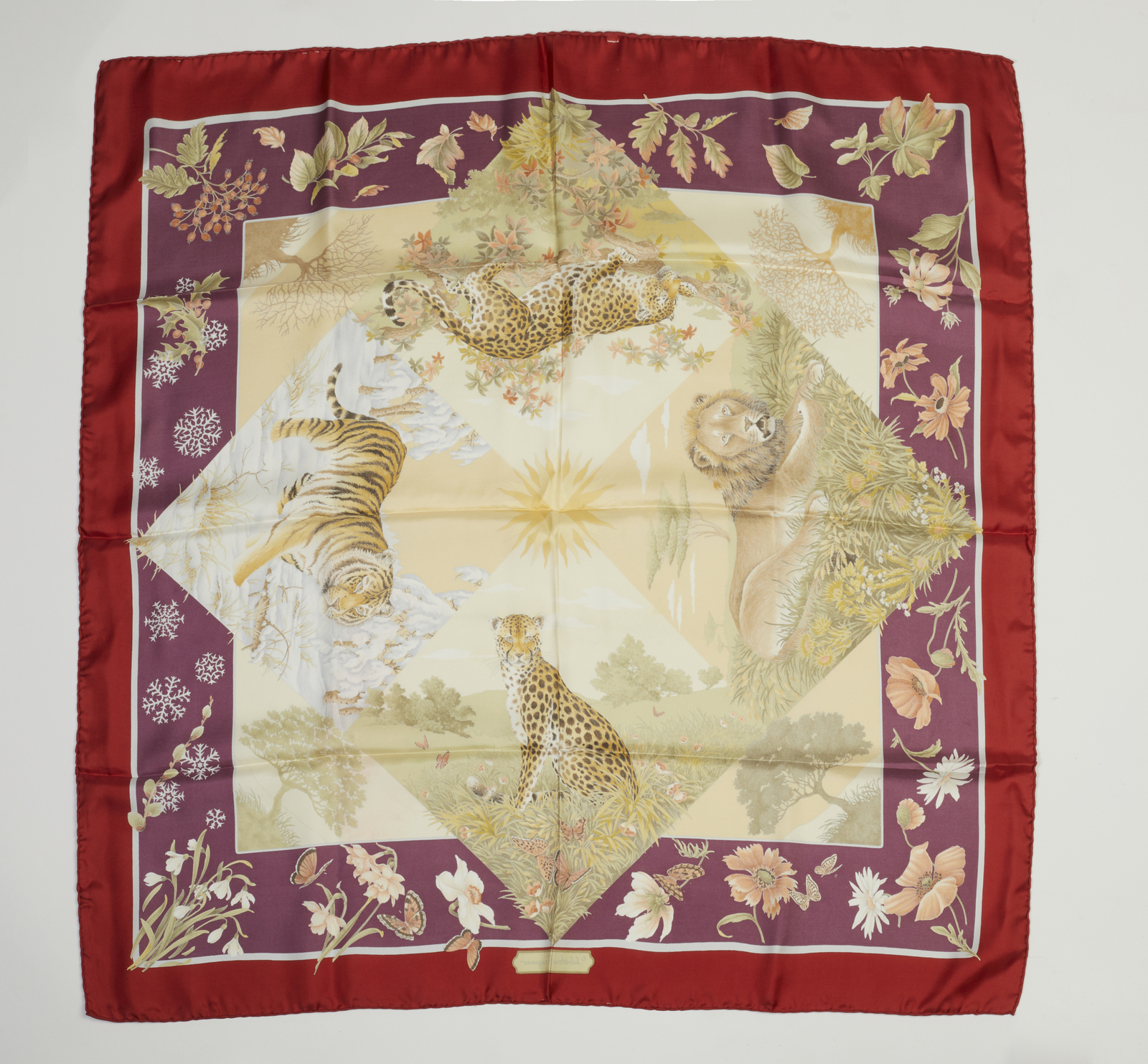 FERRAGAMO SALVATORE Foulard in seta stampata. Seta. Cm 84,00 x 84,00. Iconico foulard carré in seta Salvatore Ferragamo vintage, fantasia animalier, motivi floreali e vegetali a rappresentare le quattro stagioni, bordi color borgogna. Logo Salvatore Ferragamo stampato. Condizioni eccellenti.