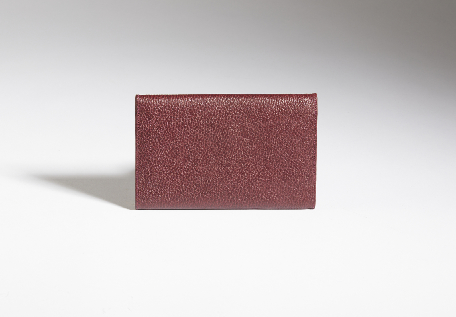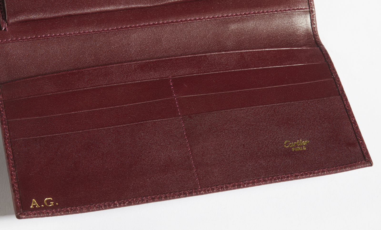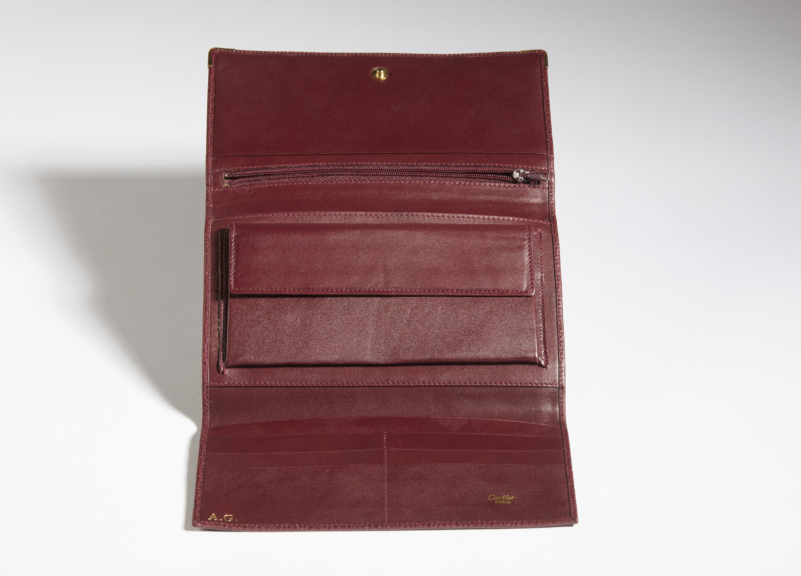 CARTIER Portafoglio in pelle bordeaux. Pelle. Cm 20,00 x 13,00 x 1,50. Ampio portafoglio in pelle martellata color bordeaux Cartier vintage, logo impresso sul fronte, angoli in hardware dorato, chiusura a pressione. Tache interne aperte, una tasca chiusa da zip, uno scomparto con taschine porta carte. Logo Cartier Paris in caratteri dorati all'interno, iniziali A. G. in caratteri dorati. Eccellenti condizioni.