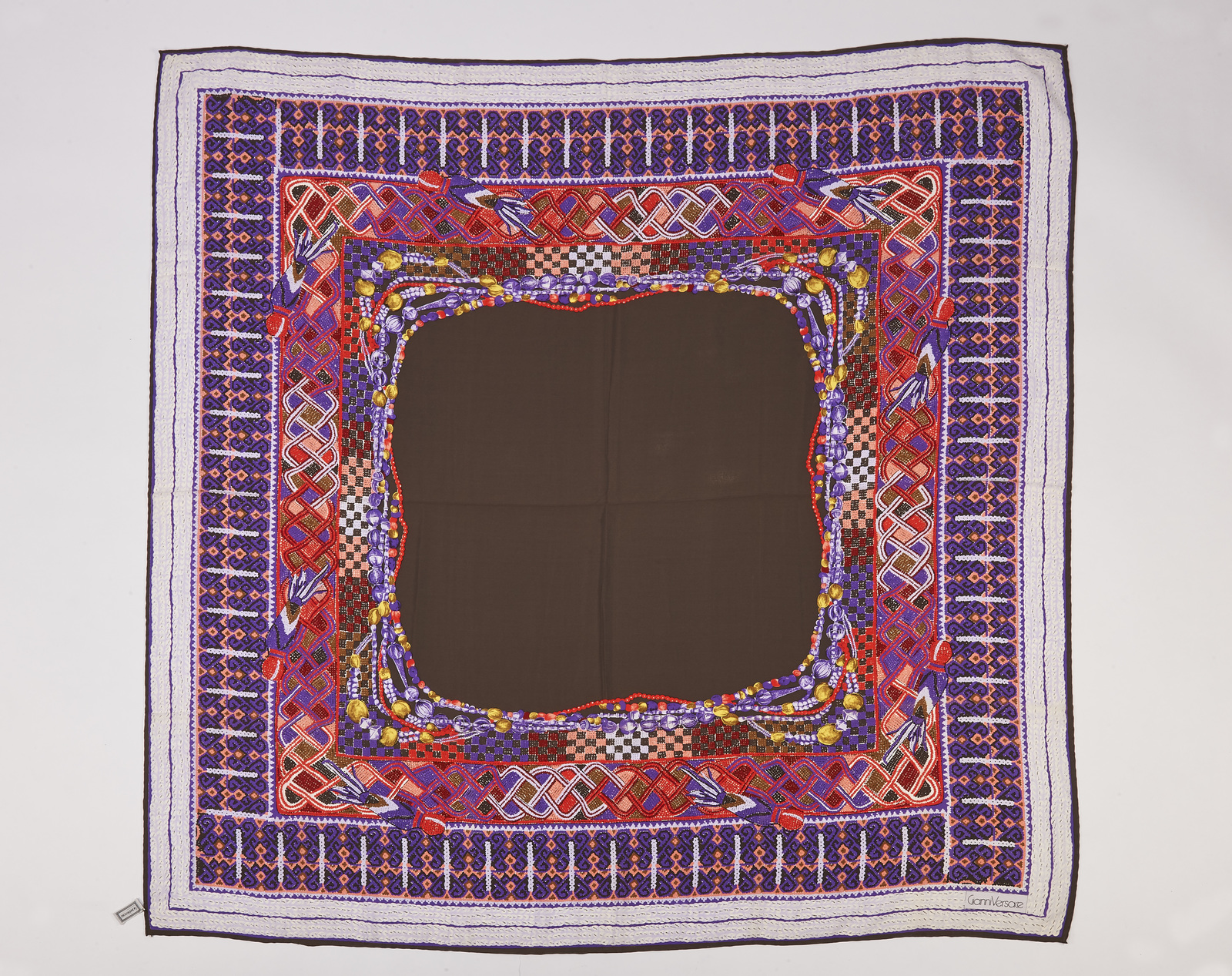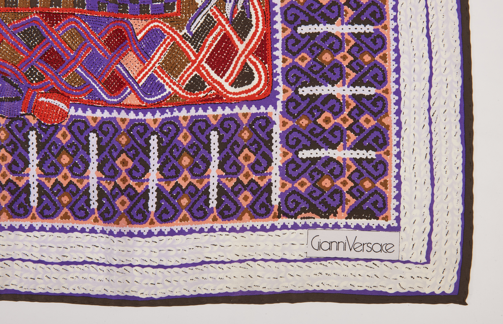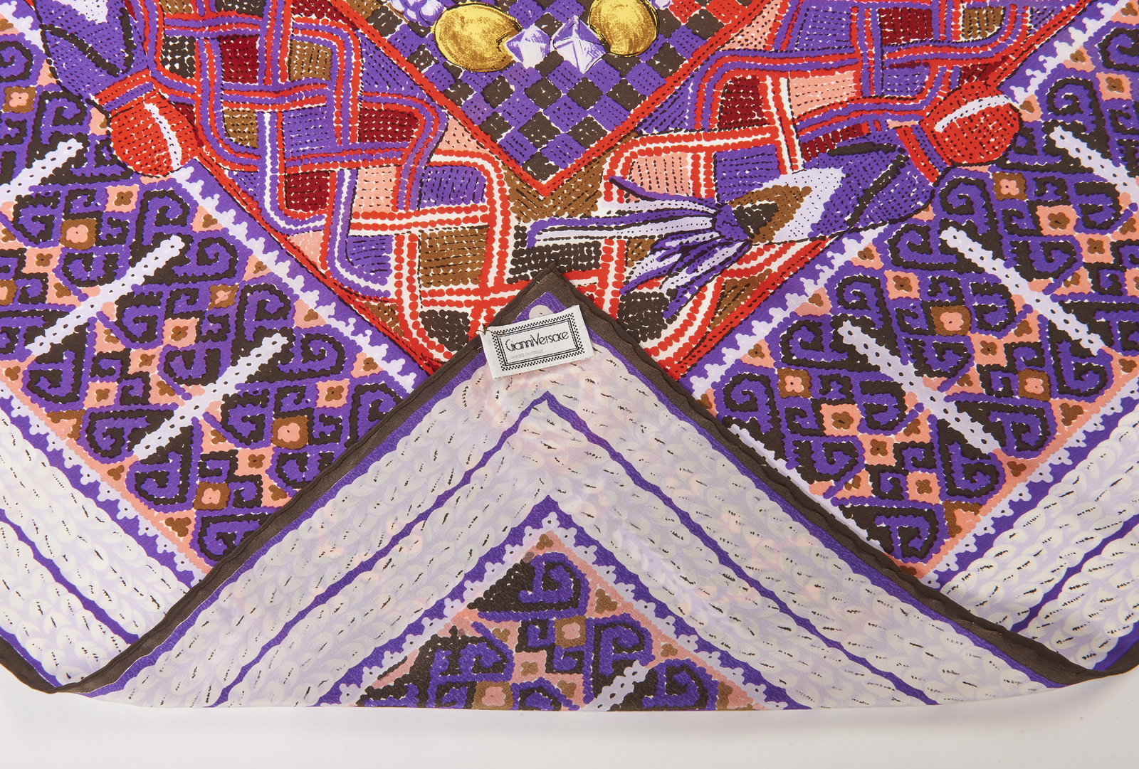 VERSACE GIANNI (1946 - 1997) Foulard in seta stampata. Seta. Cm 130,00 x 130,00. Grande foulard carré in seta stampata Gianni Versace vintage, nei colori del viola, riserva color verde muschio al centro, fantasia di greca, motivo intrecciato e perline effetto micromosaico, firma Gianni Versace in un angolo, fine anni '80.