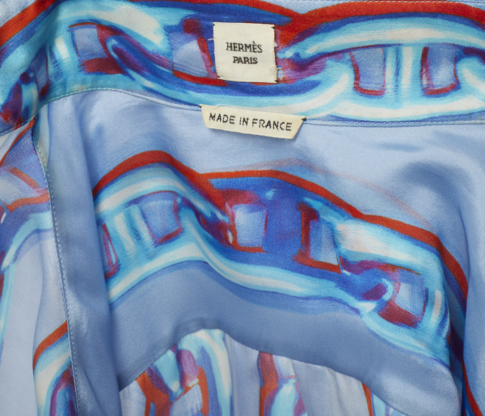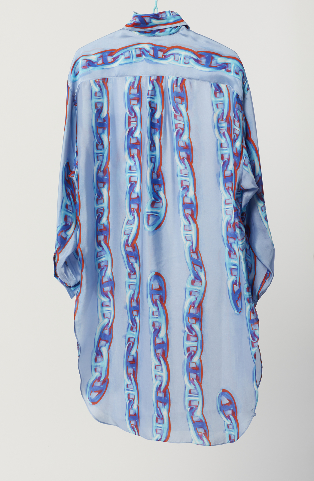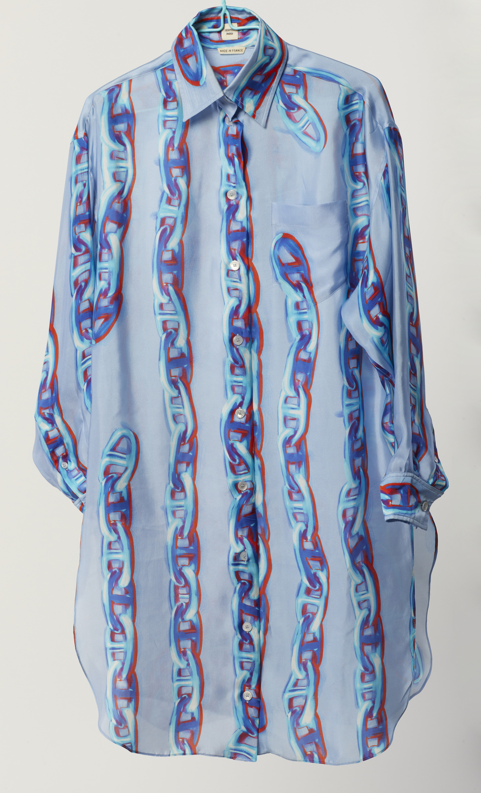 HERMES Camicione in seta stampata azzurra. Seta. . Camicione in seta azzurra stampata con motivo Chaines d'Ancre, a maniche lunghe, etichetta Hermès/ Paris, Made in France. Taglia 38 FR, IT 42.