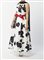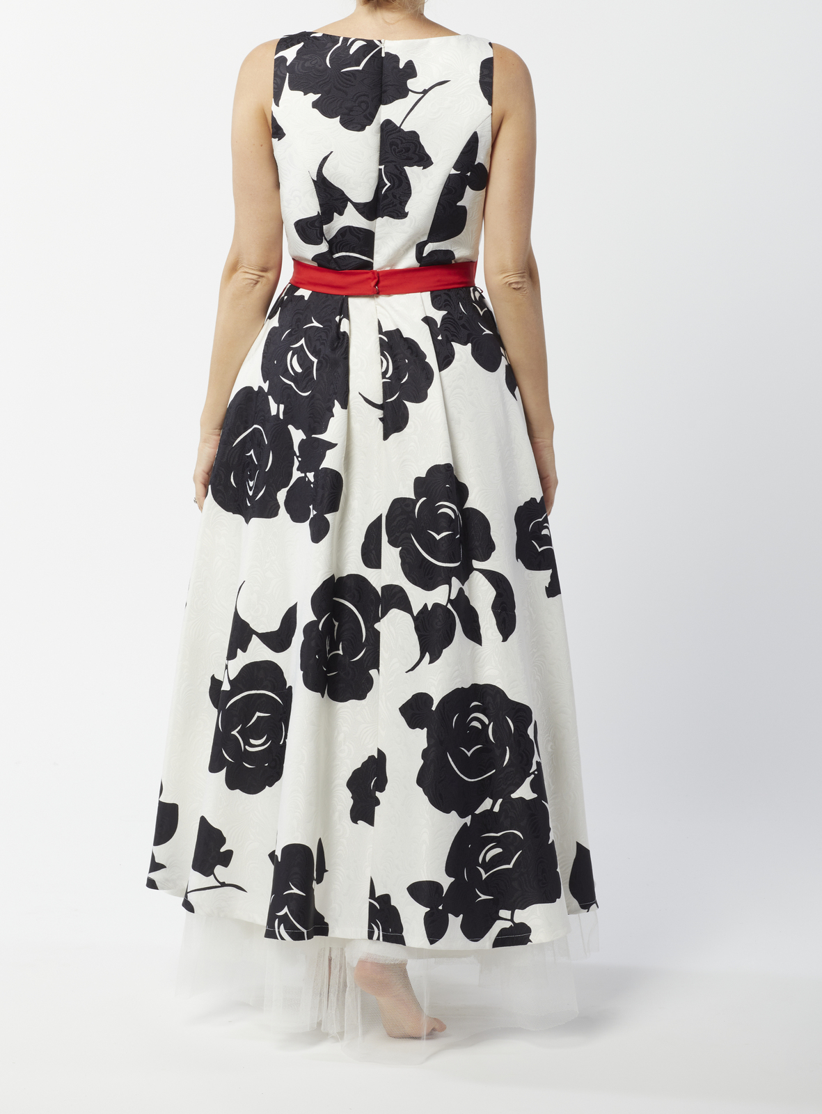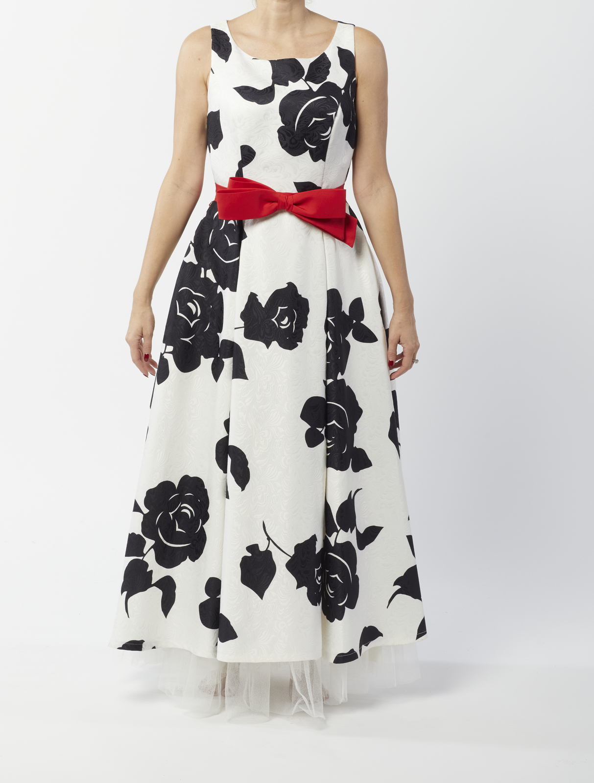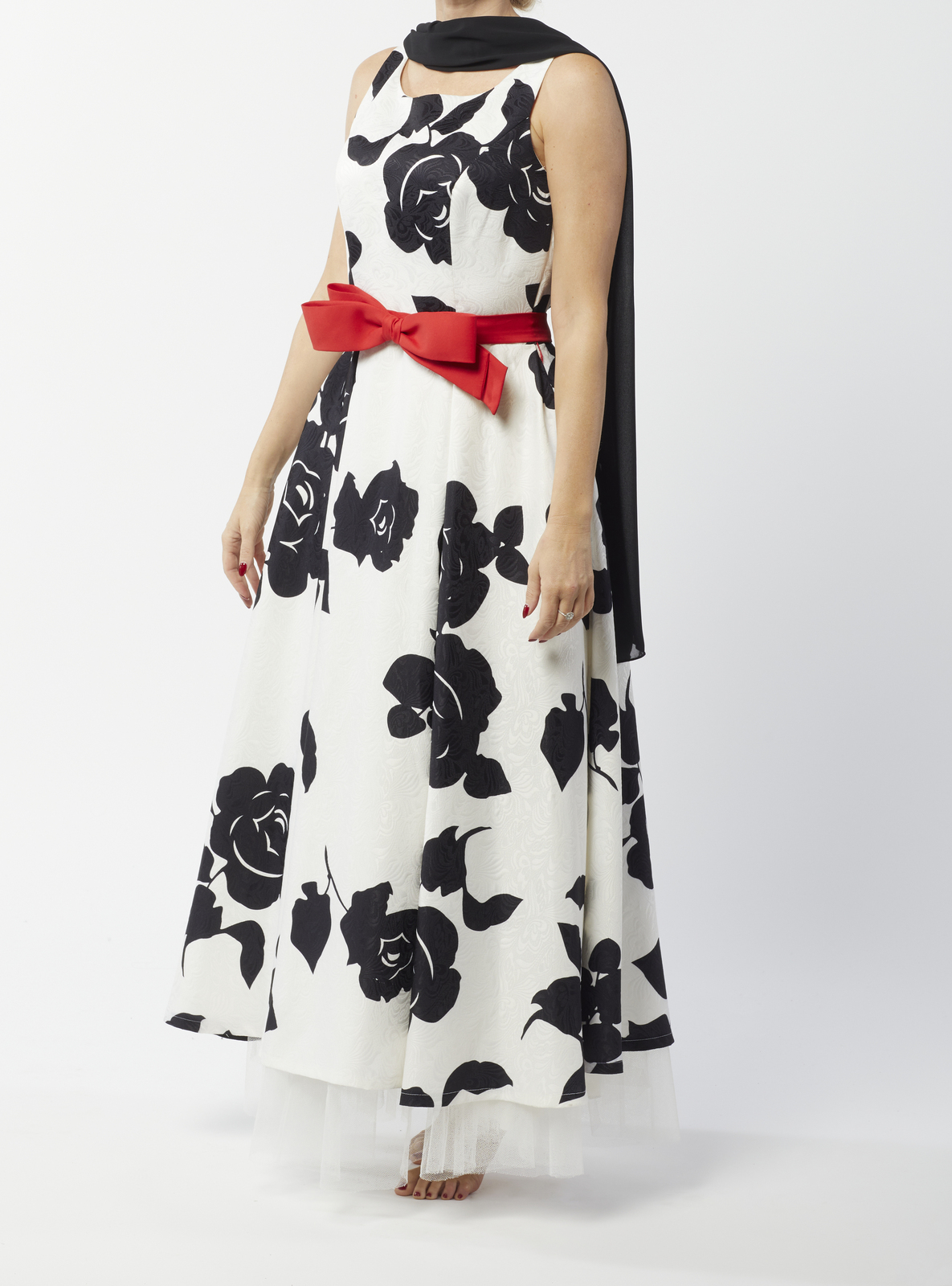 VIVIEN Abito fantasia bianco e nero. . . Elegante abito in stile anni '60, in tessuto stampato a motivo di rose nere su fondo bianco, cintura rossa alla vita, balza finale interna in tulle bianco, sciarpa in tessuto nero, senza maniche, zip al retro, etichetta Vivien, taglia 42 IT.